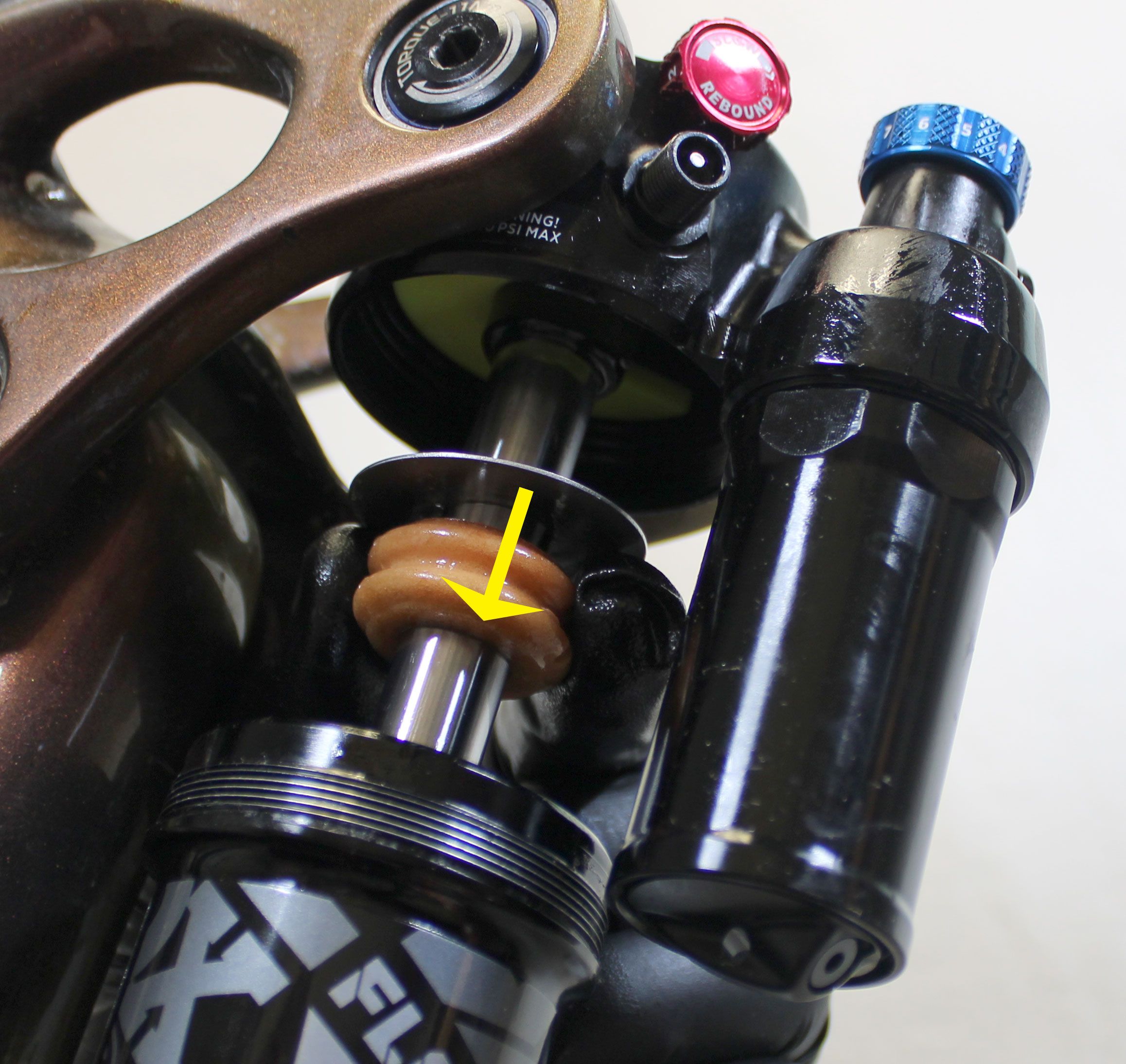 Remove the air volume spacer by unclipping the two halves from each other. Coat the air seals in a thin film of Slick Honey then reinstall the outer air sleeve with the air valve side first. Rotate the outer air sleeve until the tab on the eyelet aligns with the notch in the outer sleeve. Slide the outer air sleeve all the way to the negative air sealhead to engage the air seals. Reinstall the wire retaining ring making sure that it is fully seated in its groove.