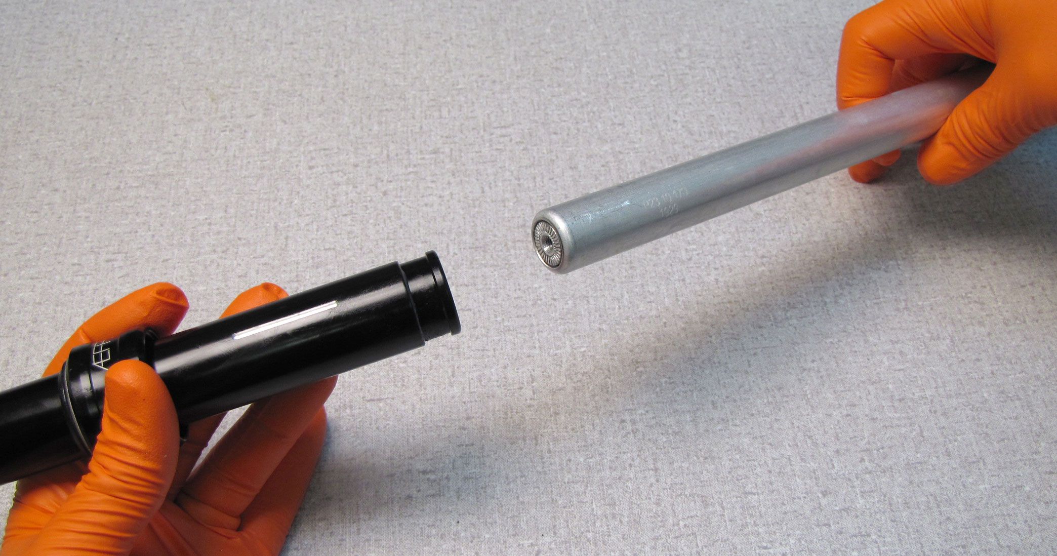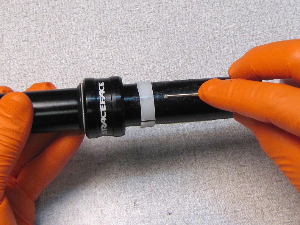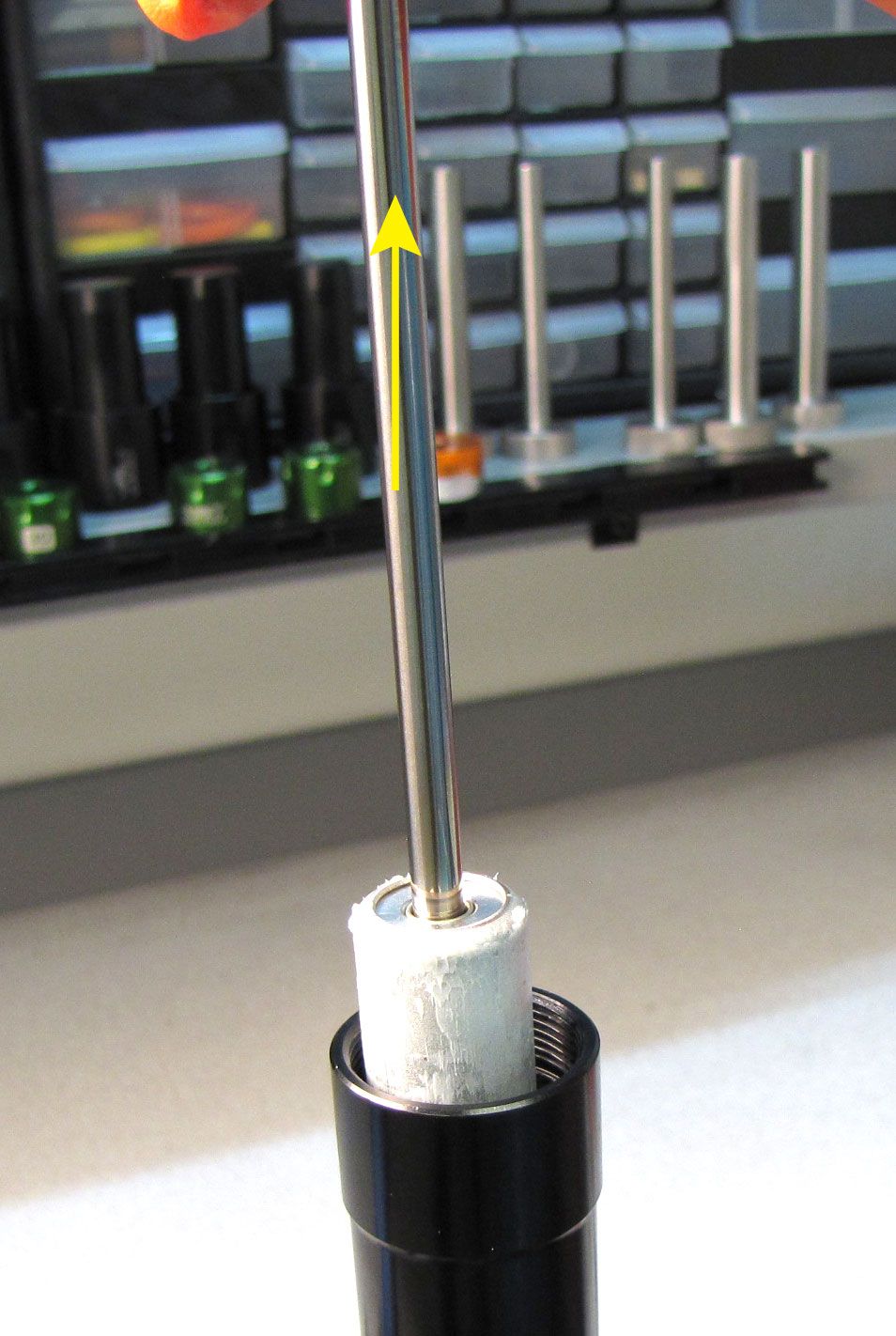 Remove the Push Rod by pulling it up and out of the Cartridge Shaft. Note the orientation of the rod's rounded and squared ends. Remove the Cartridge from the seatpost by pulling it up.
