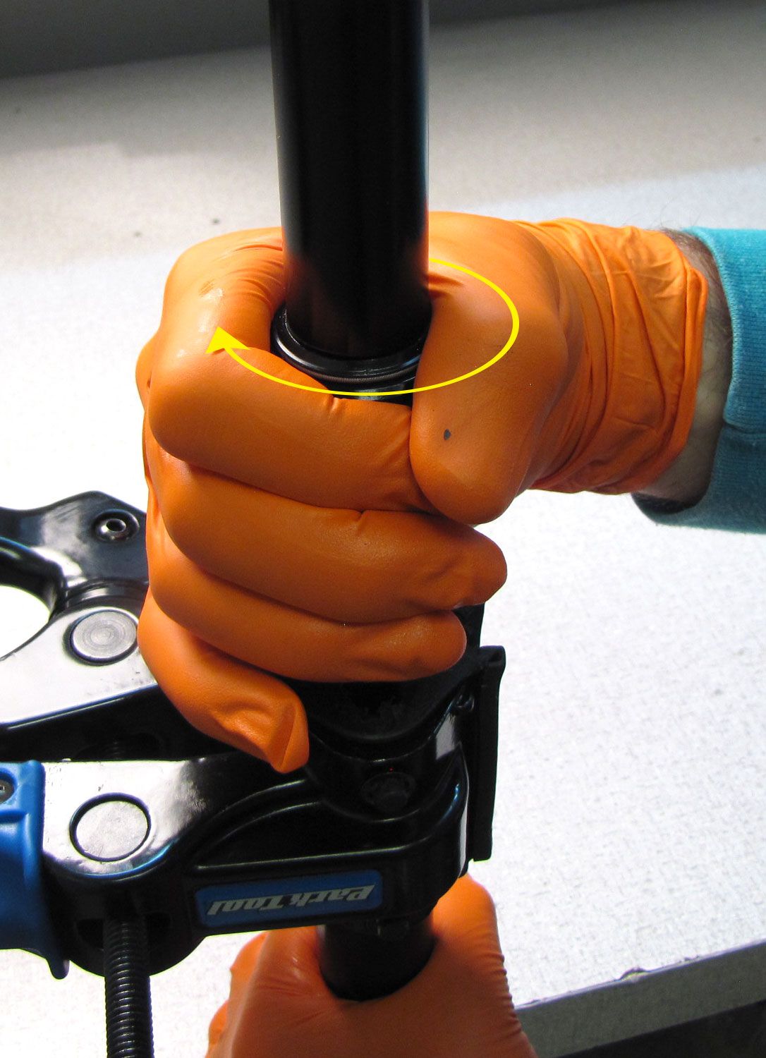 Clamp the Lower Post into your clean bike work stand then tighten the Lower Post Collar clockwise until hand tight.