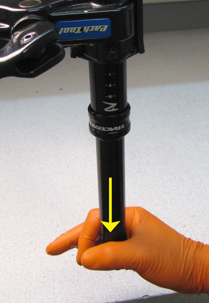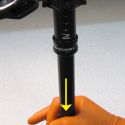 Insert a 5mm hex wrench into the Actuator Assembly where the cable barrel would rest. Actuate the post by pulling up on the wrench while pushing down on the Actuator Assembly. This allows for the seatpost cartridge to compress. Compress the seatpost cartridge approximately 20mm by pushing down on the shaft while actuating the post as shown.