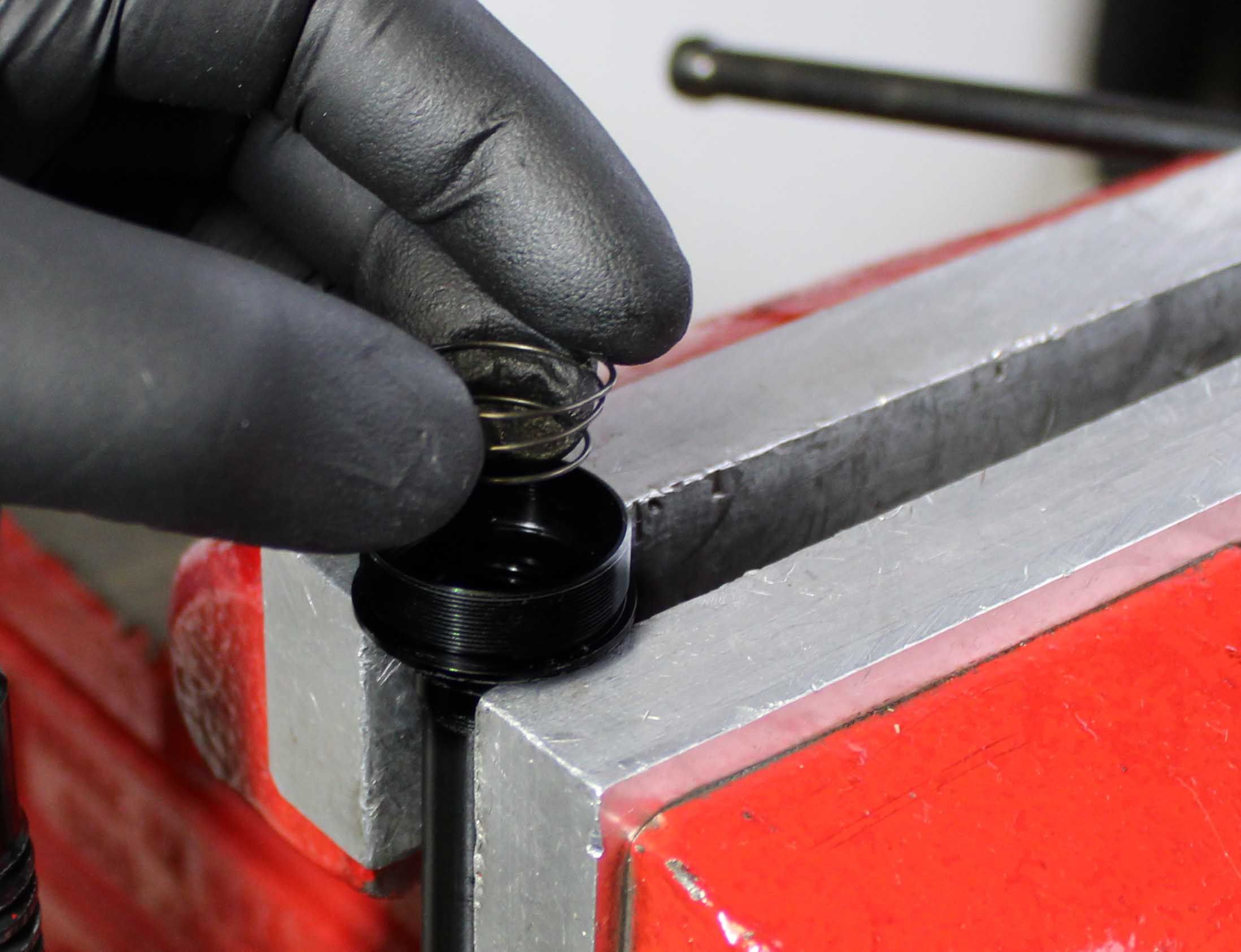 The topcap Assembly must be installed directly in line with the Pressure Tube to ensure that the O-ring is not pinched. Slowly push the Topcap Assembly into the Pressure Tube. Tighten the topcap clockwise into the pressure tube with your topcap socket (Park tool FR-5 or FR-5.2 for 32mm TC forks) to 55 in-lb torque. Slowly cycle the damper through it's full travel over your waste oil basin to purge any excess damper oil.