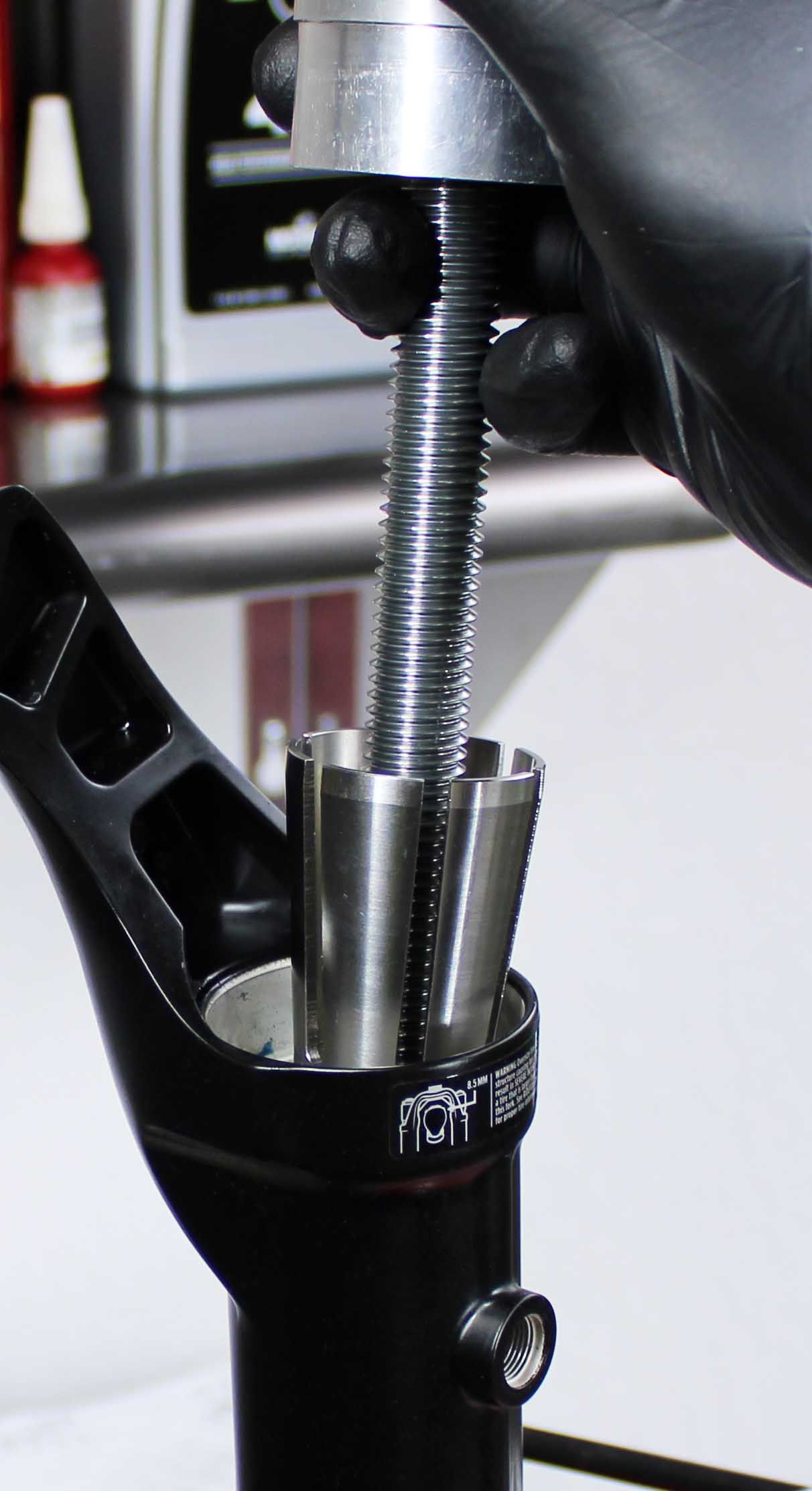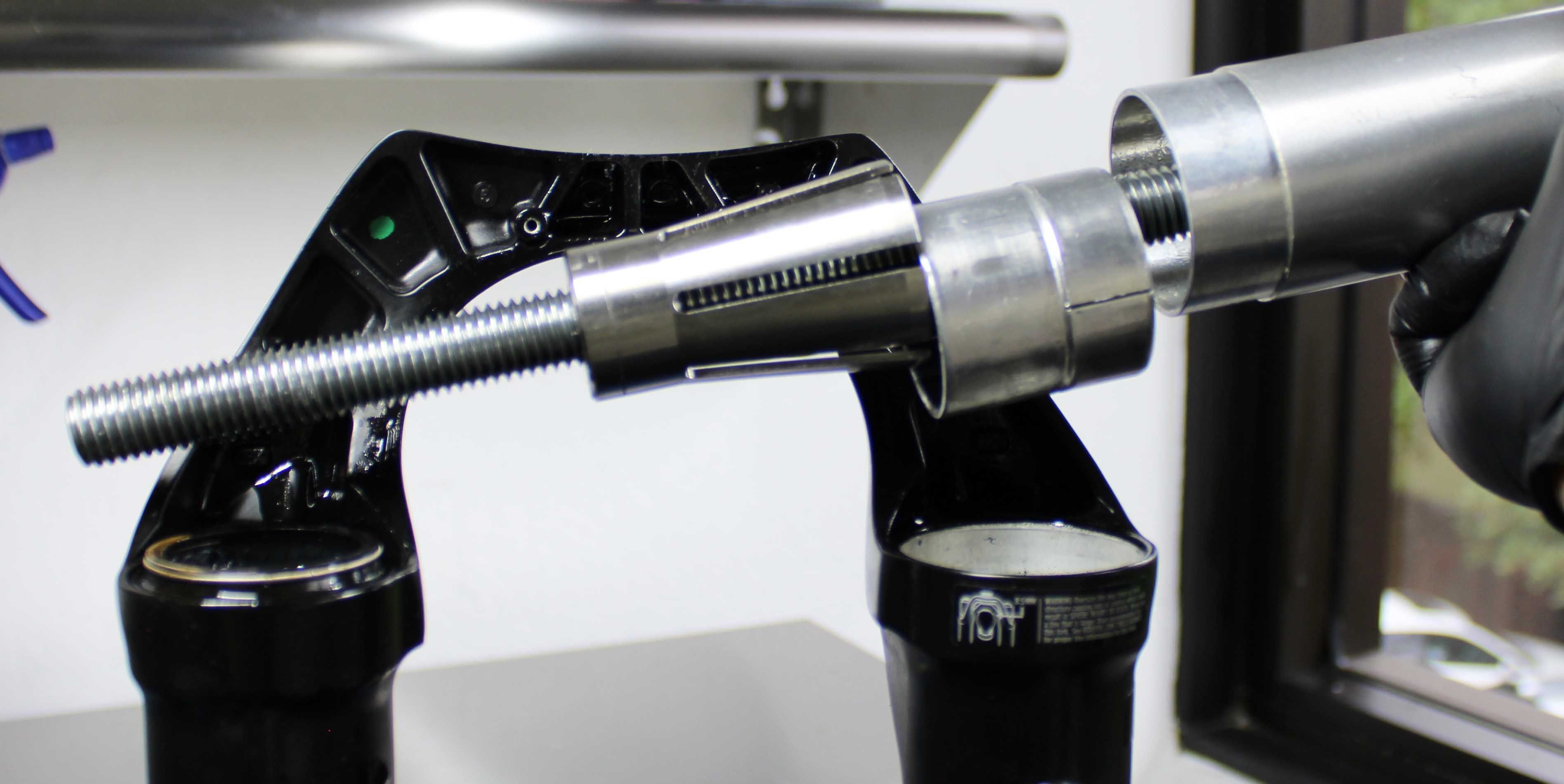 Install the correct Installation Tip and Guide Ring based on the Fork family. The Installation Tip and Guide Ring are engraved with fork family. Install Guide Ring first (with the small diameter end closest to the installation Tip), then the Installation Tip. Use a 8mm allen to tighten the M10 screw until the Installation Tip is sercured into the shank.