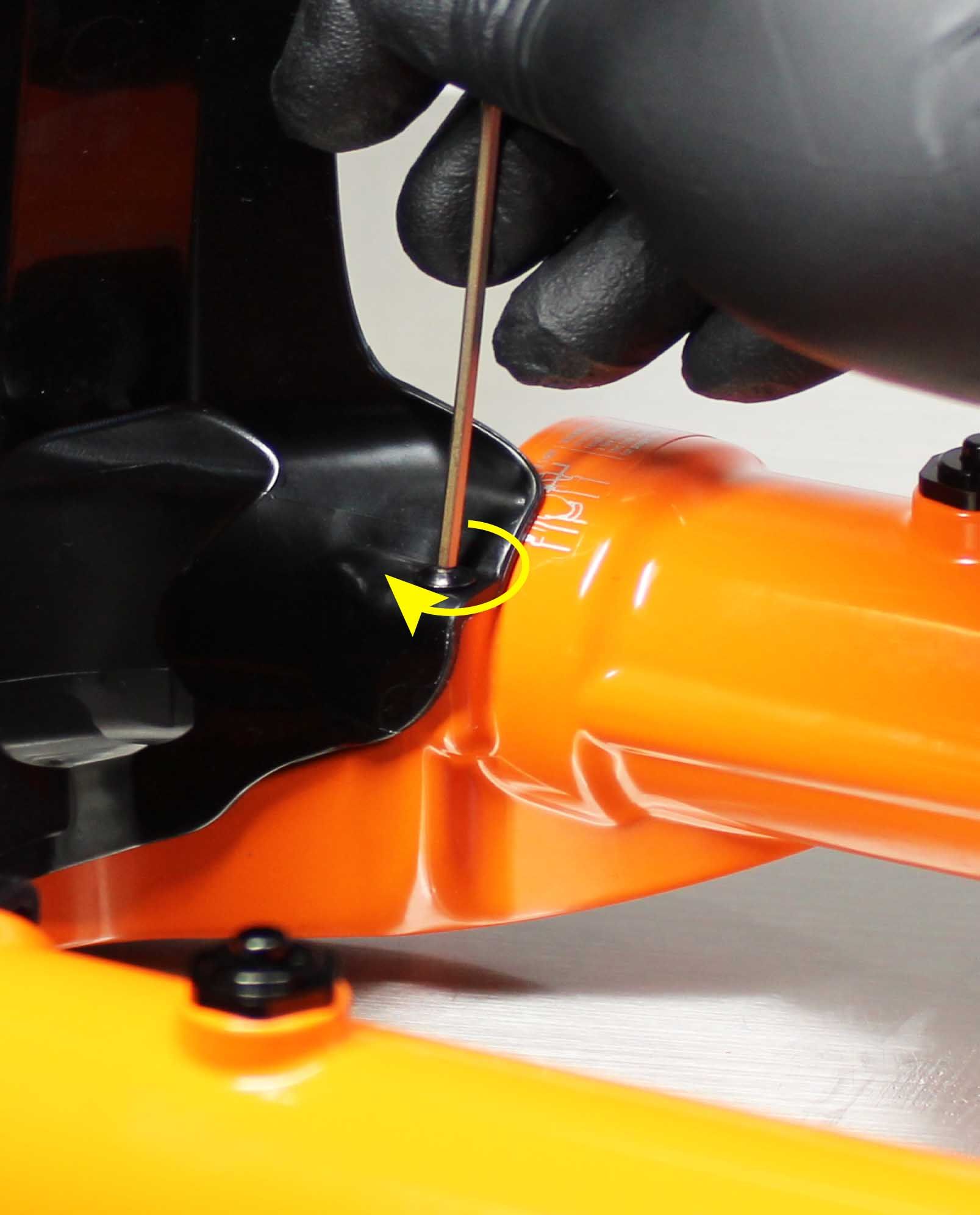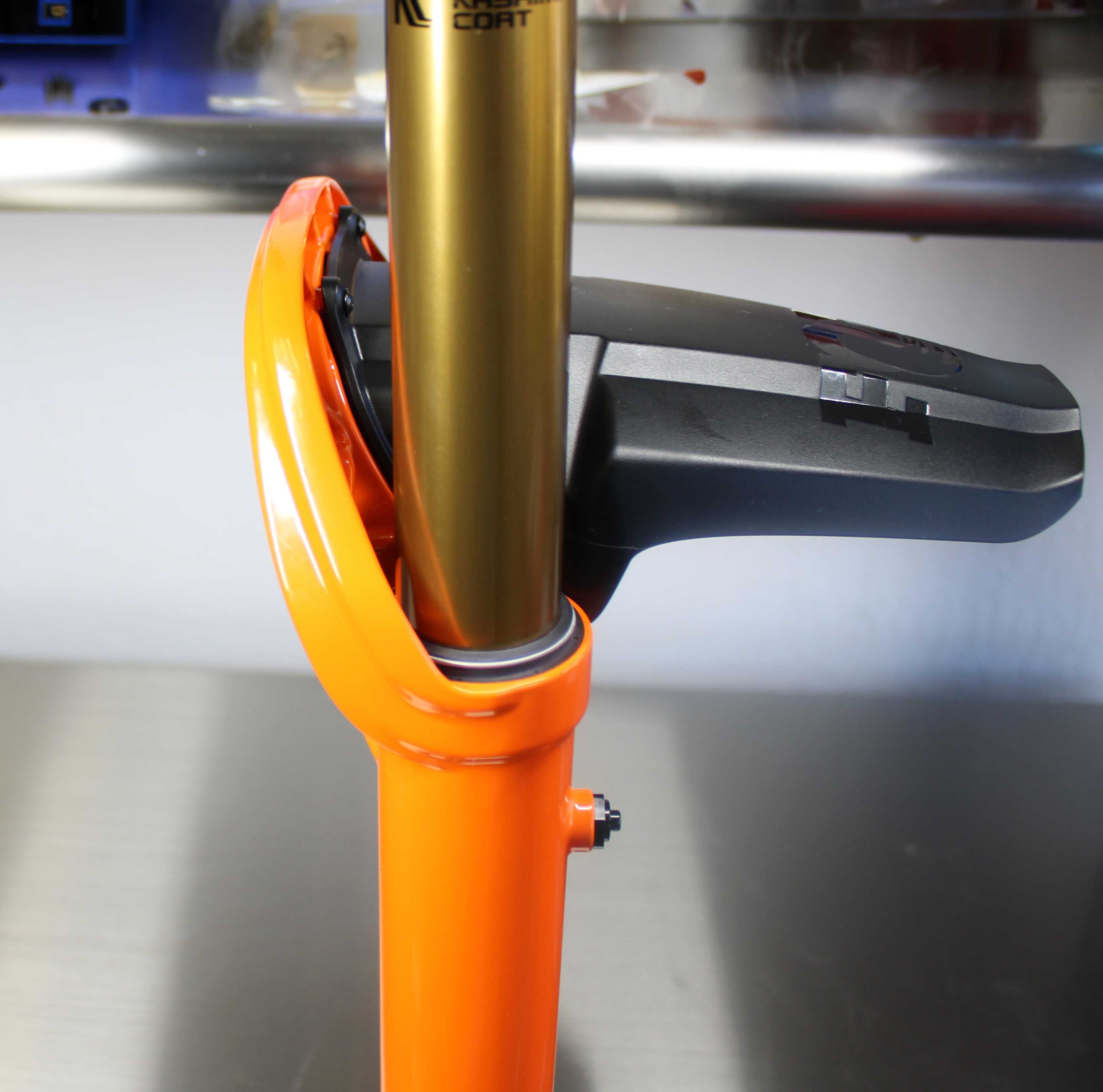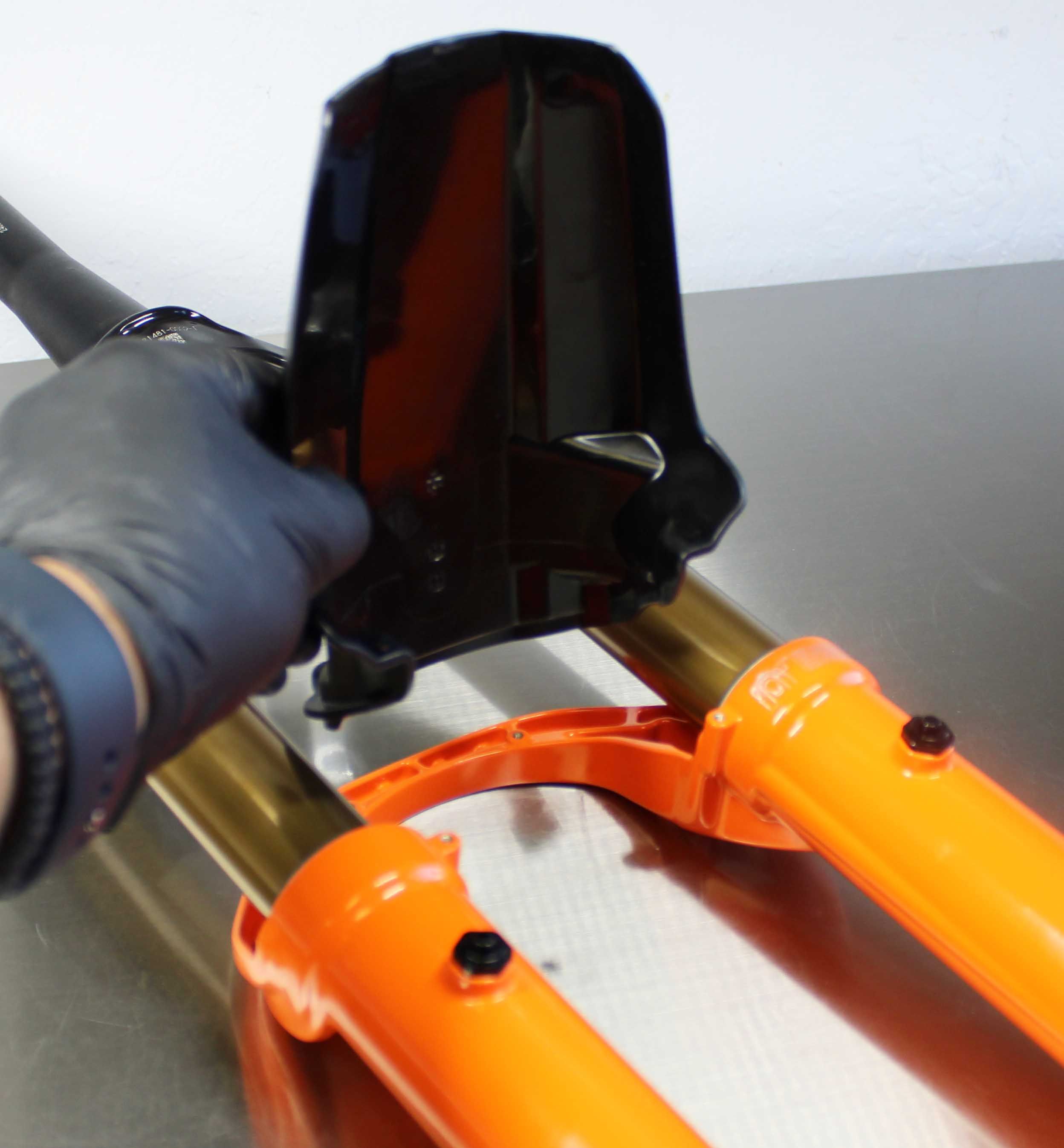 Position the front of the fork facing down on a clean work surface. Position the Mud Guard in place so the mounting holes align with the threaded holes in the back of the lower leg brace.