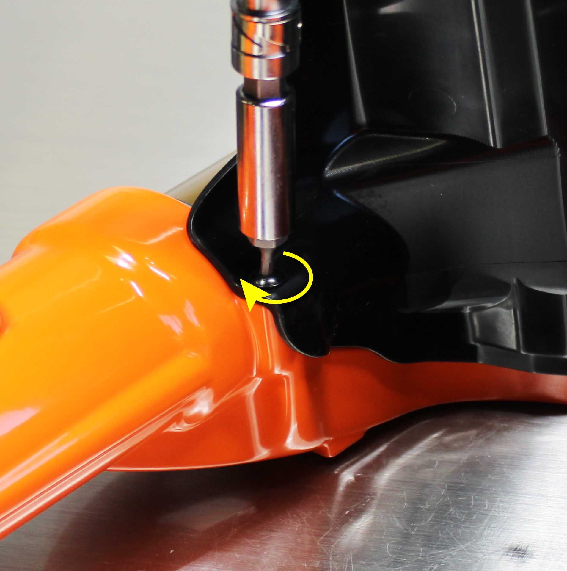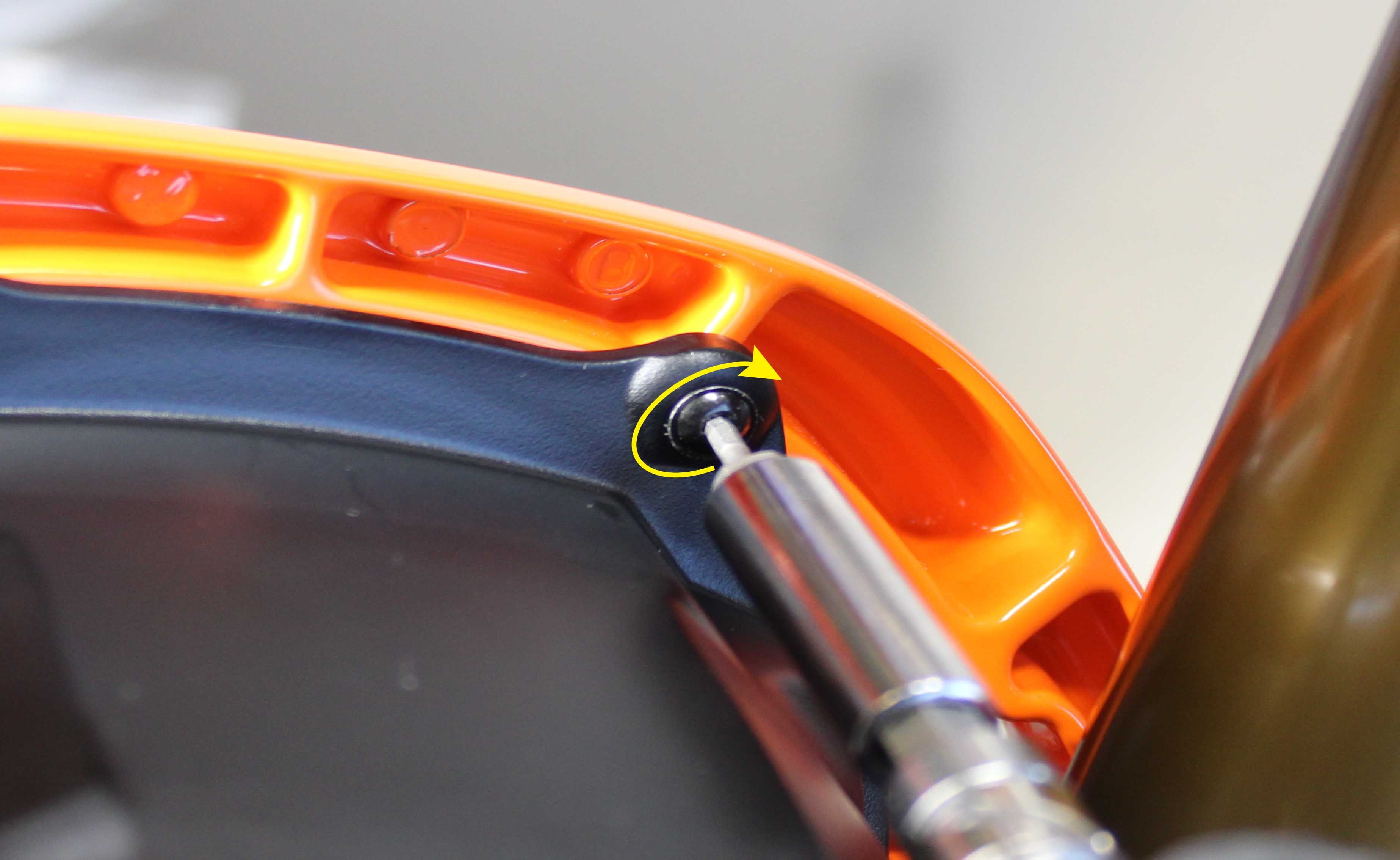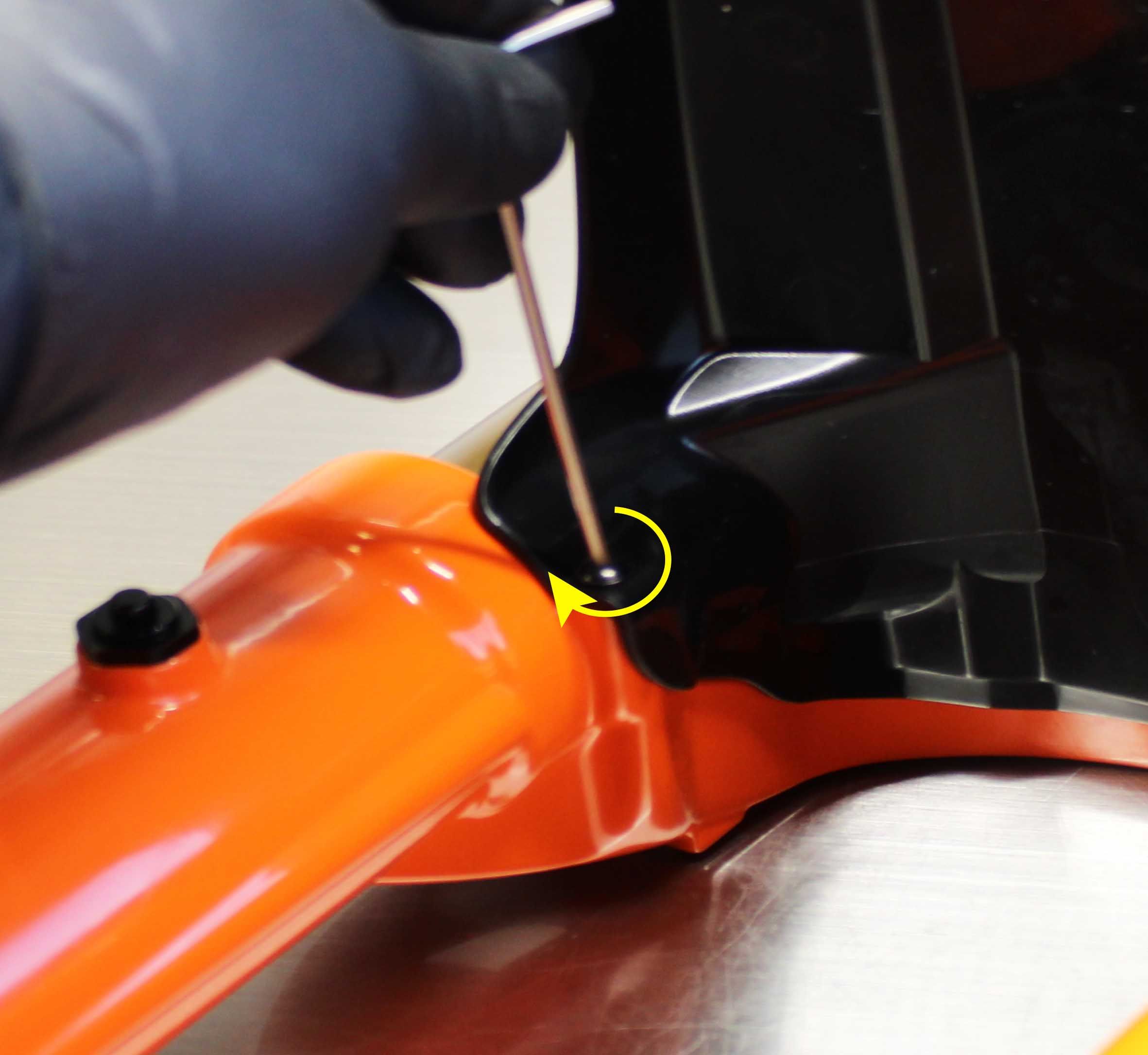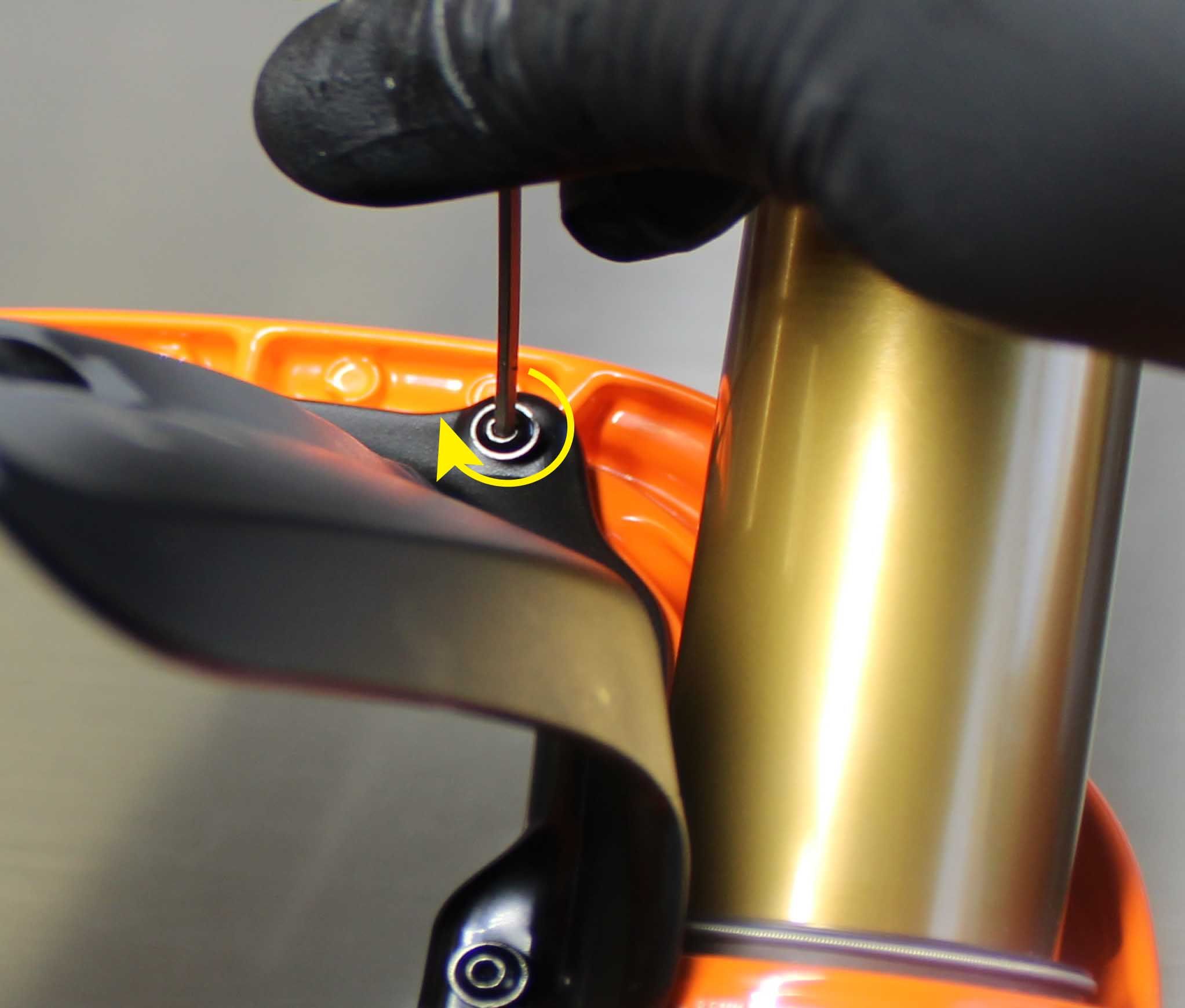 Position the front of the fork facing down on a clean work surface. Position the Mud Guard in place so the mounting holes align with the threaded holes in the back of the lower leg brace.