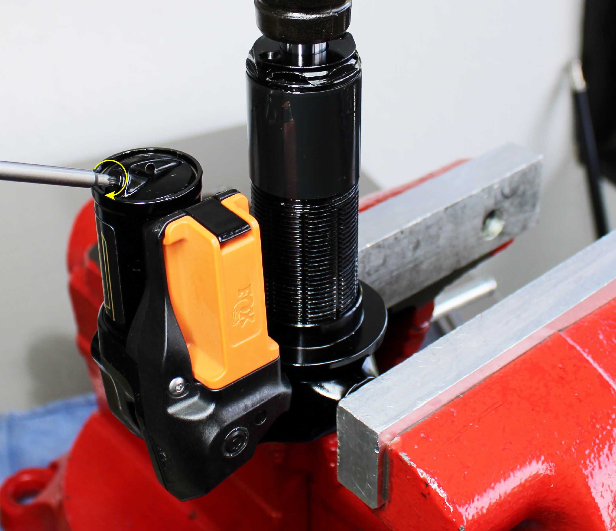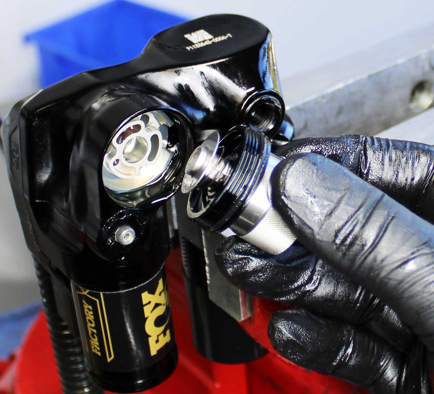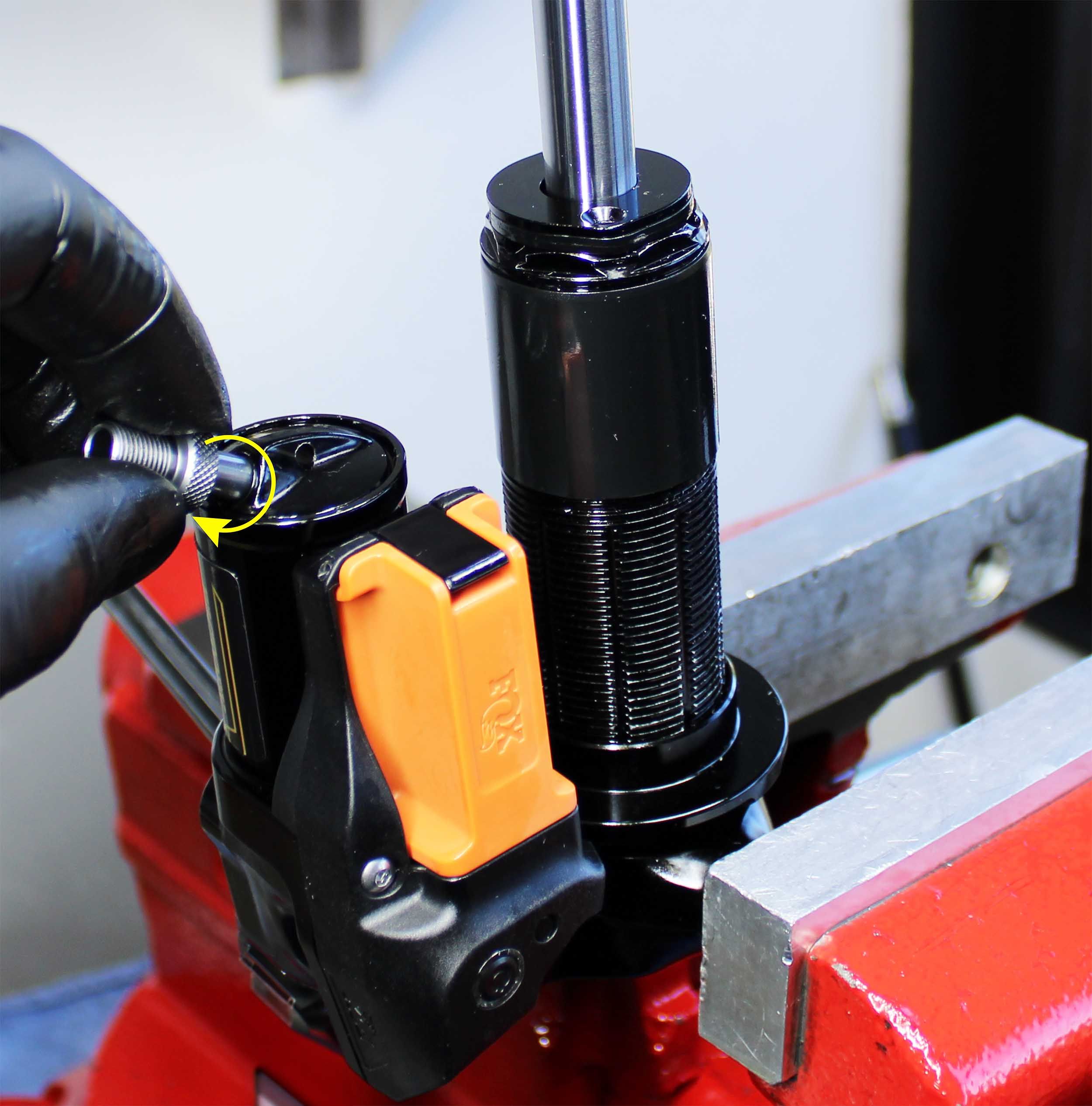 Unthread the Air Fill Cap counter-clockwise with a T8 Torx driver then set it aside. Thread the MY22 Air Fill Adaptor (PN: 803-01-692) clockwise into the Reservoir End Cap fully to release the IFP pressure (if attached to a FOX high-pressure pump, use the pump to bleed out all air from the reservoir). Remove the Air Fill Adaptor by unthreading it counter-clockwise.