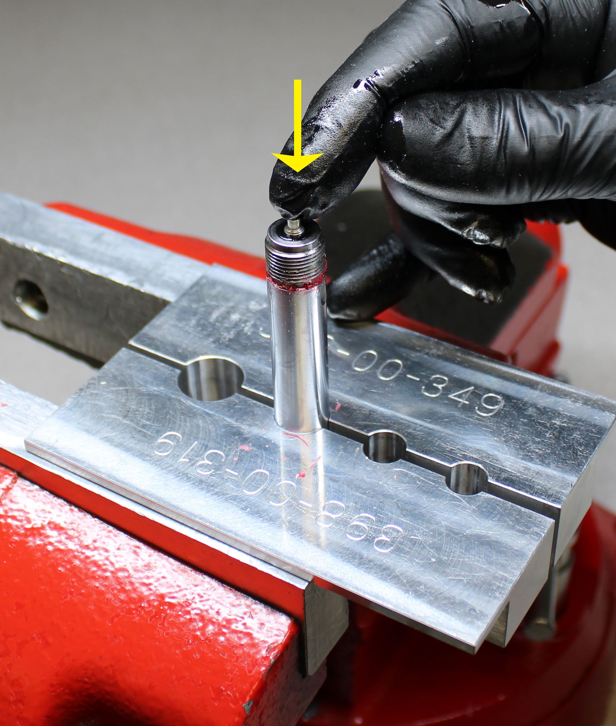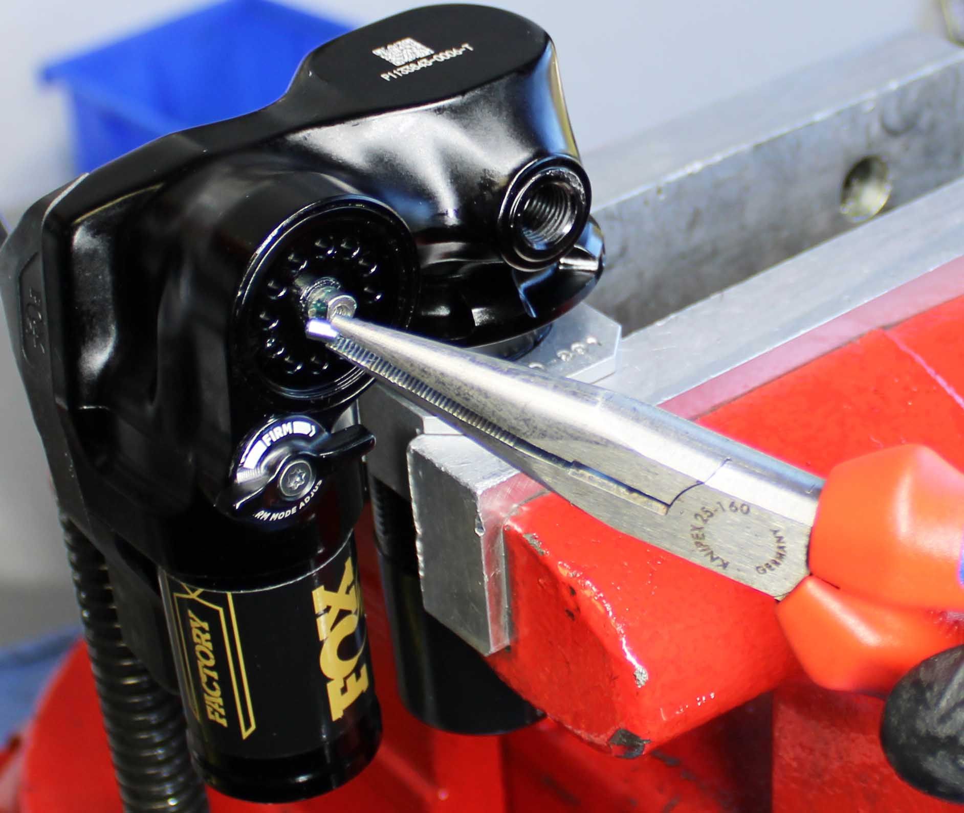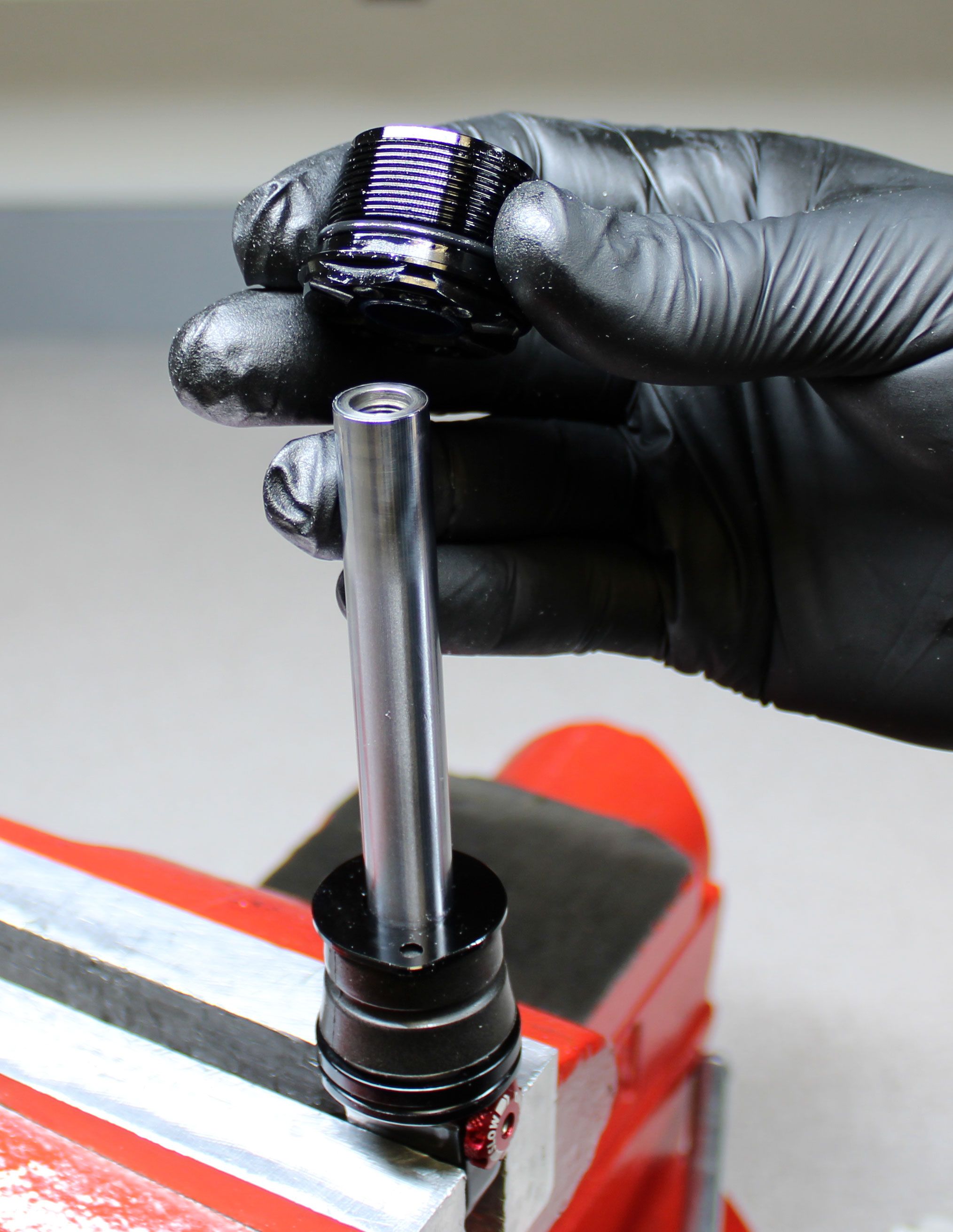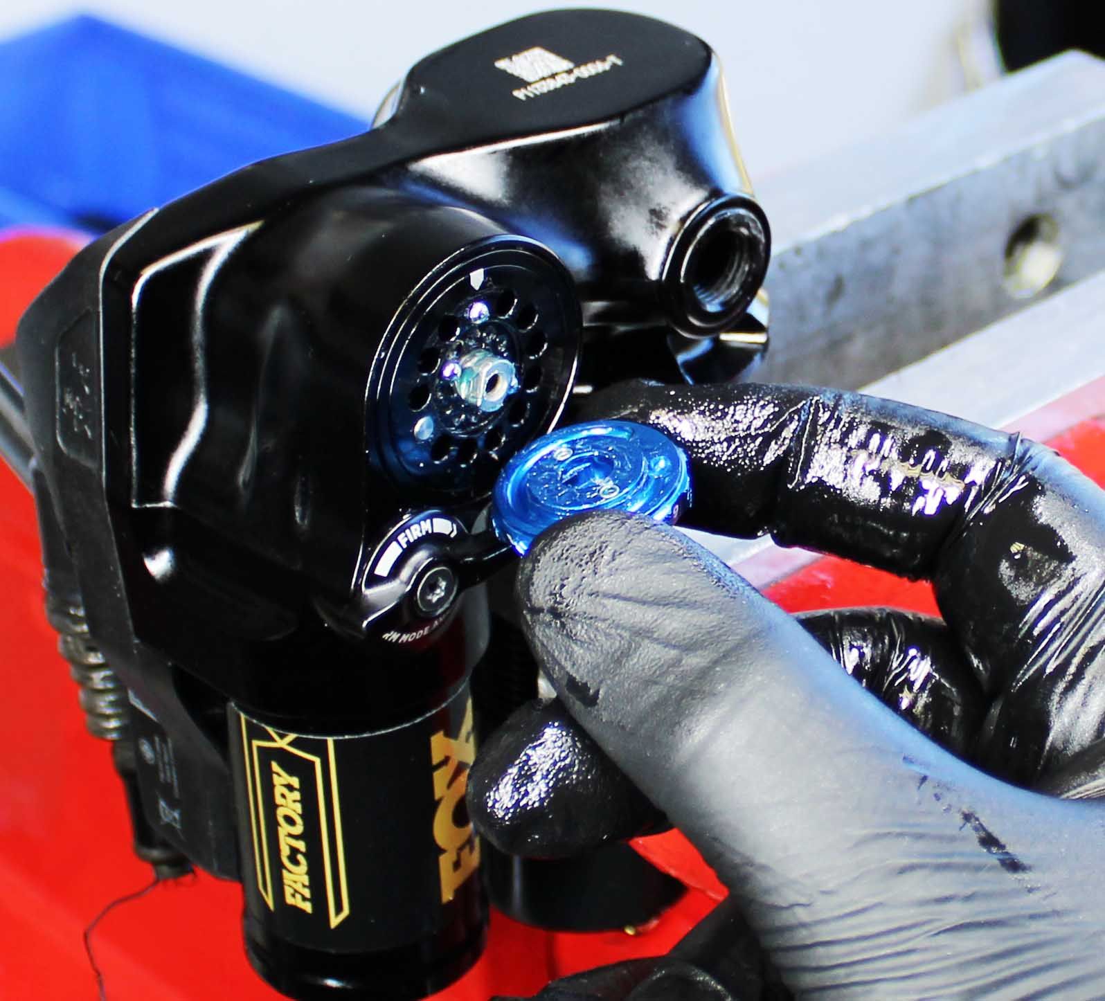 Unthread the Air Fill Cap counter-clockwise with a T8 Torx driver then set it aside. Thread the MY22 Air Fill Adaptor (PN: 803-01-692) clockwise into the Reservoir End Cap fully to release the IFP pressure (if attached to a FOX high-pressure pump, use the pump to bleed out all air from the reservoir). Remove the Air Fill Adaptor by unthreading it counter-clockwise.