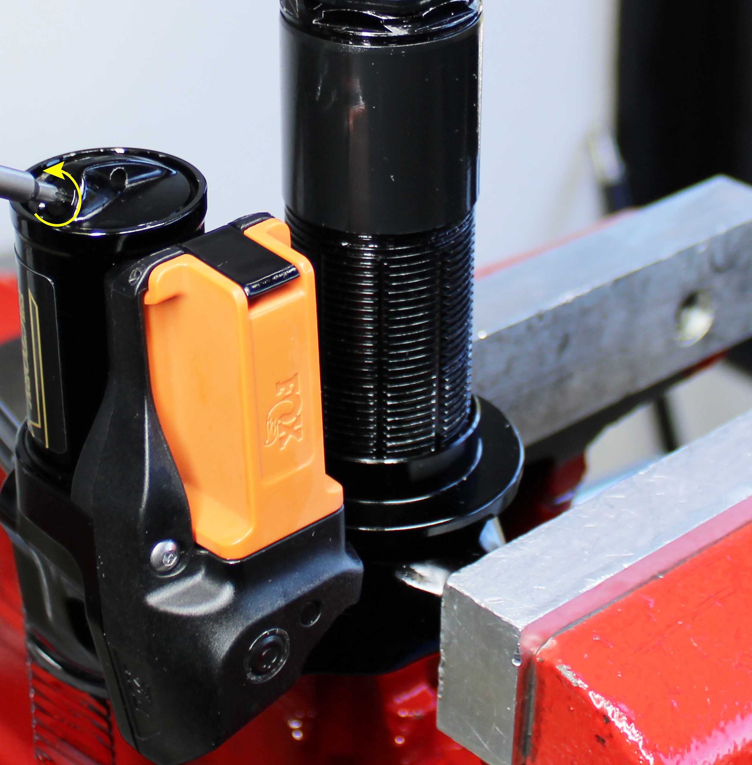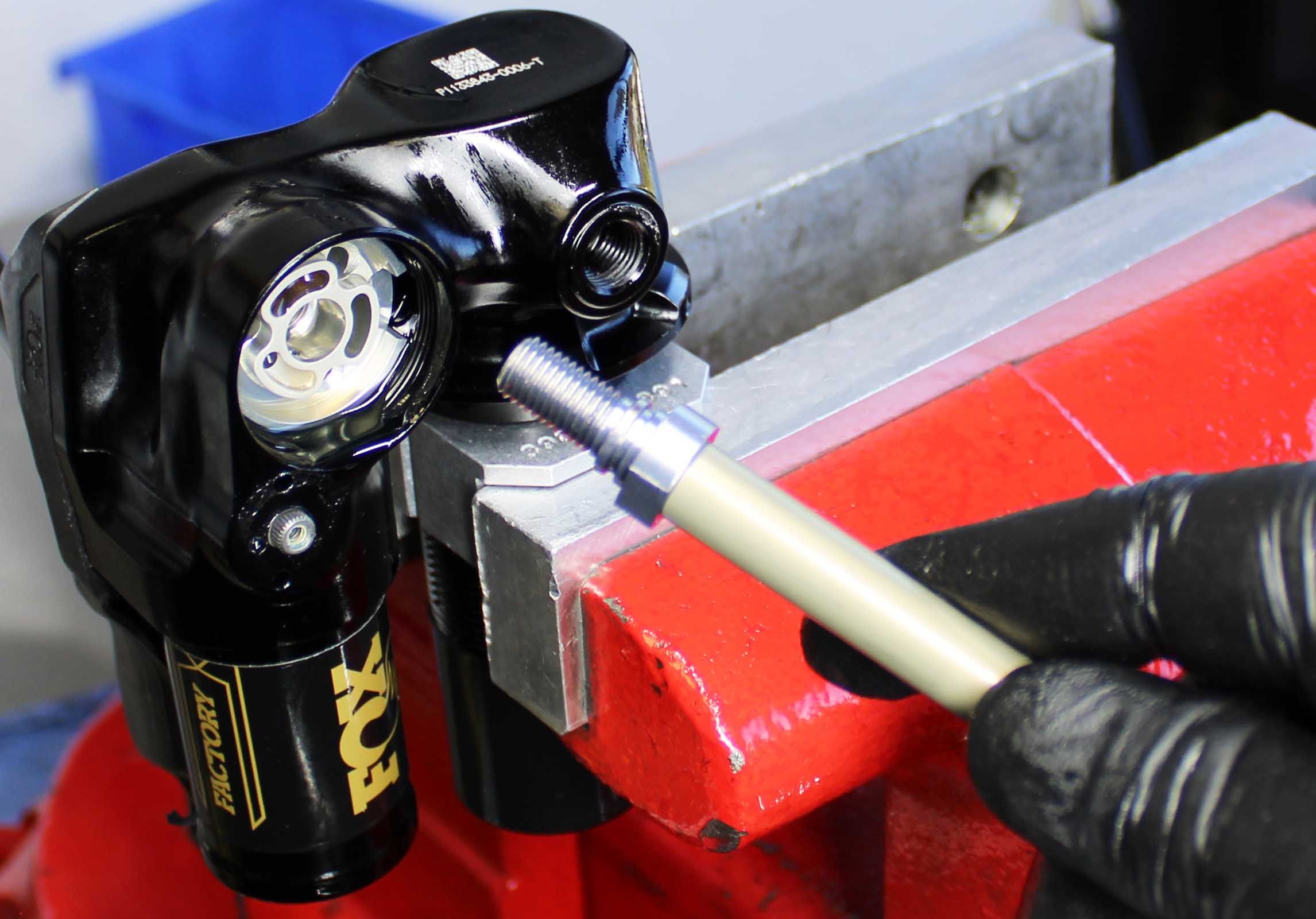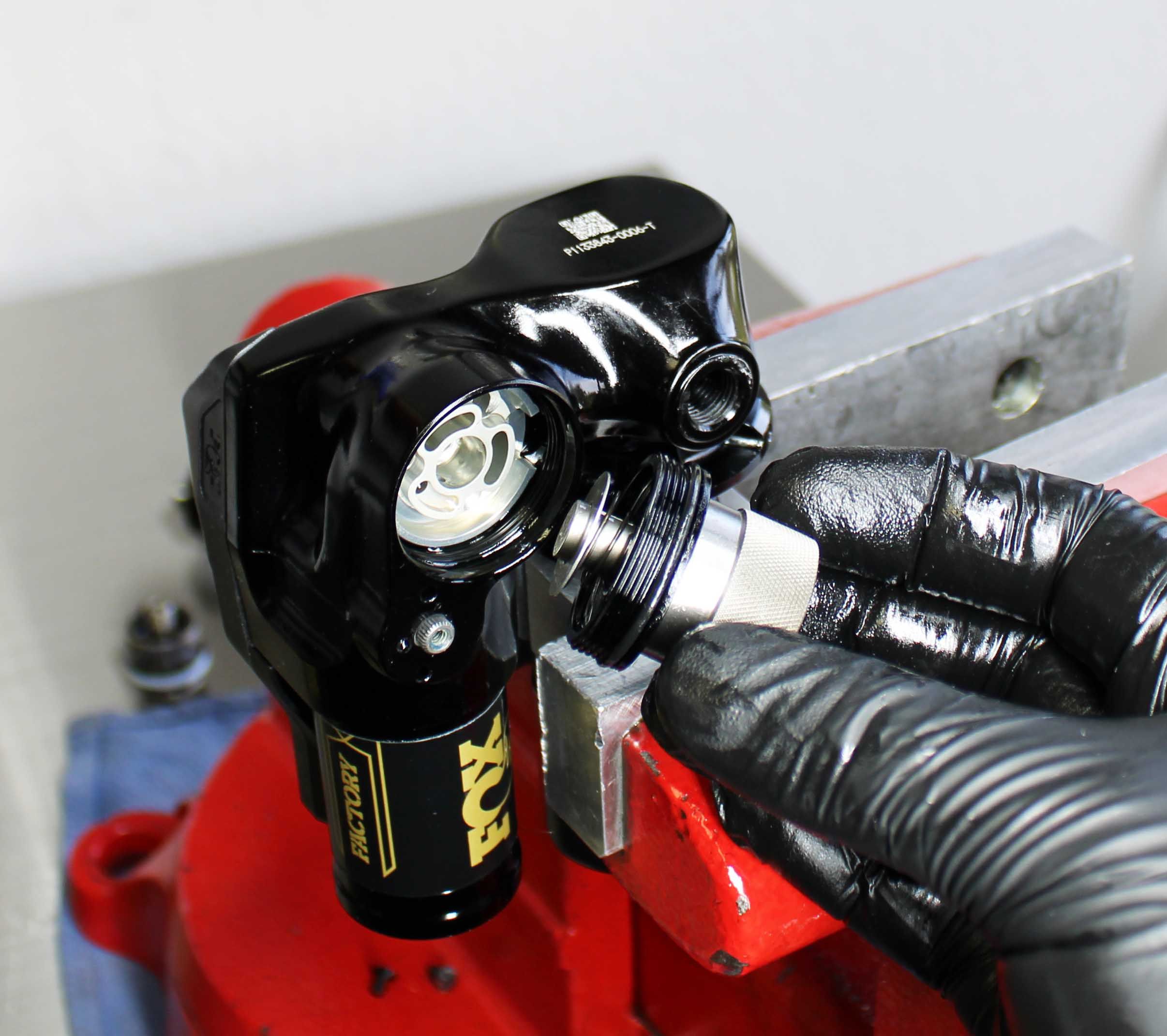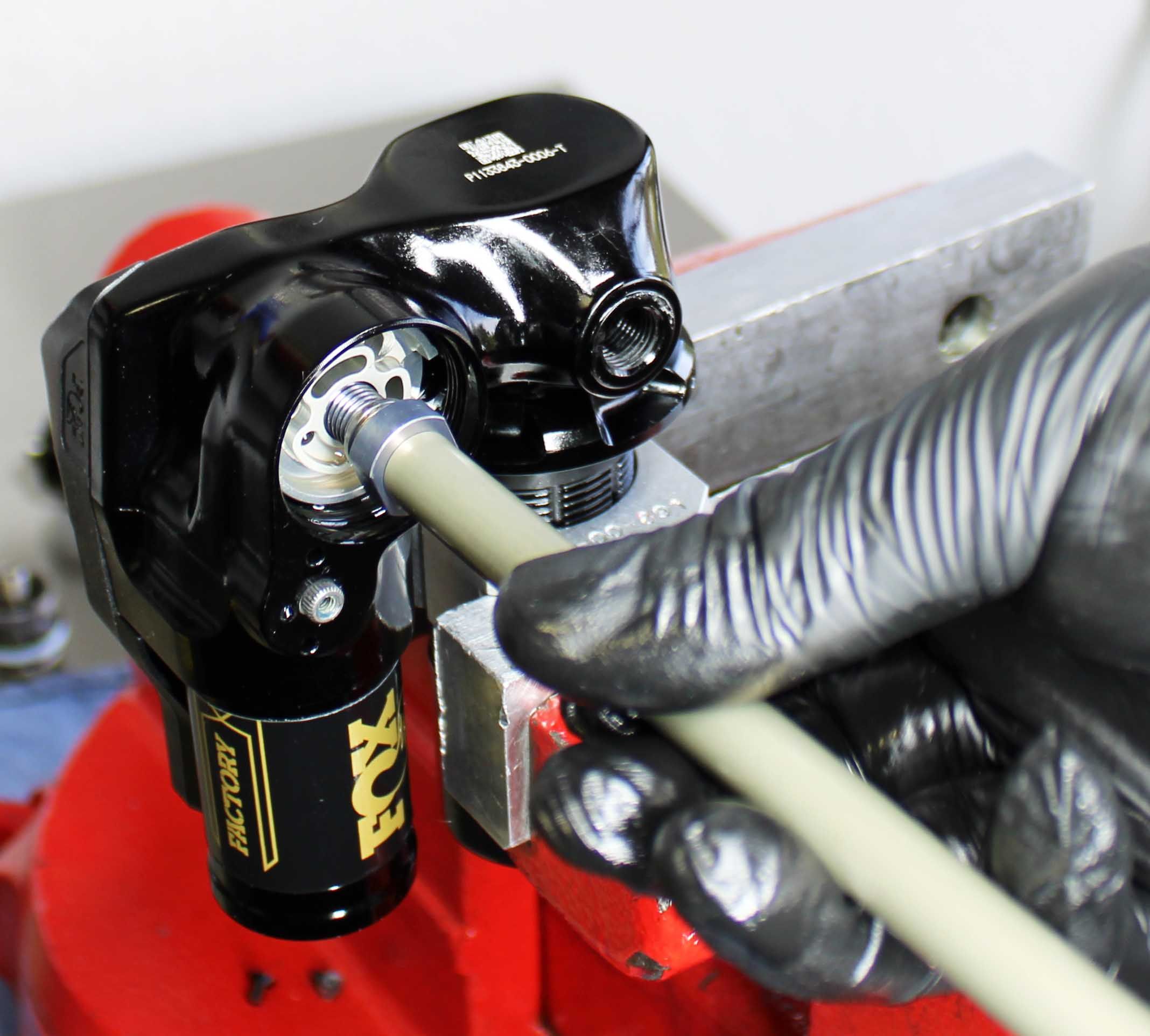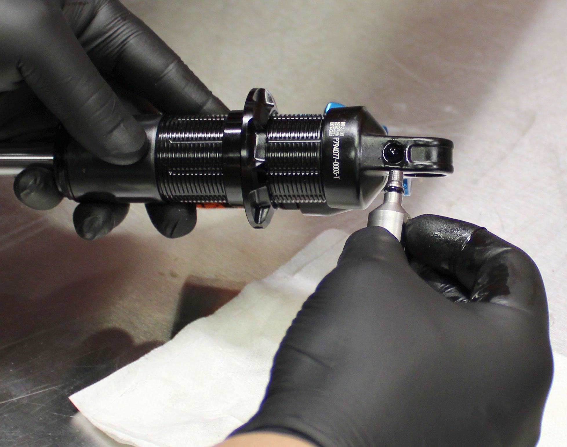 Open all adjuster by turning them fully counter-clockwise. Remove the oil fill plug by turning it counter-clockwise with a T8 Torx driver. Make sure that your vacuum bleed machine is filled with FOX 4wt. oil (PN 025-03-063). Install the vacuum fitting (PN 803-01-691) into the eyelet fill port by turning it clockwise. Cycle the shock by hand while you perform the vacuum cycle. Repeat as necessary to purge all air from the shock. Set the IFP to the appropriate depth based on the length of your reservoir.