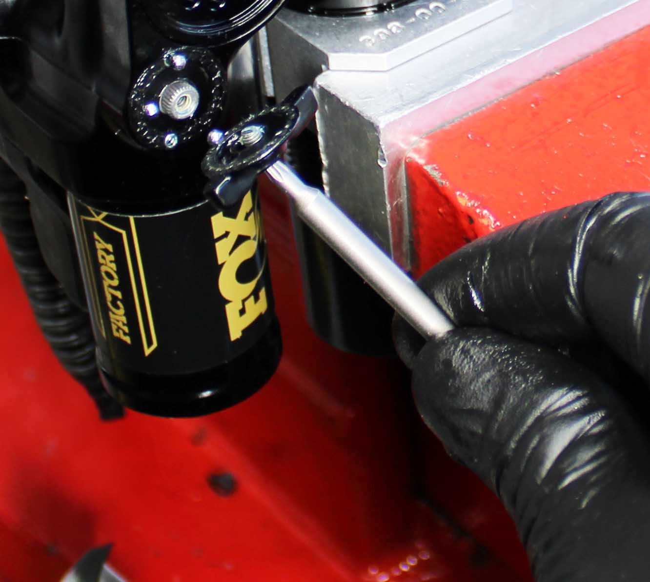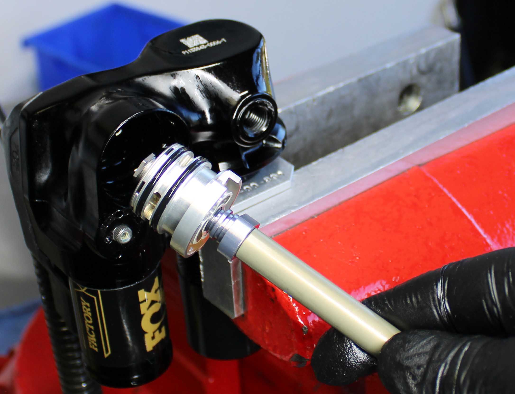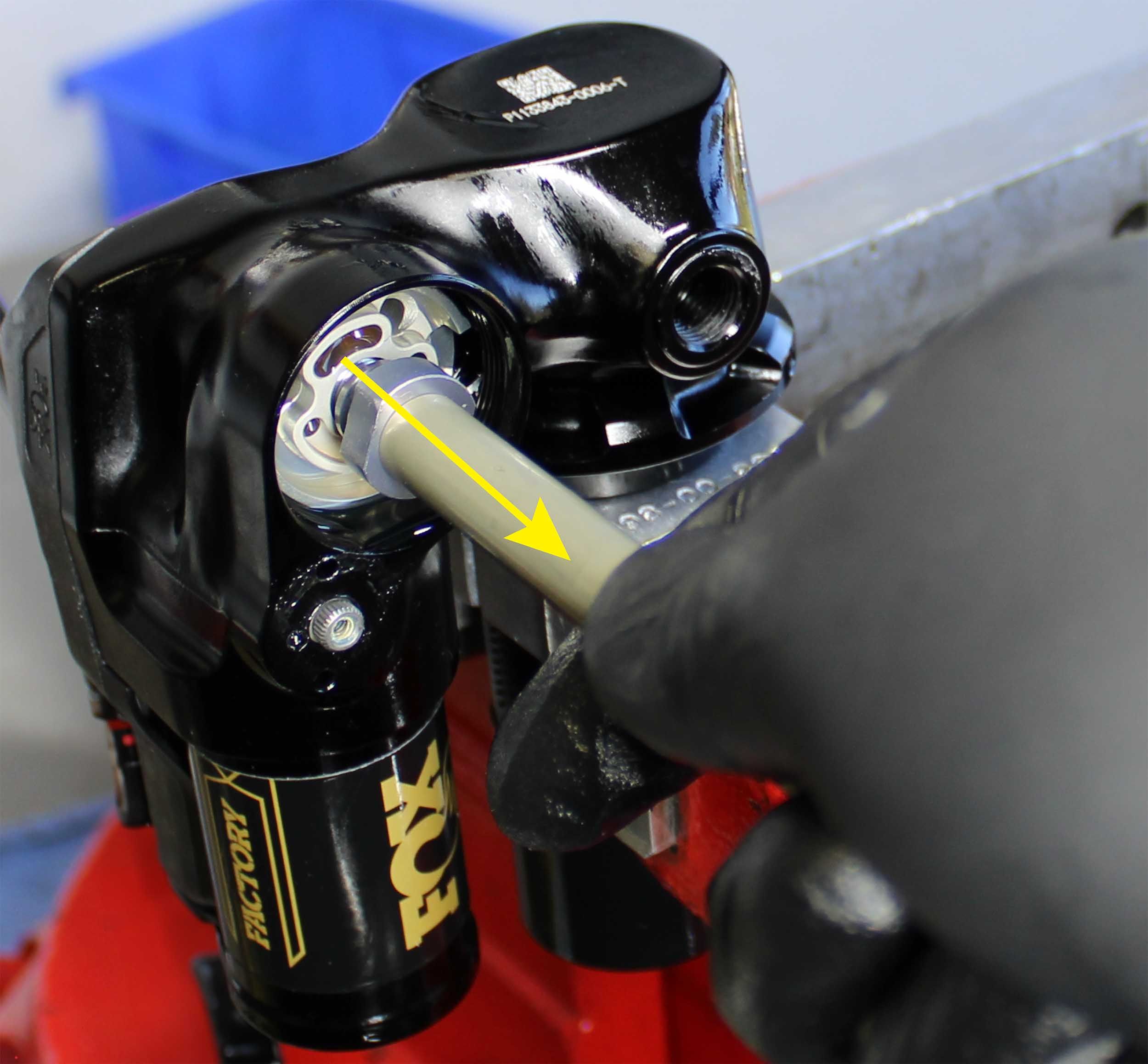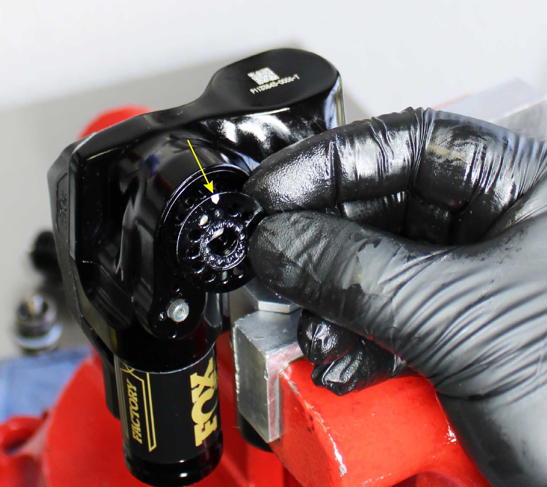 Open all adjuster by turning them fully counter-clockwise. Remove the oil fill plug by turning it counter-clockwise with a T8 Torx driver. Make sure that your vacuum bleed machine is filled with FOX 4wt. oil (PN 025-03-063). Install the vacuum fitting (PN 803-01-691) into the eyelet fill port by turning it clockwise. Cycle the shock by hand while you perform the vacuum cycle. Repeat as necessary to purge all air from the shock. Set the IFP to the appropriate depth based on the length of your reservoir.