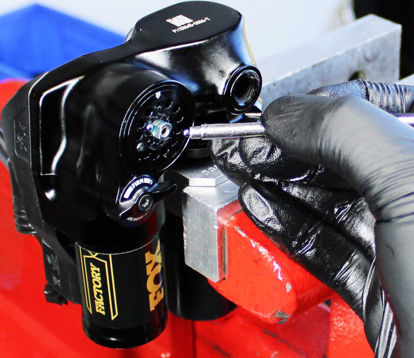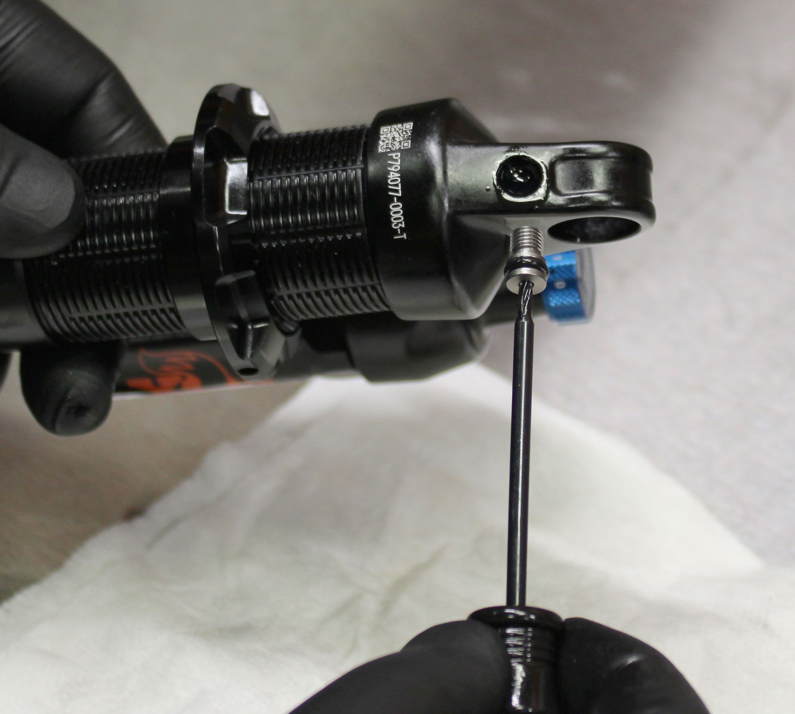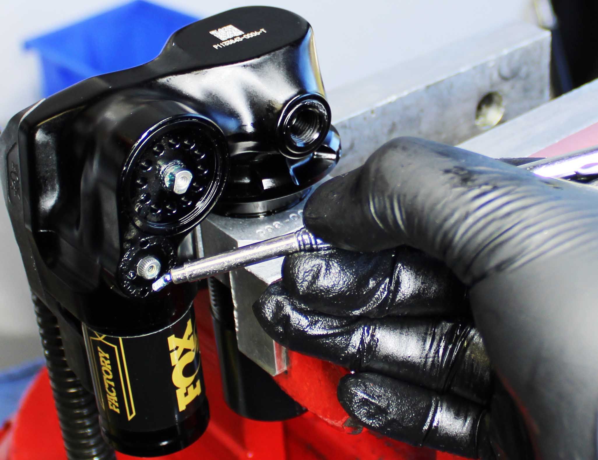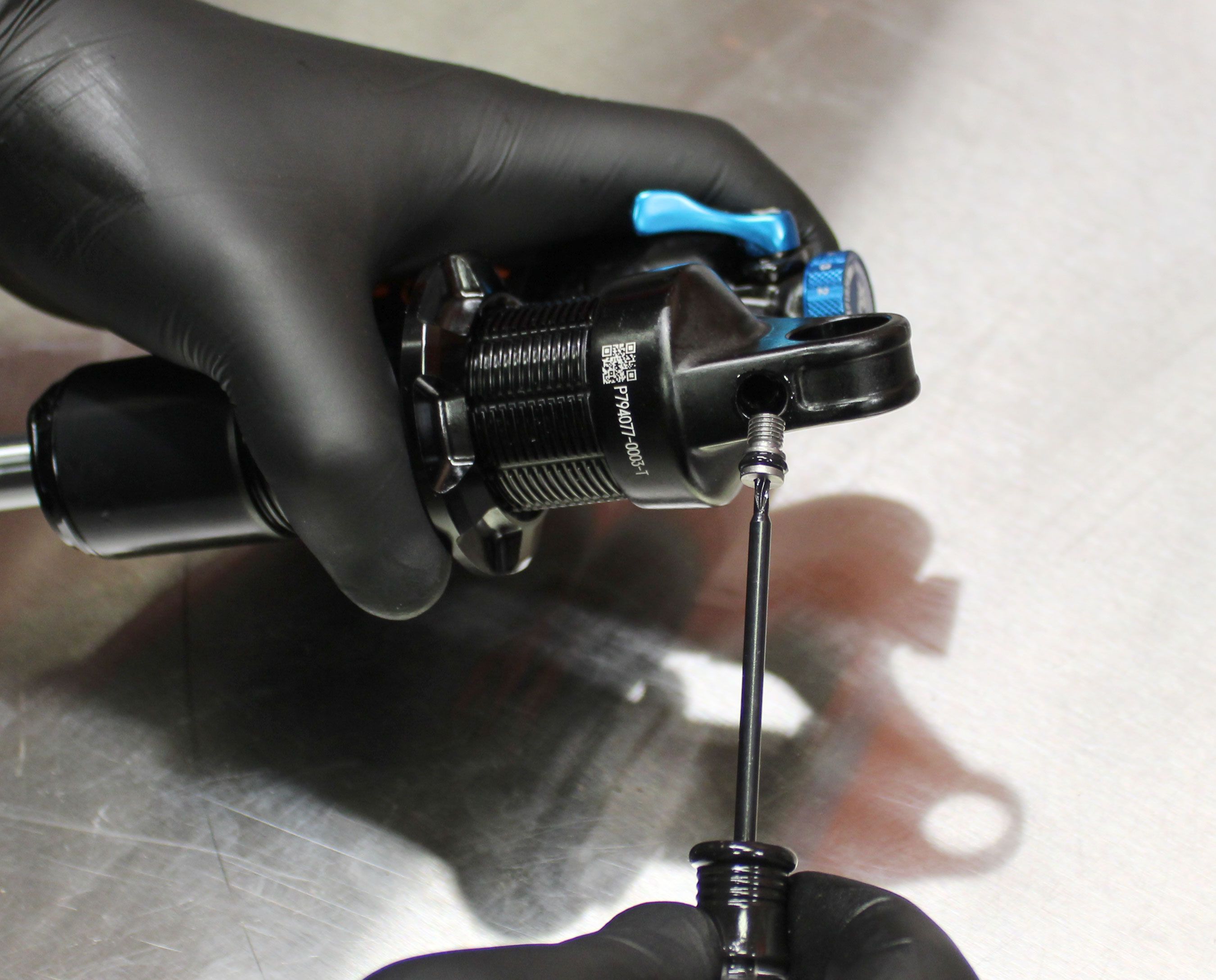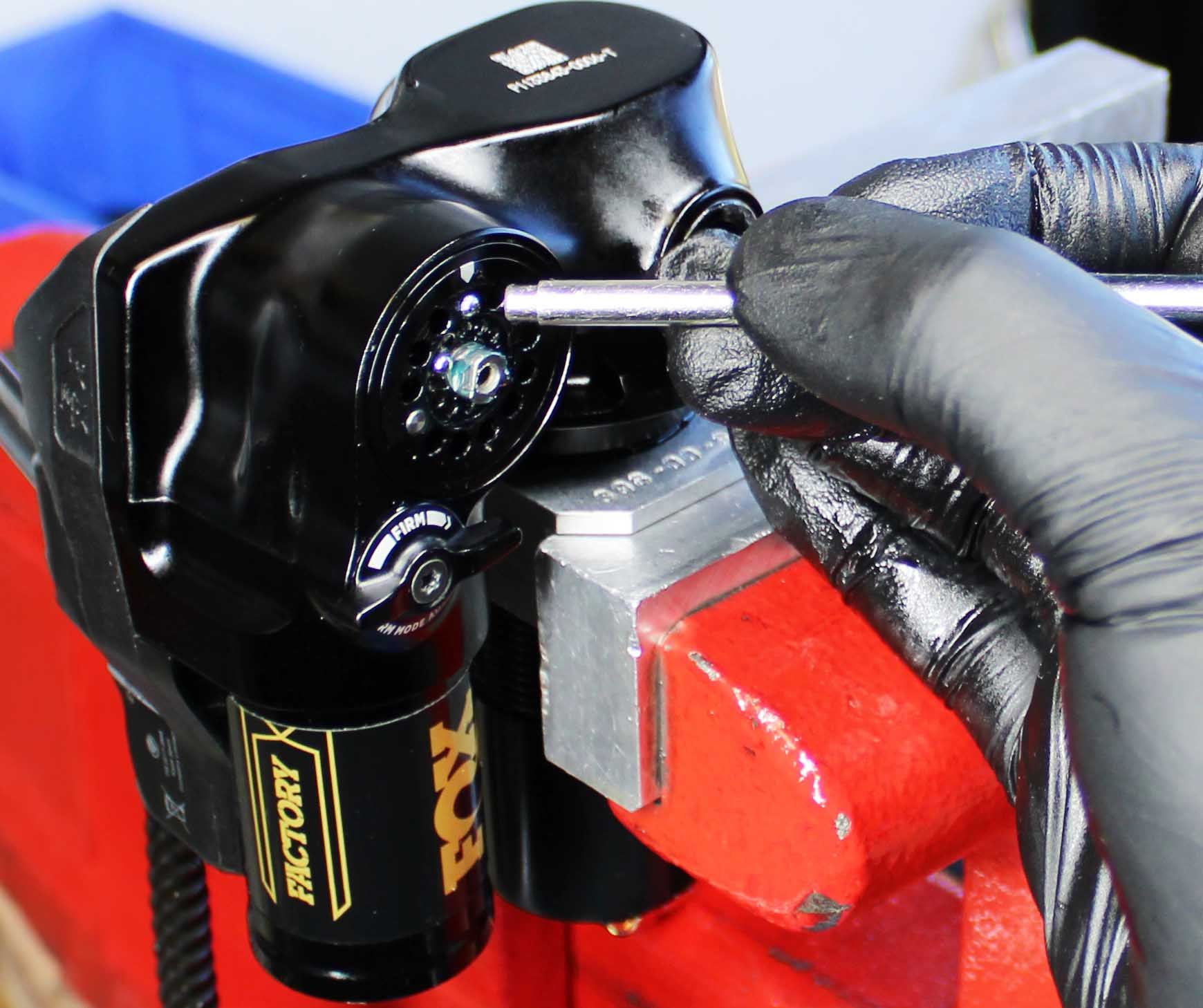 Open all adjuster by turning them fully counter-clockwise. Remove the oil fill plug by turning it counter-clockwise with a T8 Torx driver. Make sure that your vacuum bleed machine is filled with FOX 4wt. oil (PN 025-03-063). Install the vacuum fitting (PN 803-01-691) into the eyelet fill port by turning it clockwise. Cycle the shock by hand while you perform the vacuum cycle. Repeat as necessary to purge all air from the shock. Set the IFP to the appropriate depth based on the length of your reservoir.