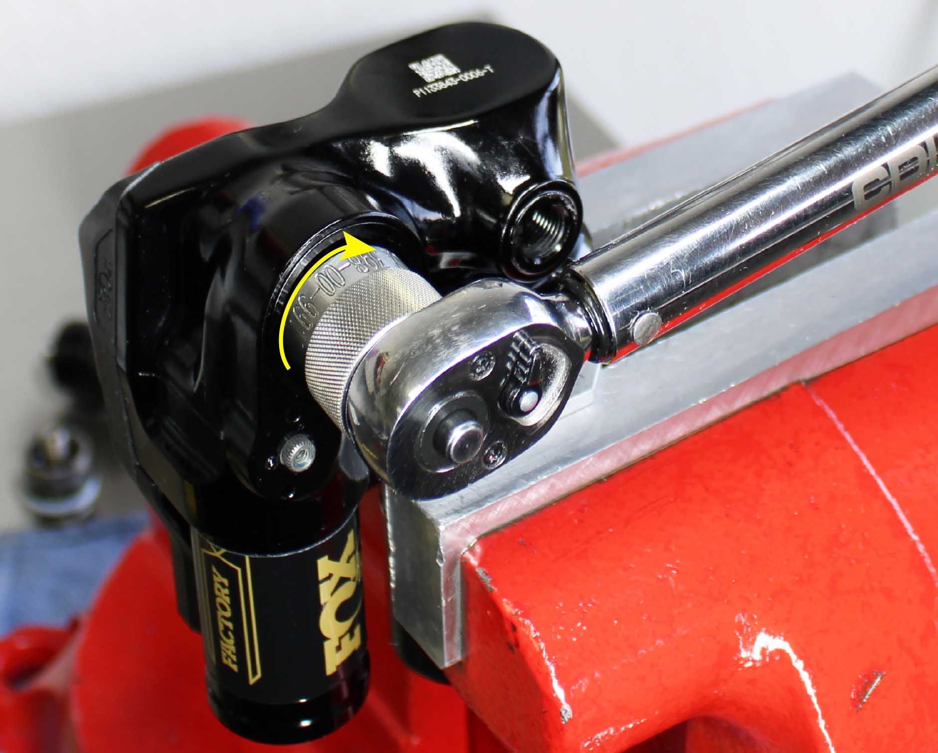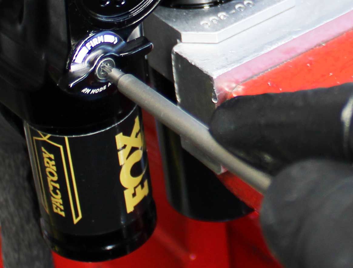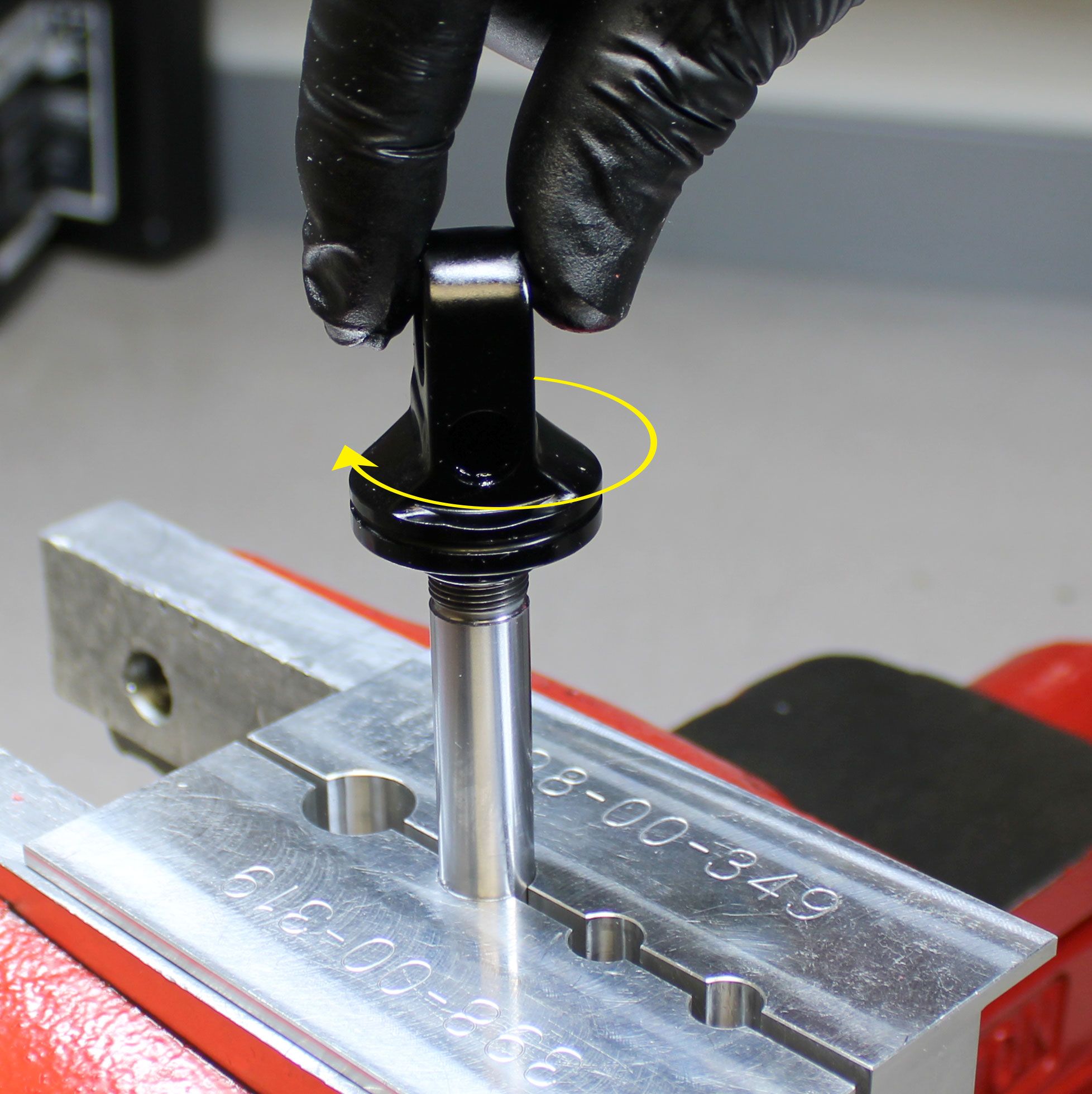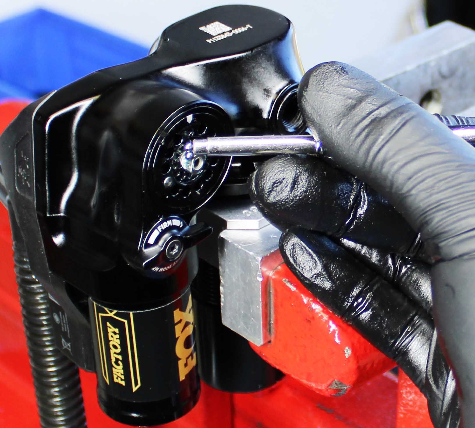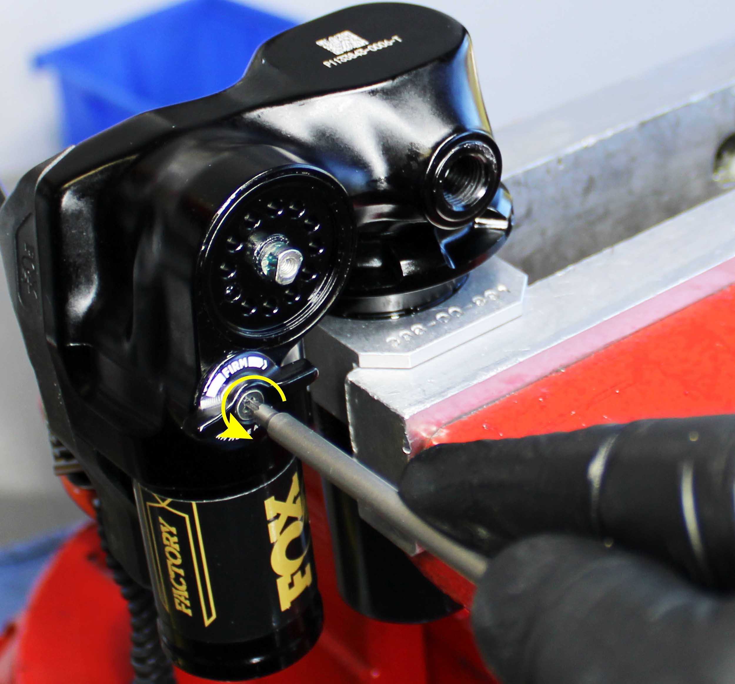 Open all adjuster by turning them fully counter-clockwise. Remove the oil fill plug by turning it counter-clockwise with a T8 Torx driver. Make sure that your vacuum bleed machine is filled with FOX 4wt. oil (PN 025-03-063). Install the vacuum fitting (PN 803-01-691) into the eyelet fill port by turning it clockwise. Cycle the shock by hand while you perform the vacuum cycle. Repeat as necessary to purge all air from the shock. Set the IFP to the appropriate depth based on the length of your reservoir.