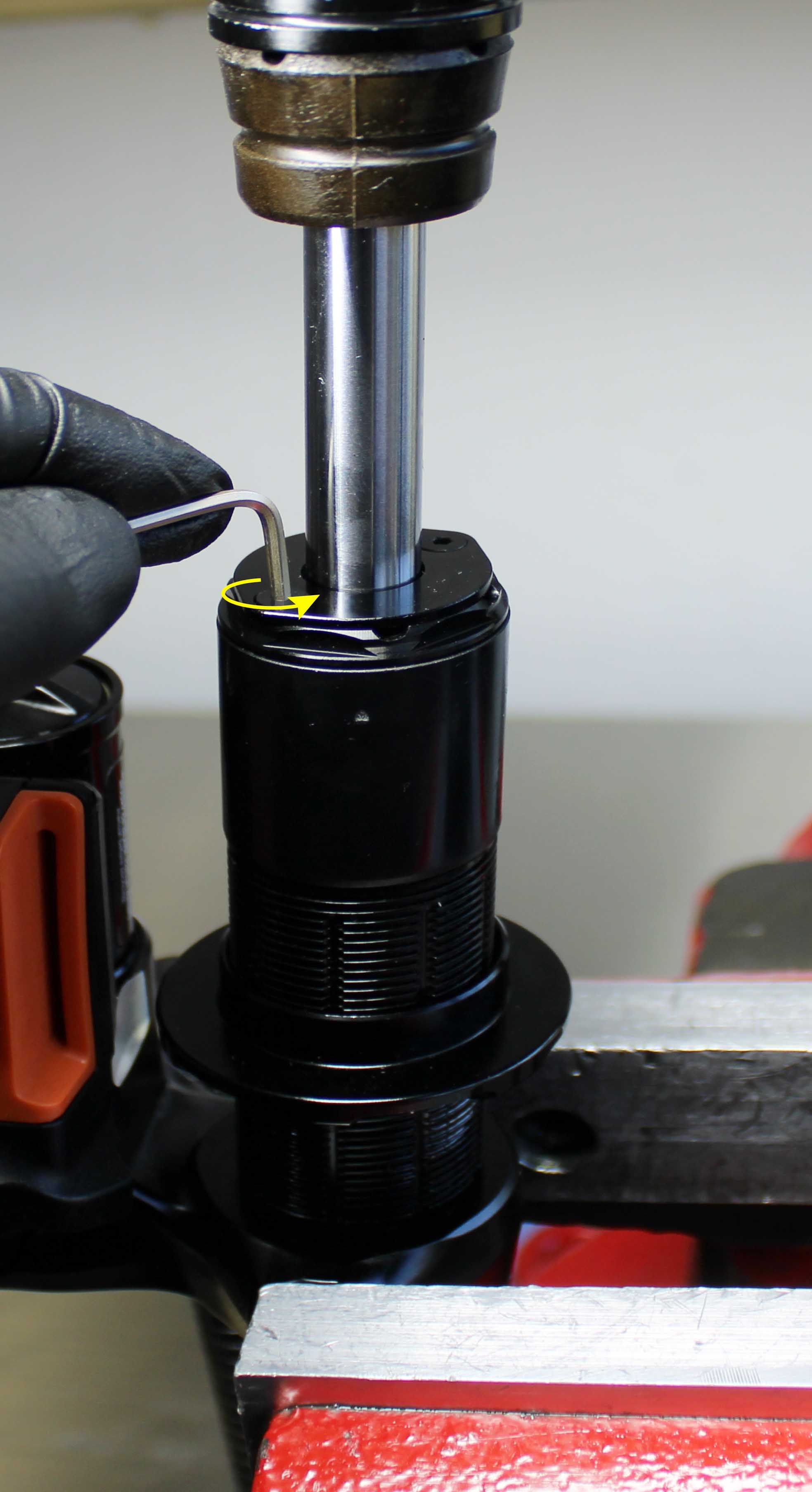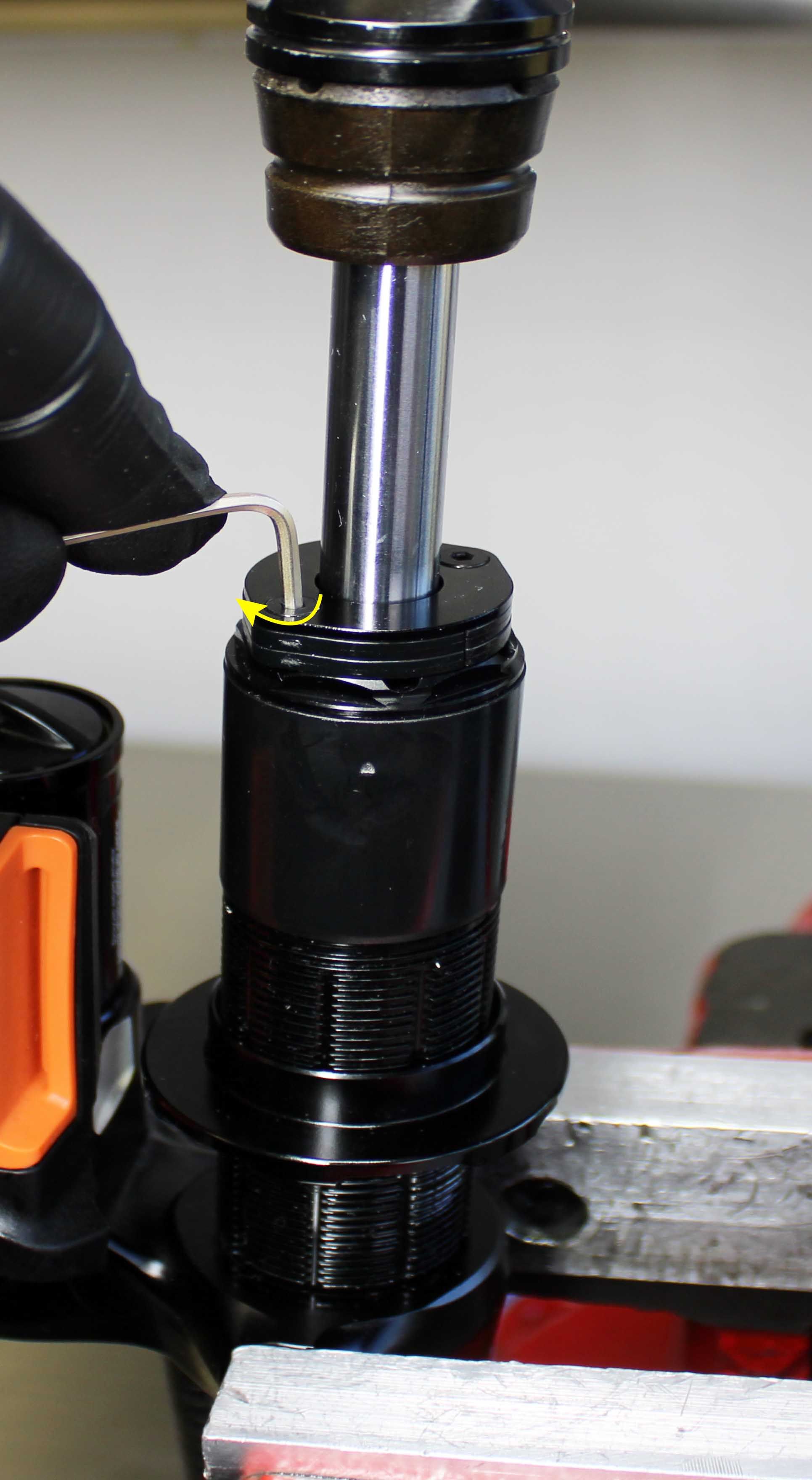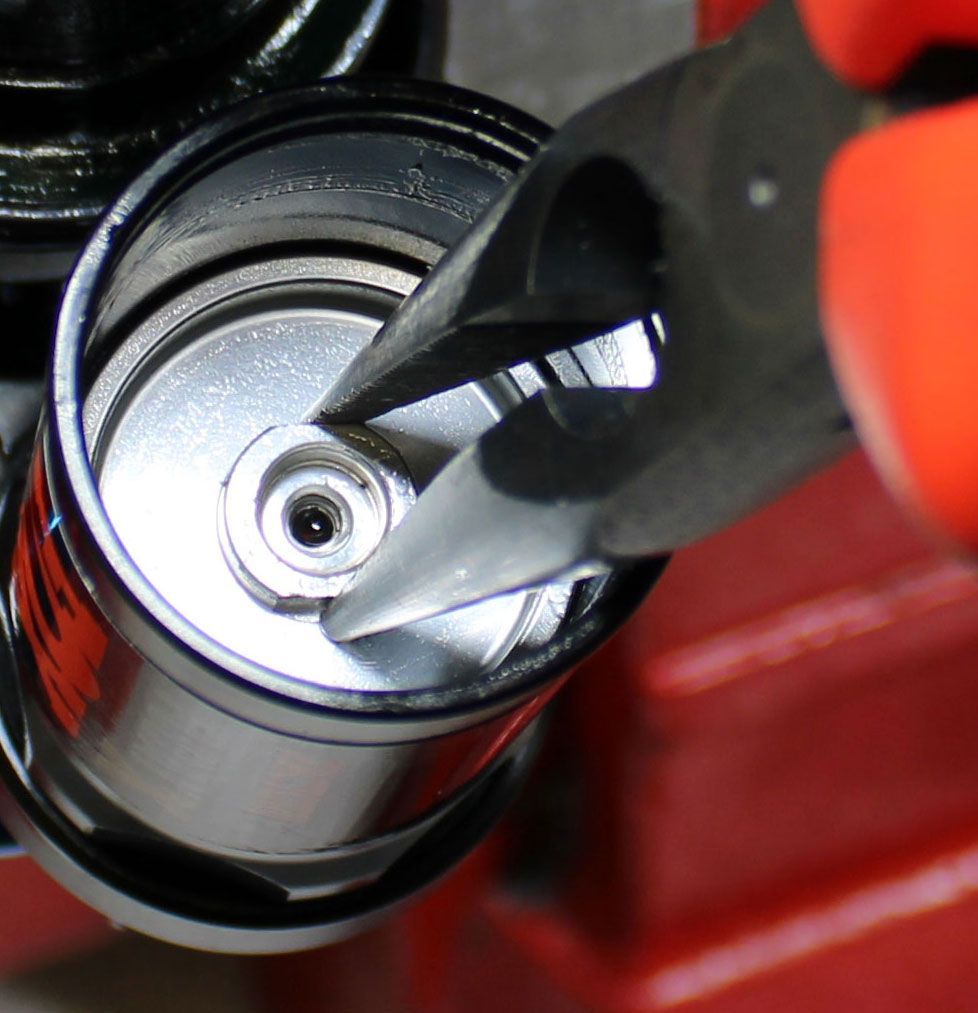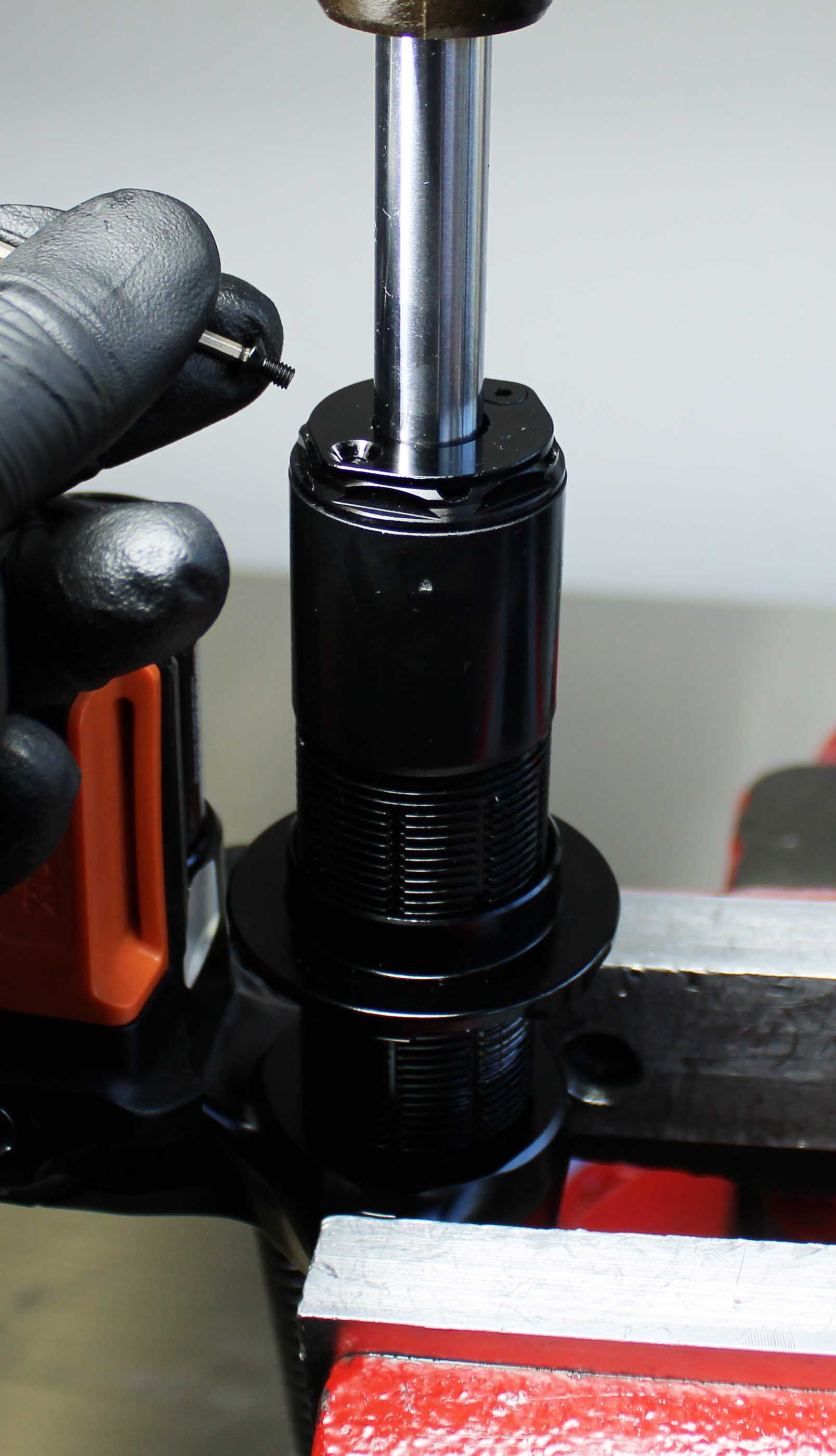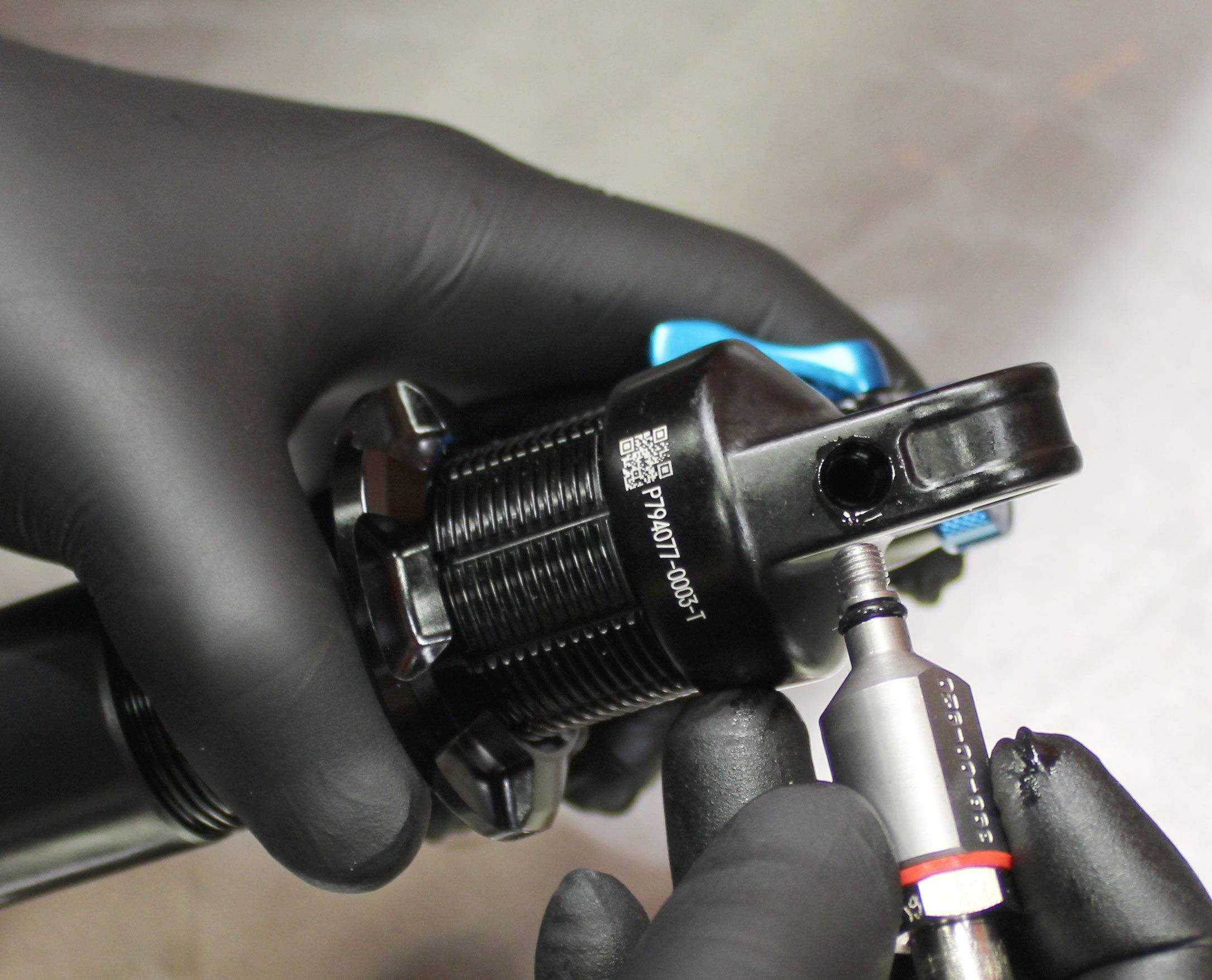 Reinstall the wire ring. Use a small hex wrench to lift the reservoir end cap into place making sure to orient the fill port away from the damper body. Install the air fill adaptor by threading it in clockwise. Set the IFP pressure to 150 psi. Remove the air fill adaptor while still attached to your pump. Reinstall the air fill cap with a new greased o-ring from the kit, tightening clockwise to 3 in-lb (0.3 Nm) torque.