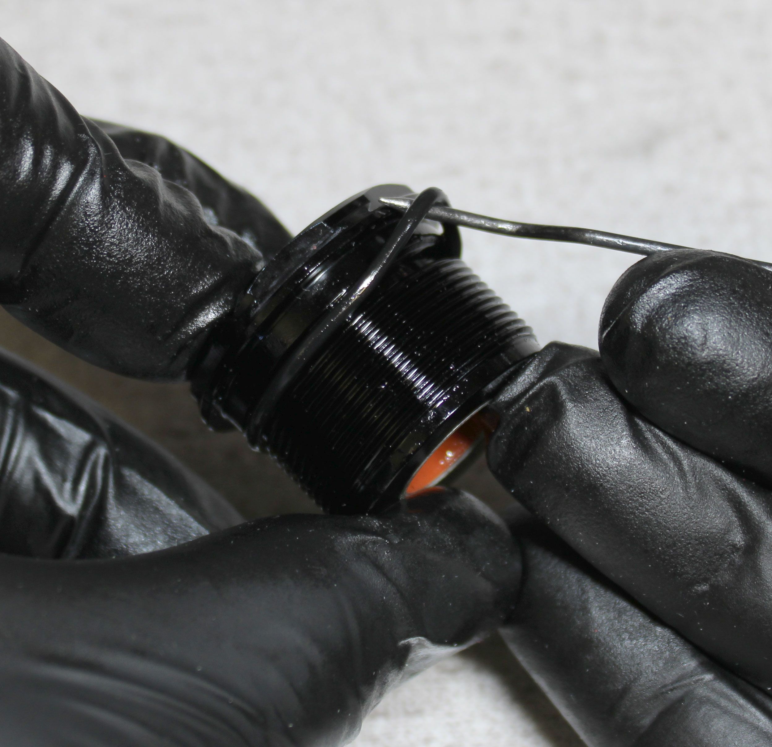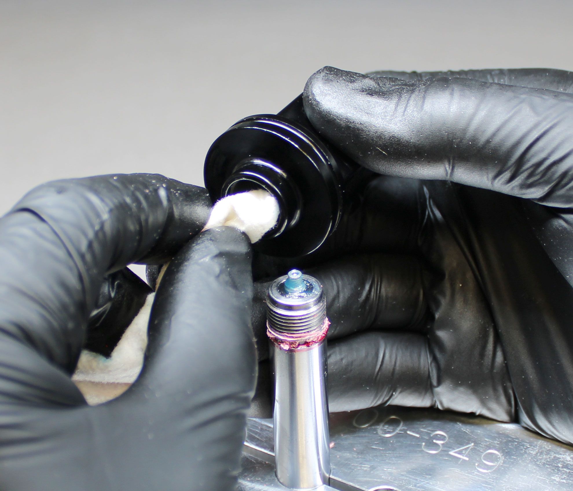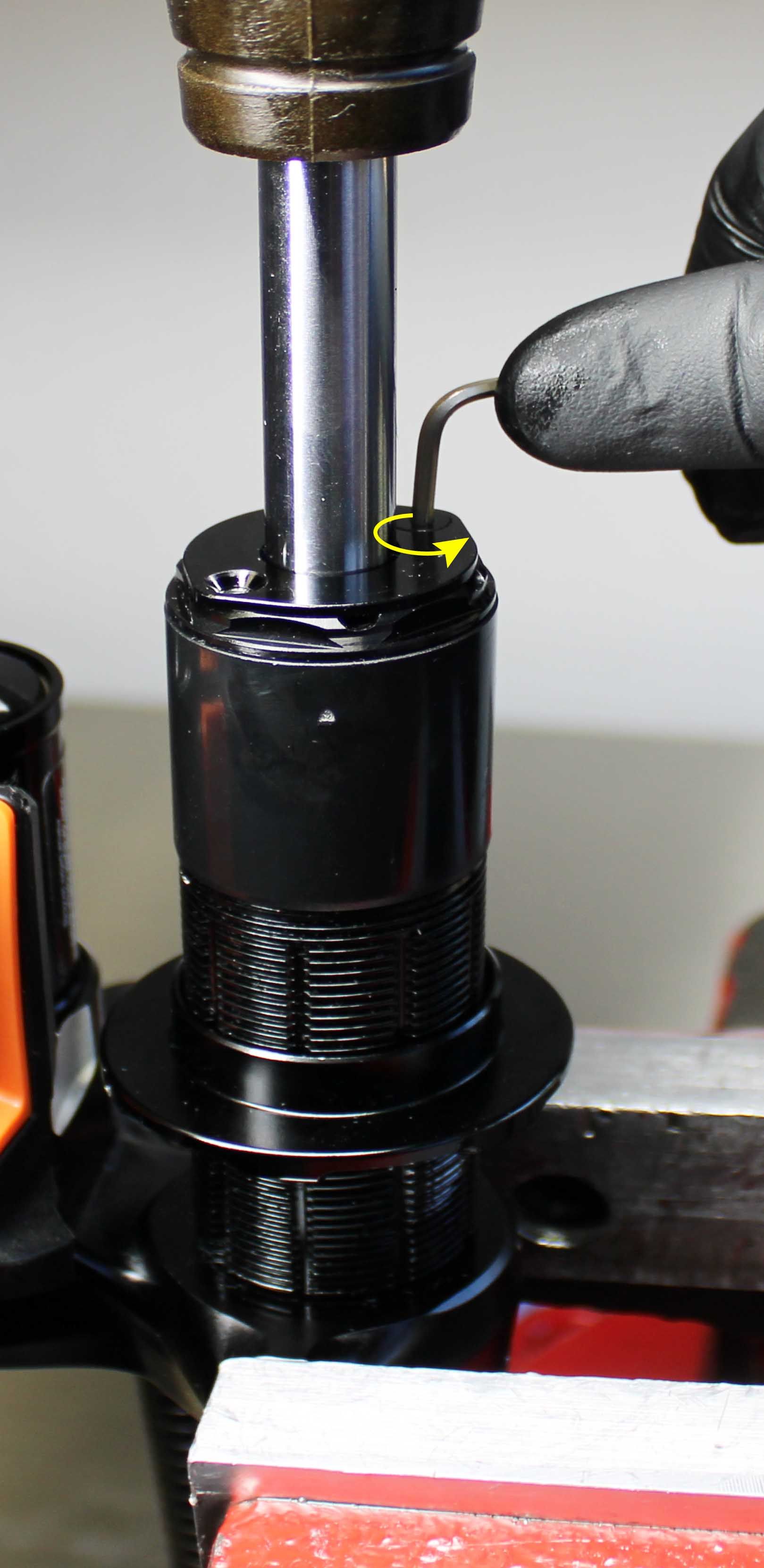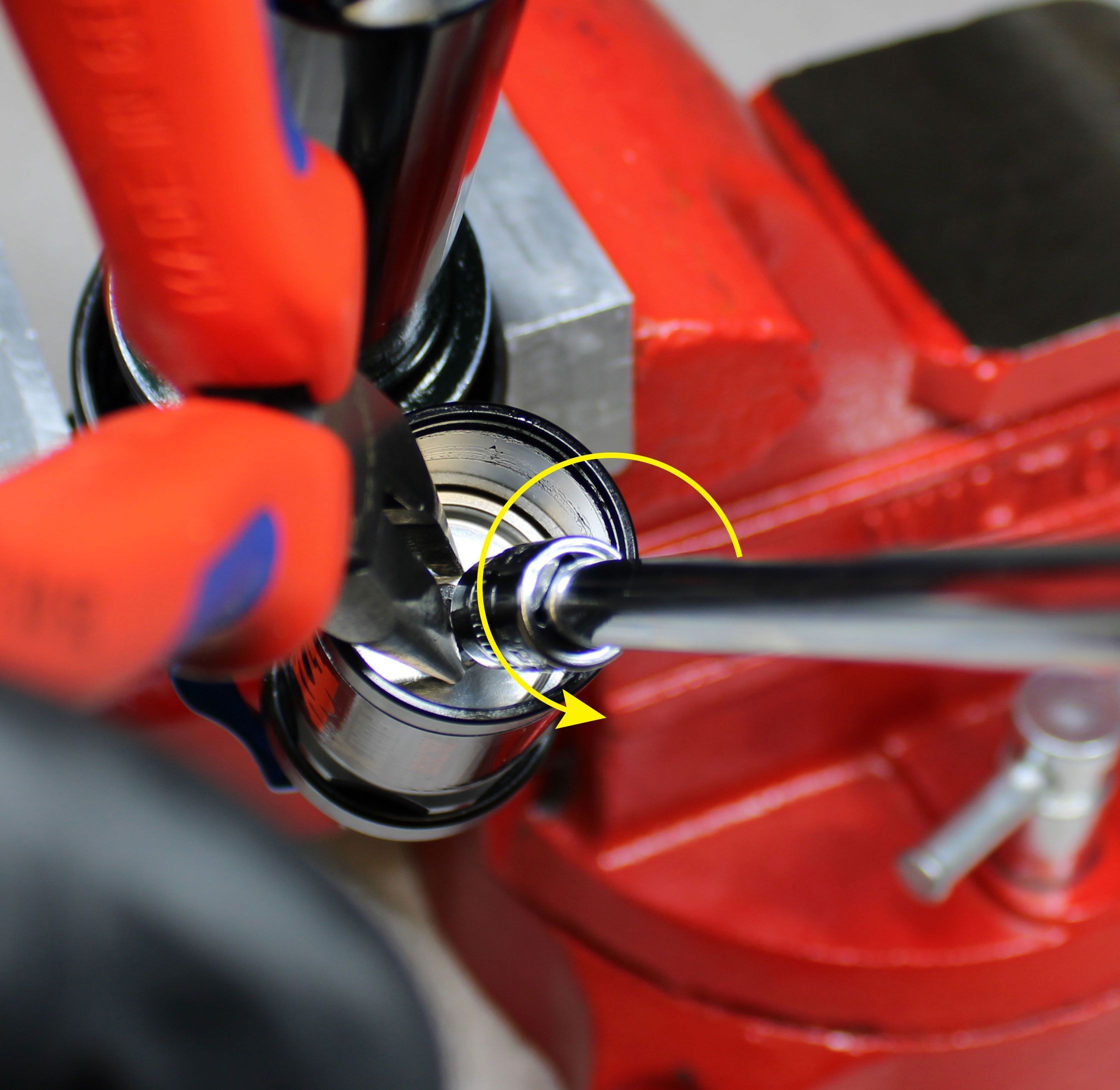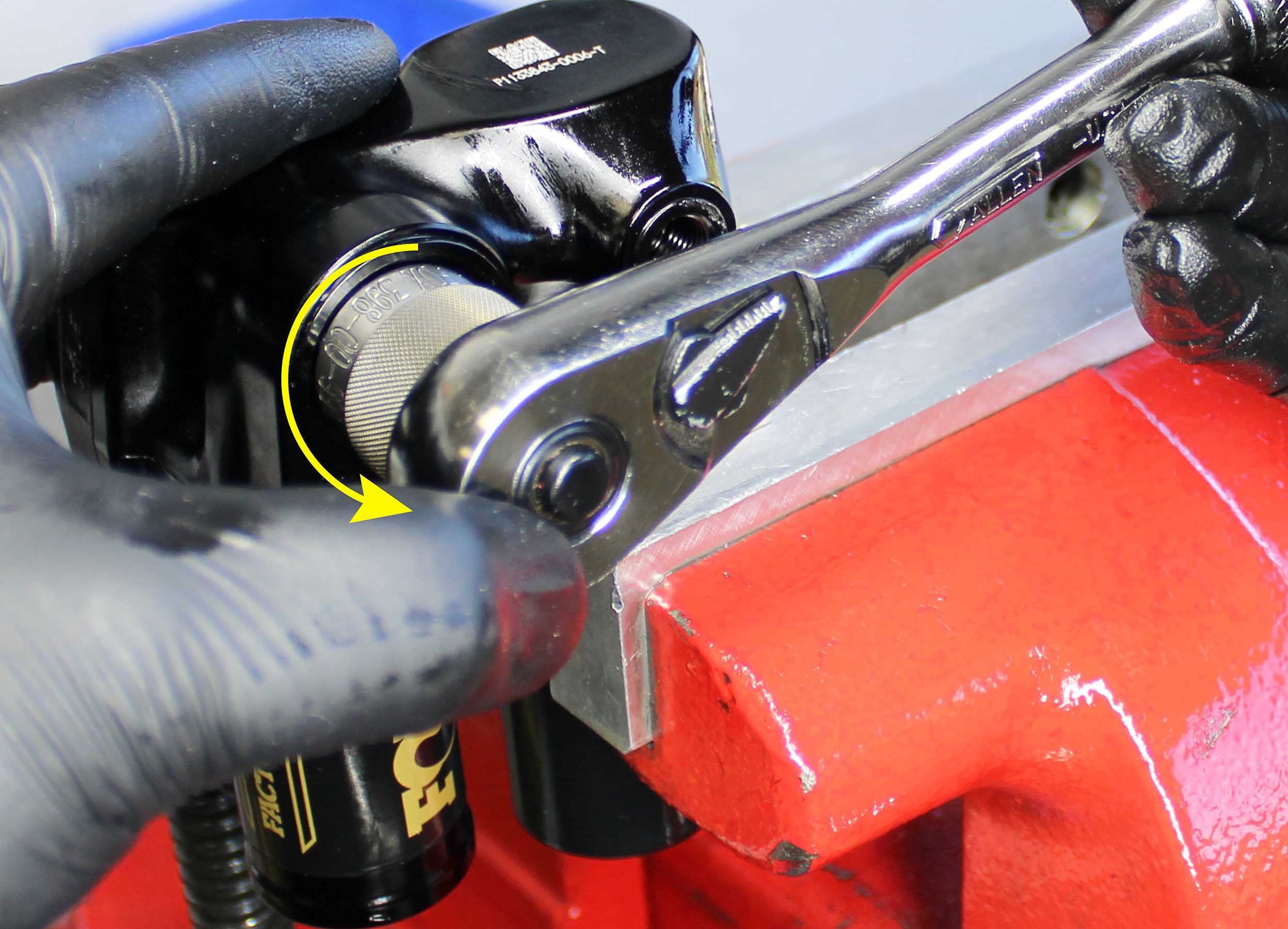 Reinstall the wire ring. Use a small hex wrench to lift the reservoir end cap into place making sure to orient the fill port away from the damper body. Install the air fill adaptor by threading it in clockwise. Set the IFP pressure to 150 psi. Remove the air fill adaptor while still attached to your pump. Reinstall the air fill cap with a new greased o-ring from the kit, tightening clockwise to 3 in-lb (0.3 Nm) torque.
