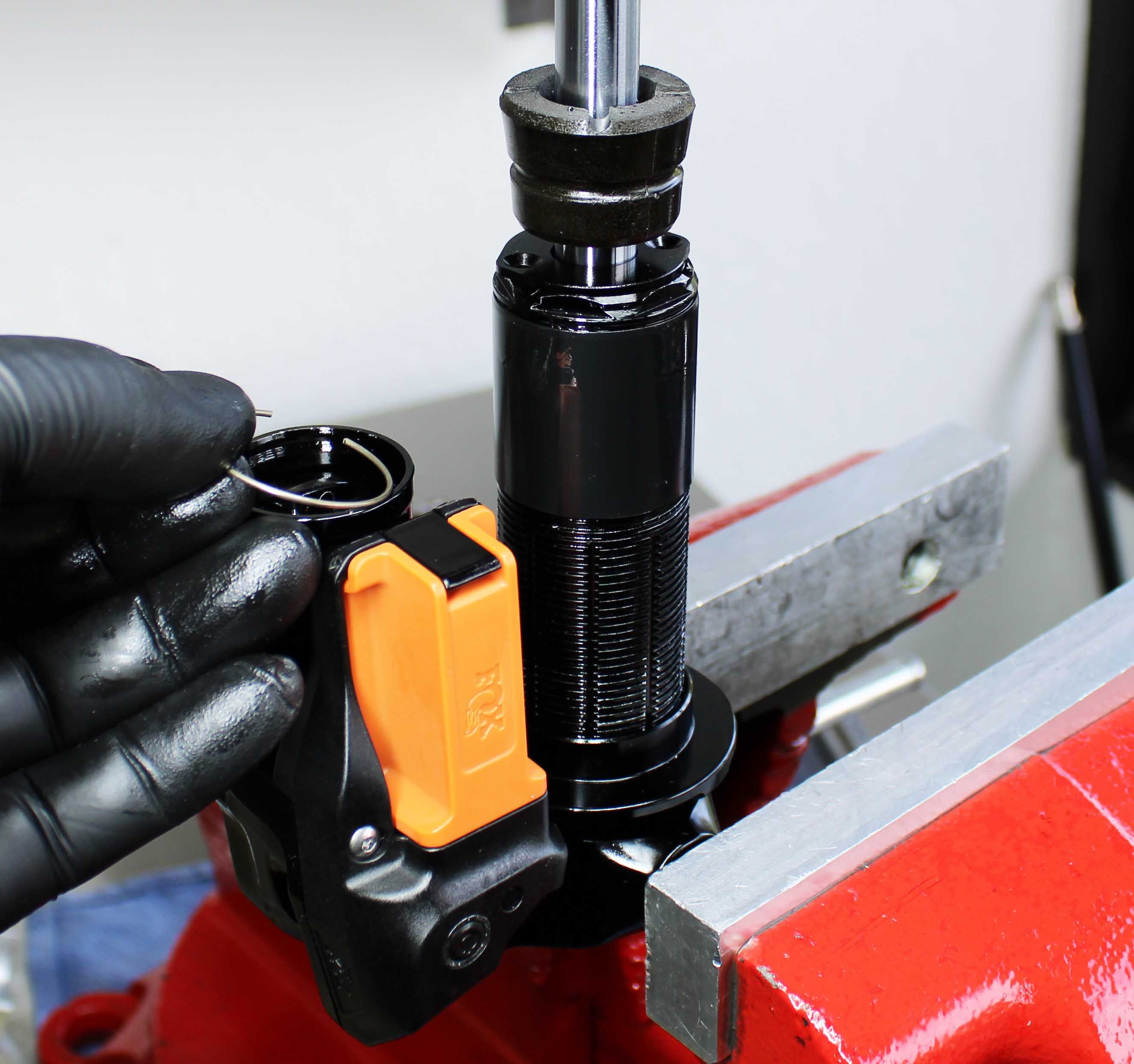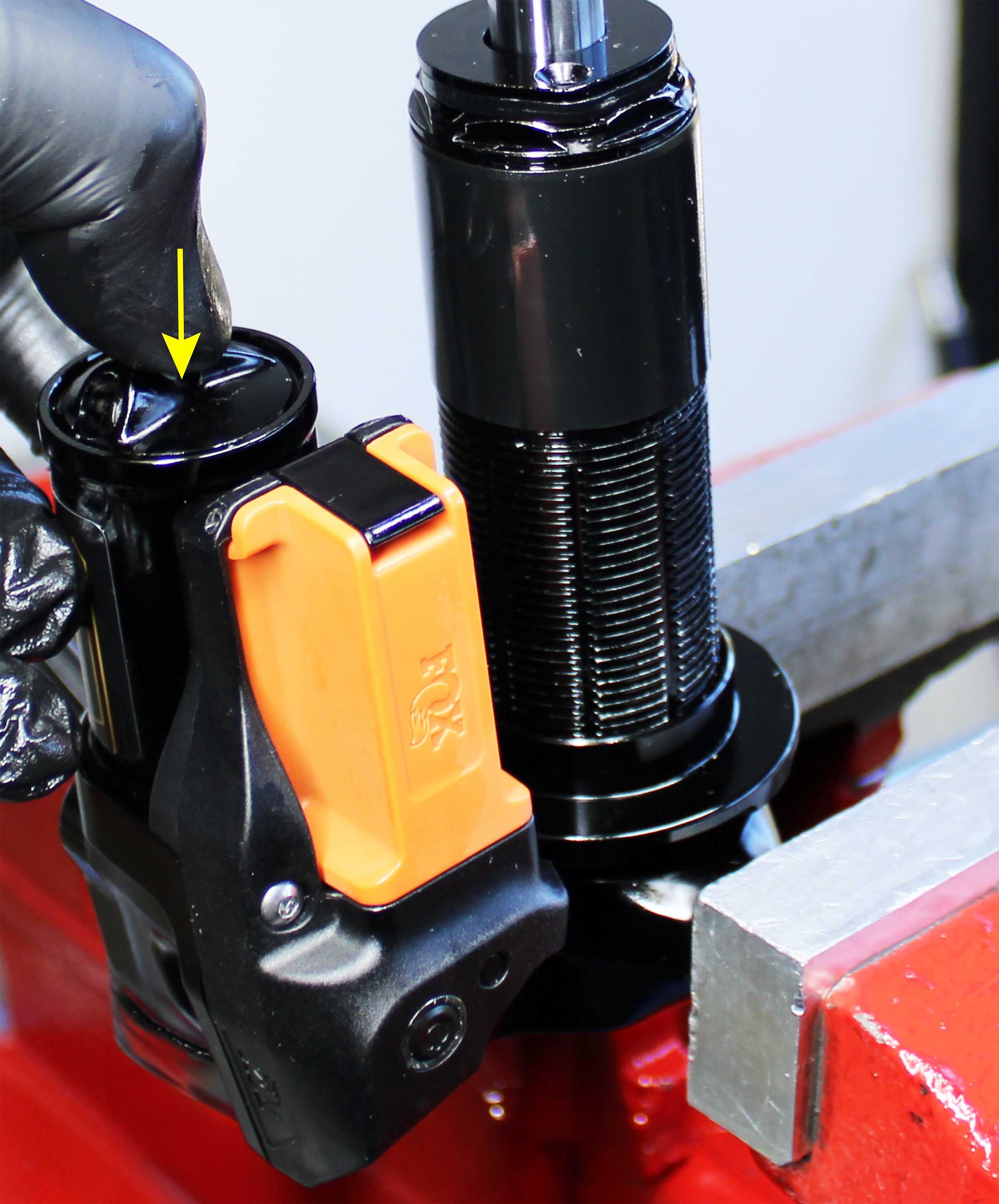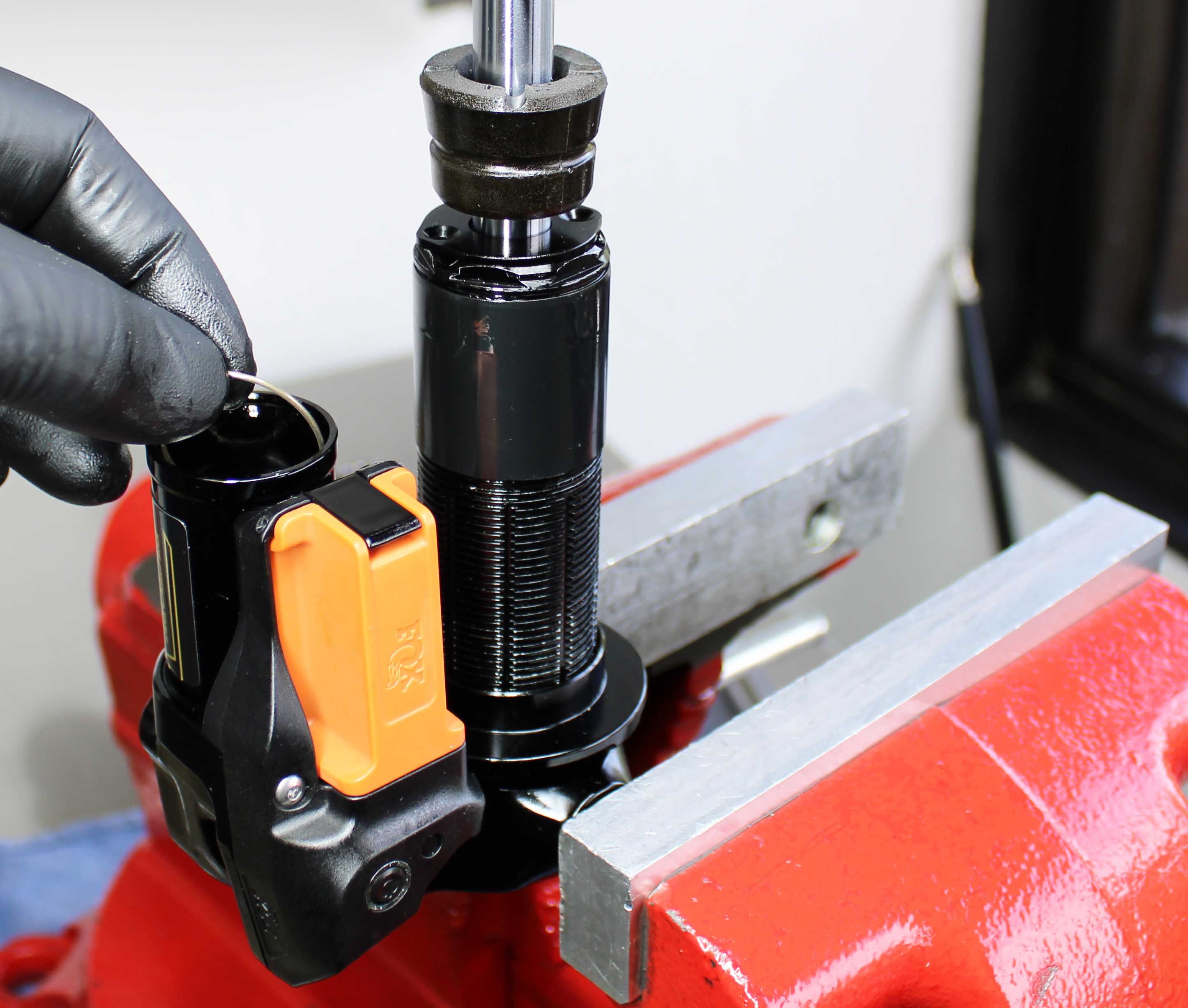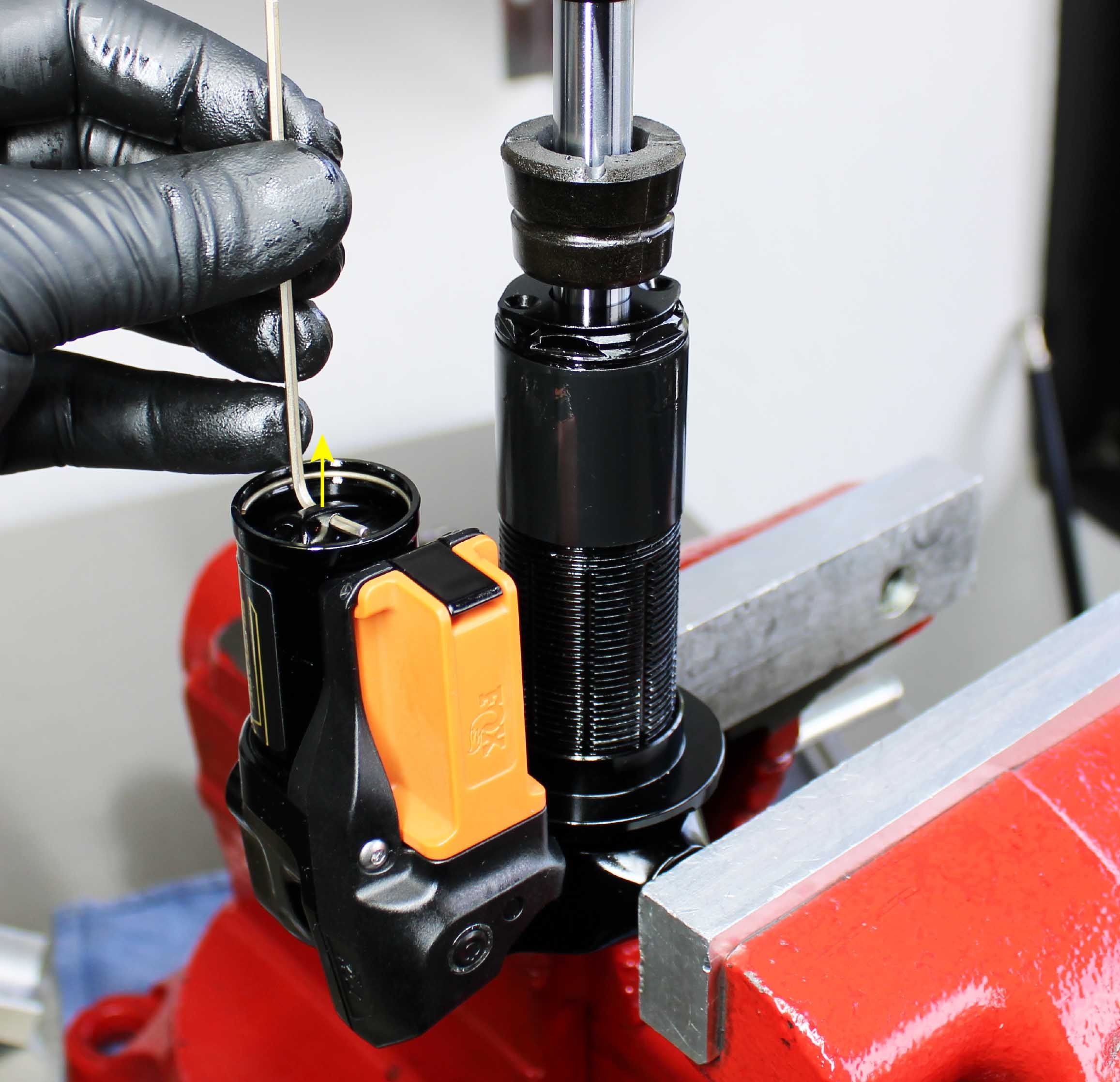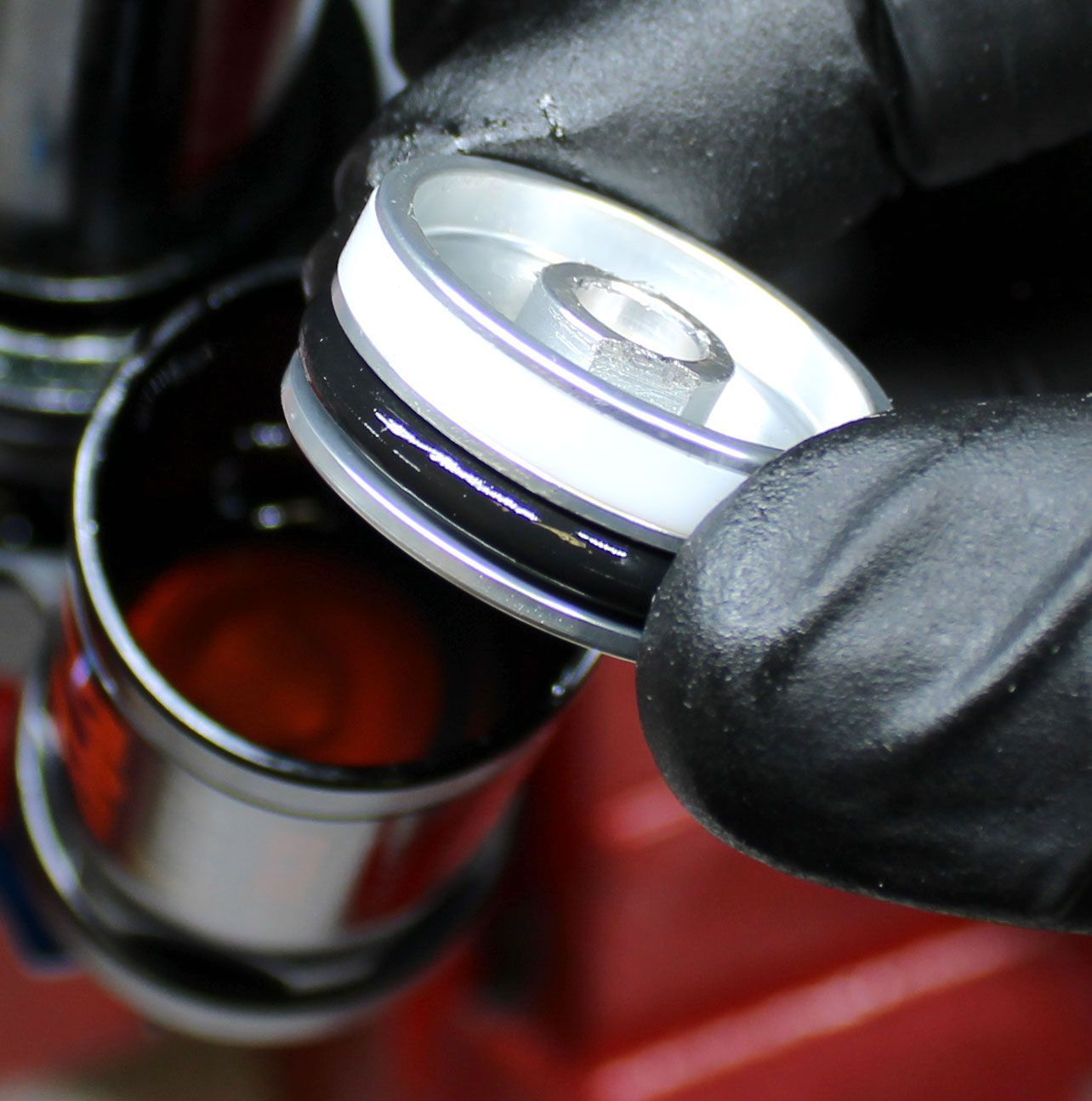Remove the wire retaining ring by pushing the center of the ring down which will cause the ends of the ring to pop up. Be careful not to scratch the IFP bore while removing or installing this ring. Coat the inside of the reservoir with a thin film of FOX 4wt. oil. Replace the o-ring of the reservoir end cap with a new greased one from the kit. Reisntall the reservoir end cap into the reservoir pushing down to allow for installation of the retaining ring.