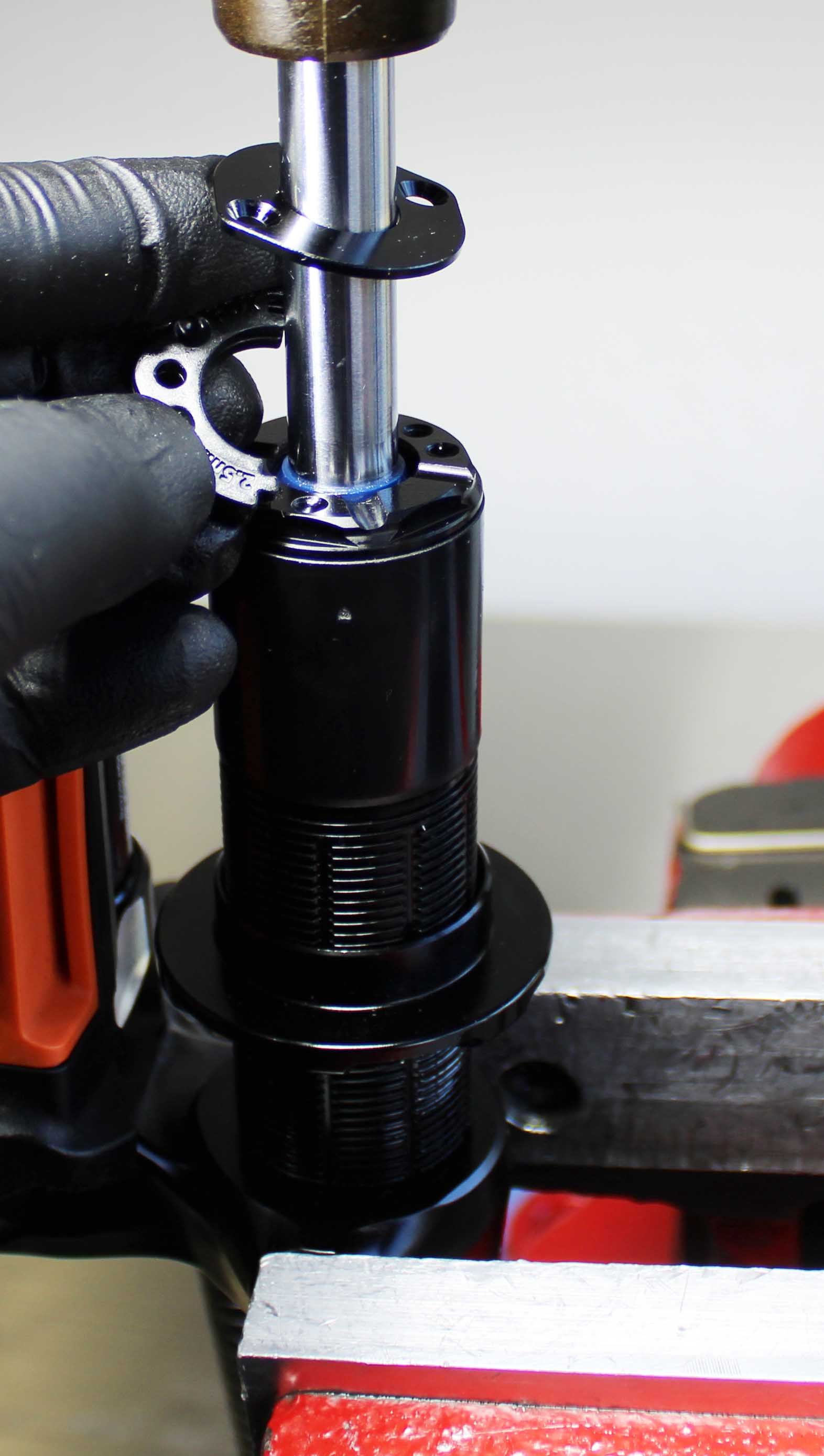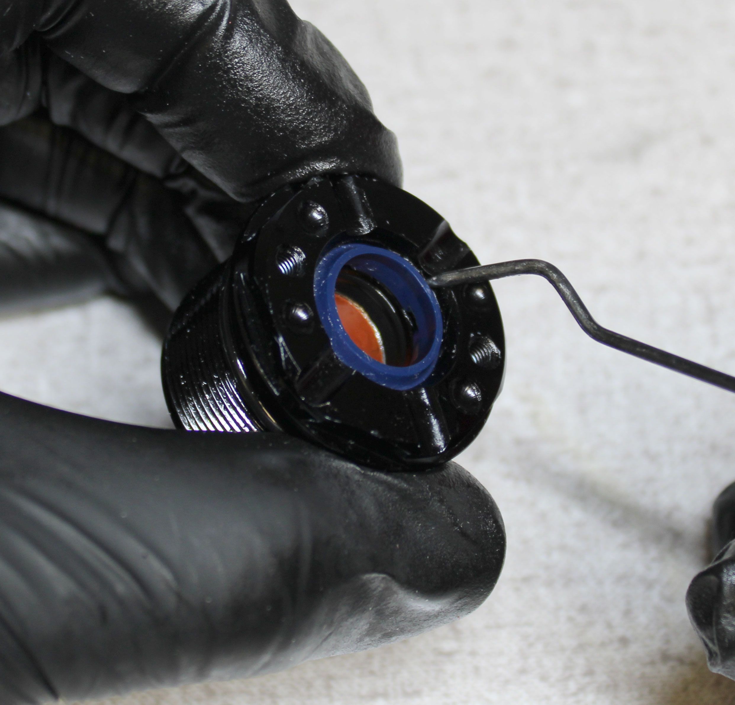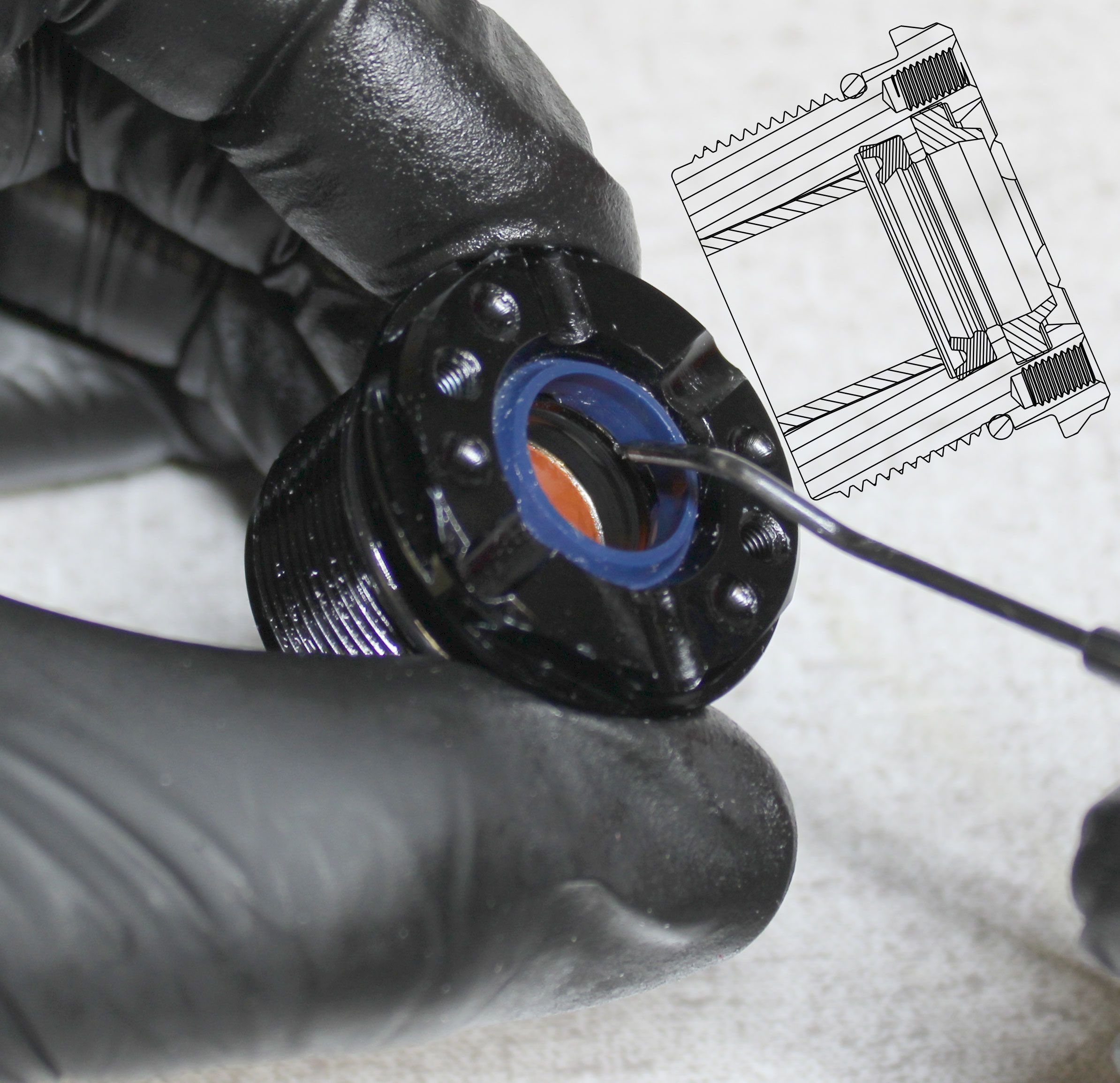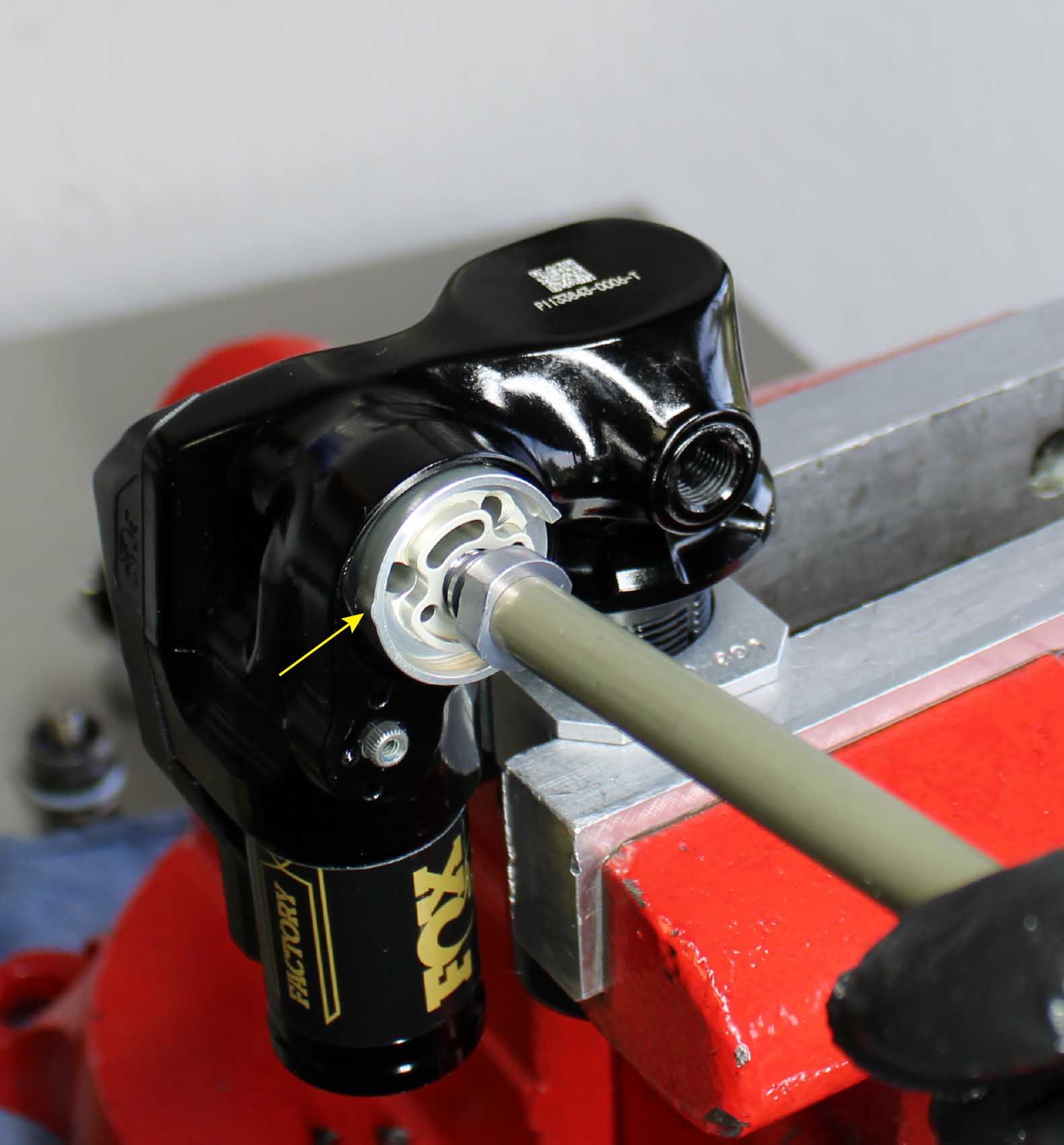 Remove the wire retaining ring by pushing the center of the ring down which will cause the ends of the ring to pop up. Be careful not to scratch the IFP bore while removing or installing this ring. Coat the inside of the reservoir with a thin film of FOX 4wt. oil. Replace the o-ring of the reservoir end cap with a new greased one from the kit. Reisntall the reservoir end cap into the reservoir pushing down to allow for installation of the retaining ring.