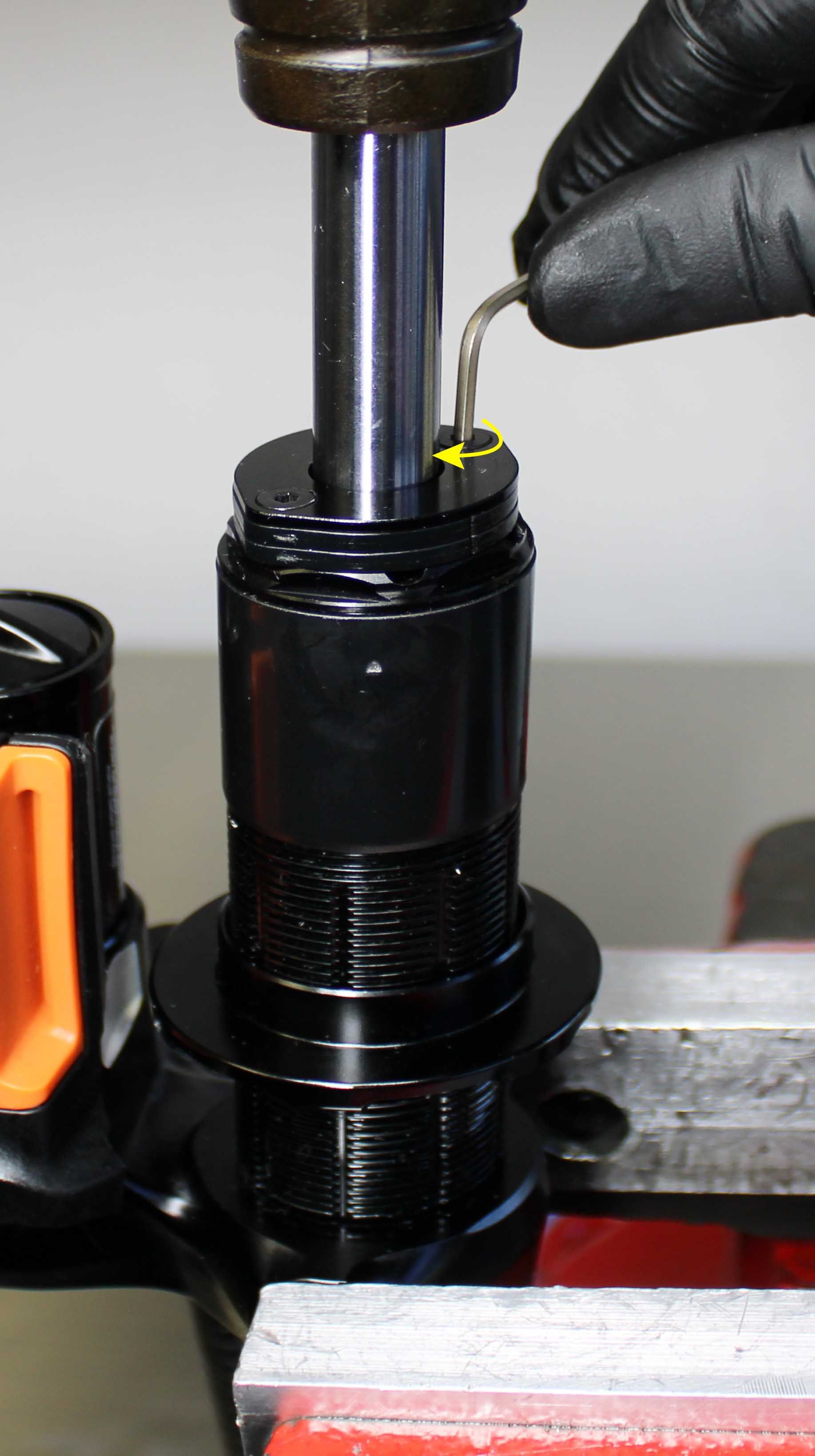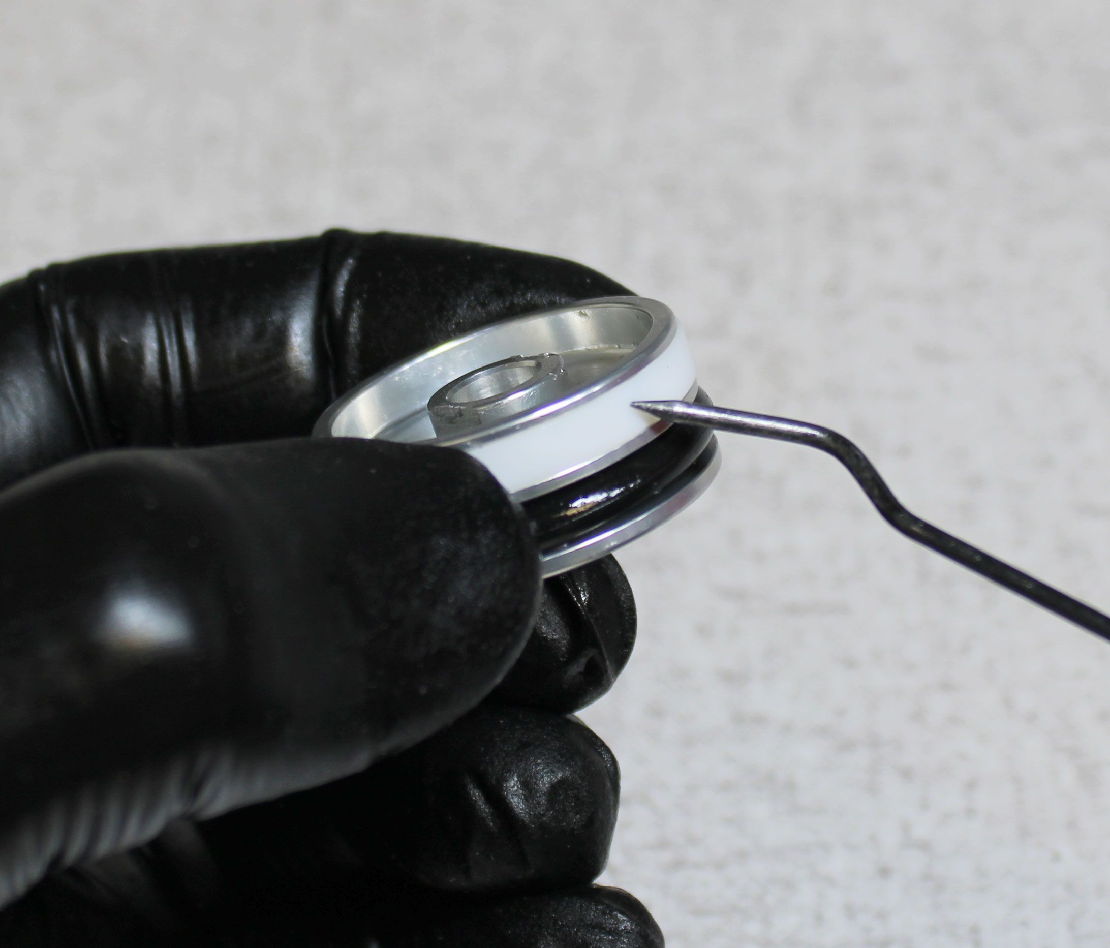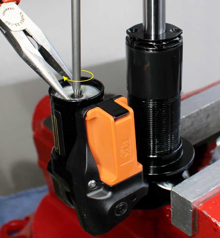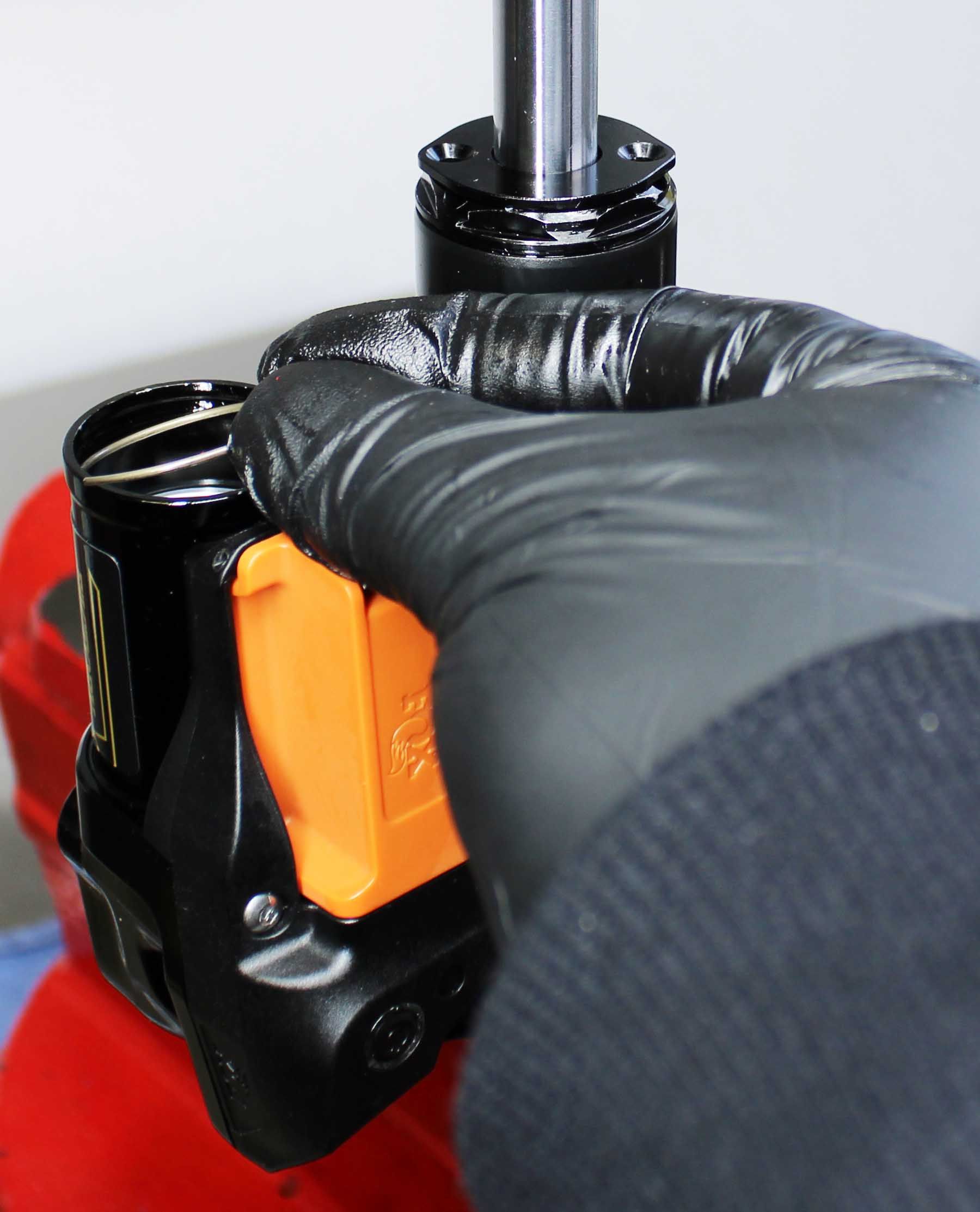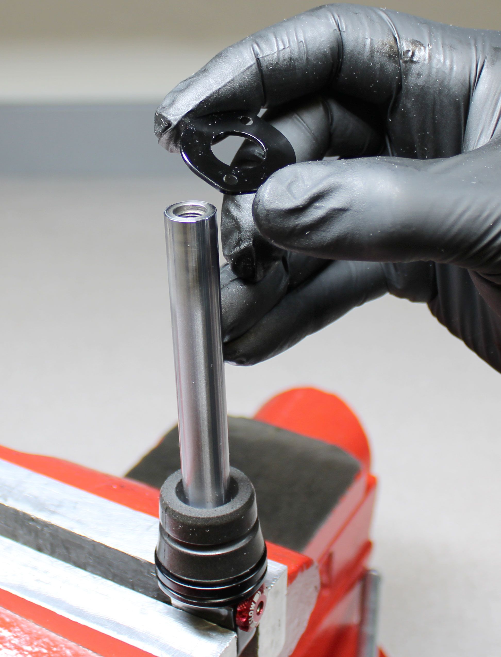 Remove the wire retaining ring by pushing the center of the ring down which will cause the ends of the ring to pop up. Be careful not to scratch the IFP bore while removing or installing this ring. Coat the inside of the reservoir with a thin film of FOX 4wt. oil. Replace the o-ring of the reservoir end cap with a new greased one from the kit. Reisntall the reservoir end cap into the reservoir pushing down to allow for installation of the retaining ring.