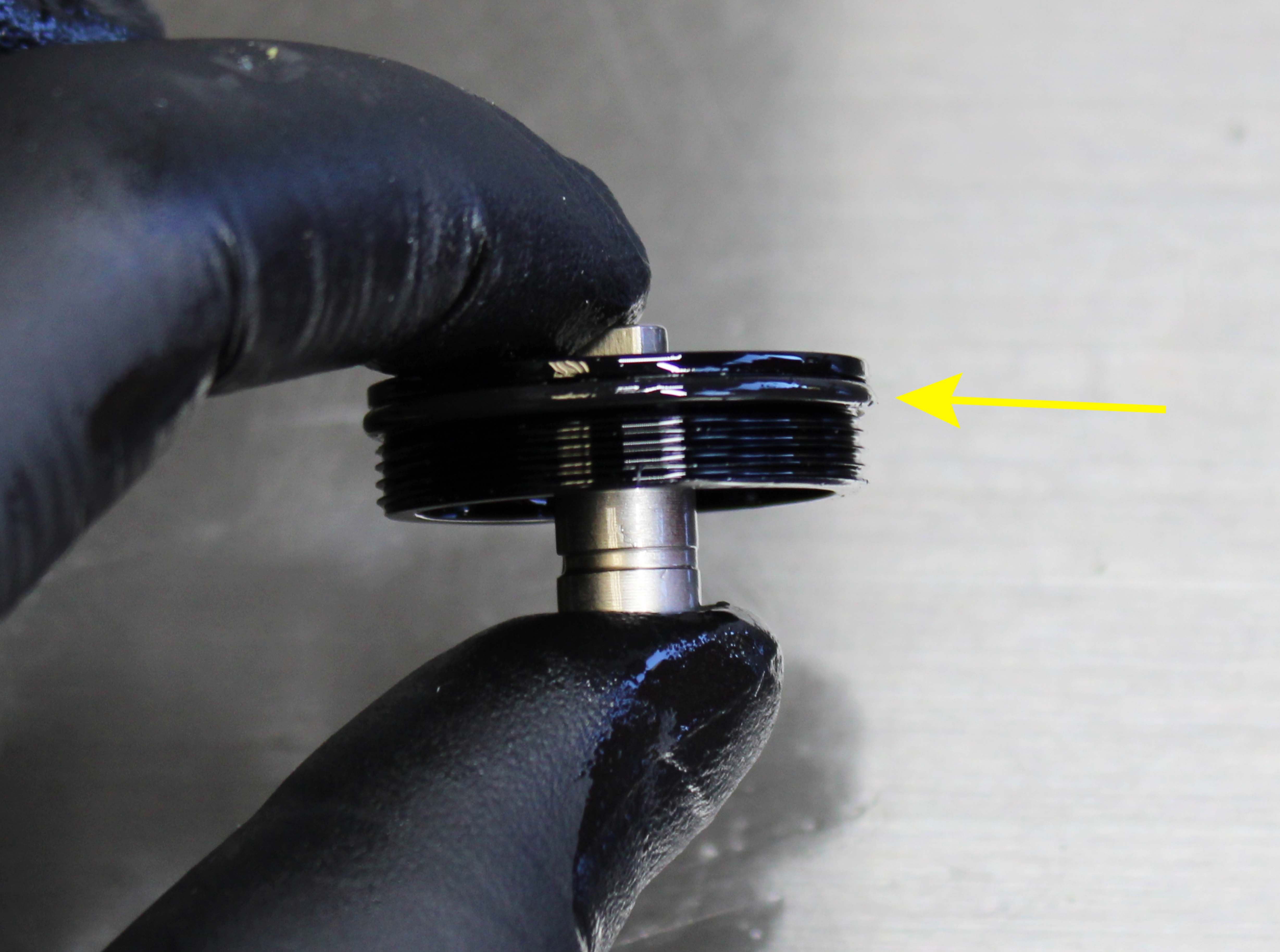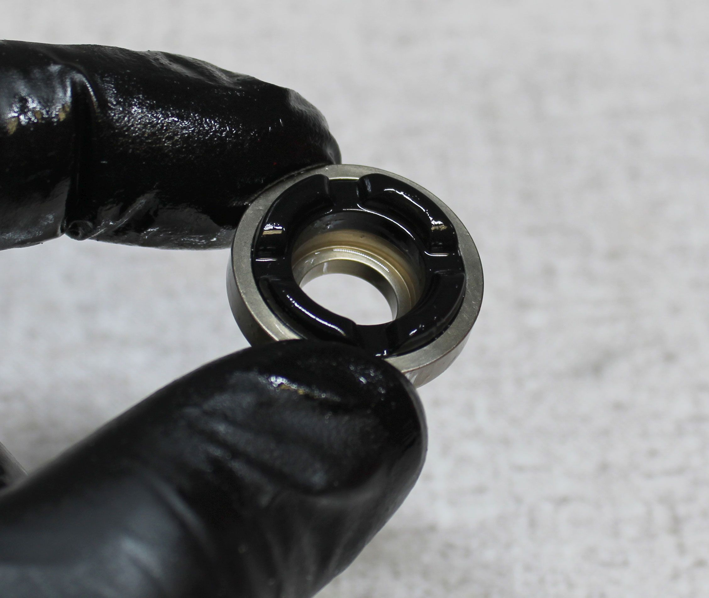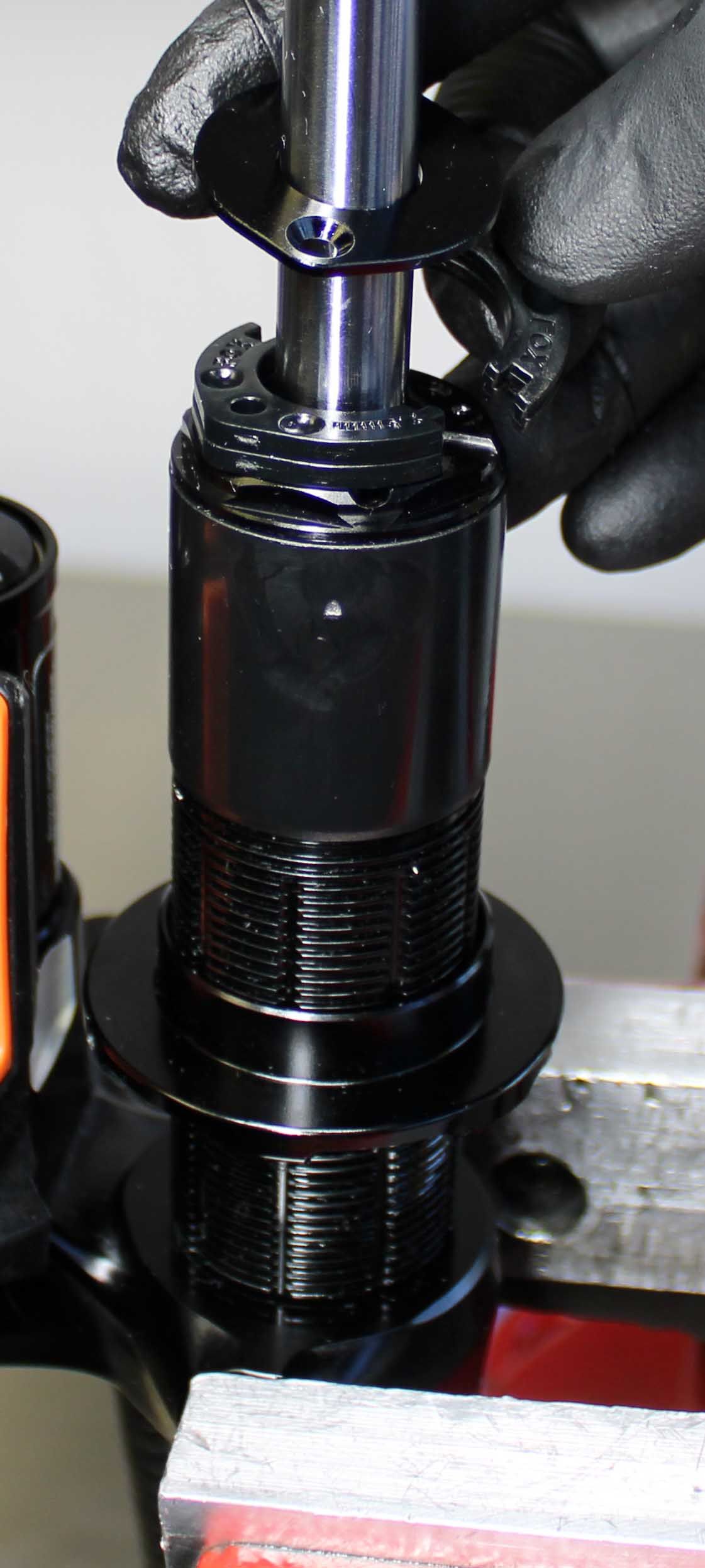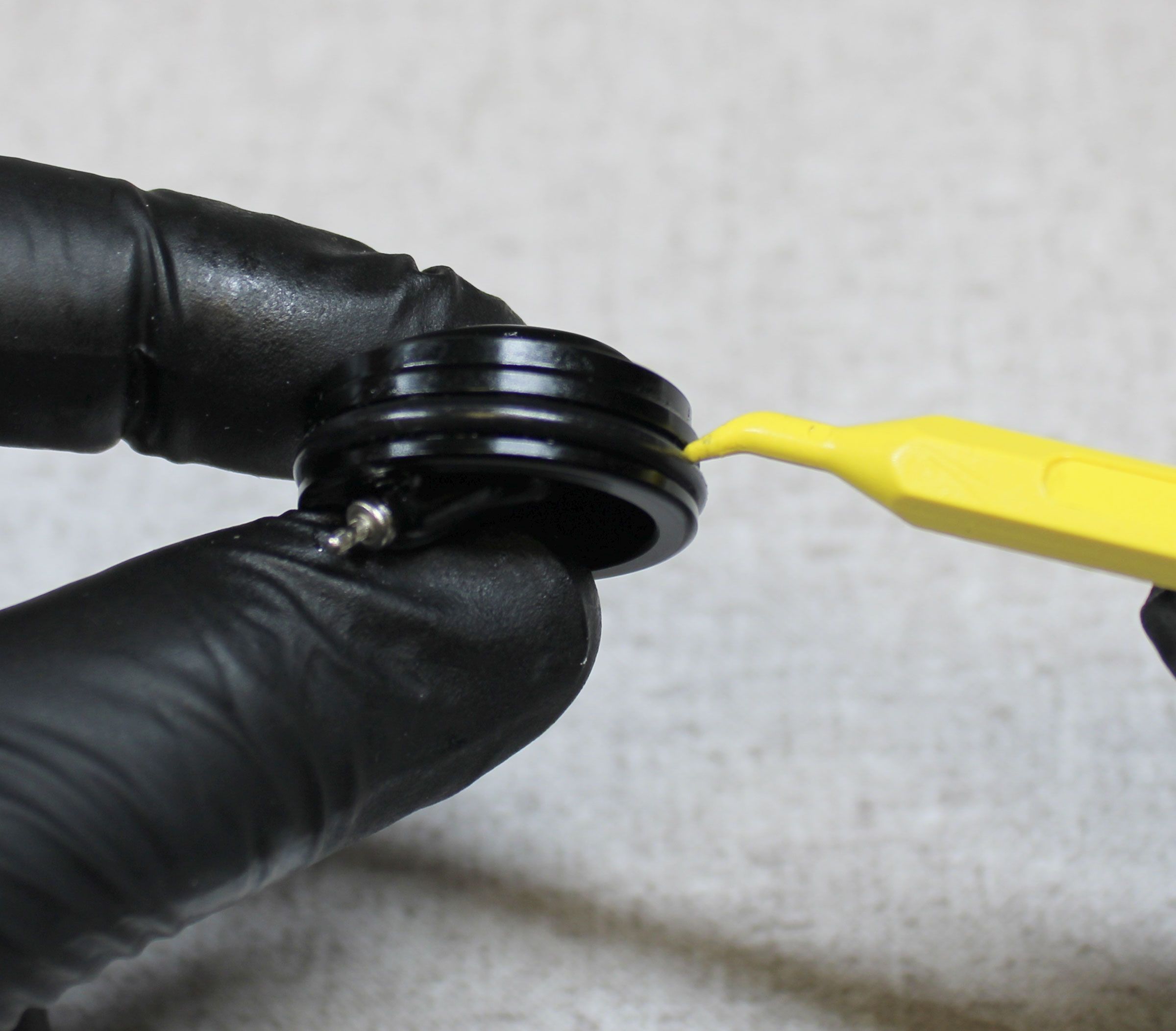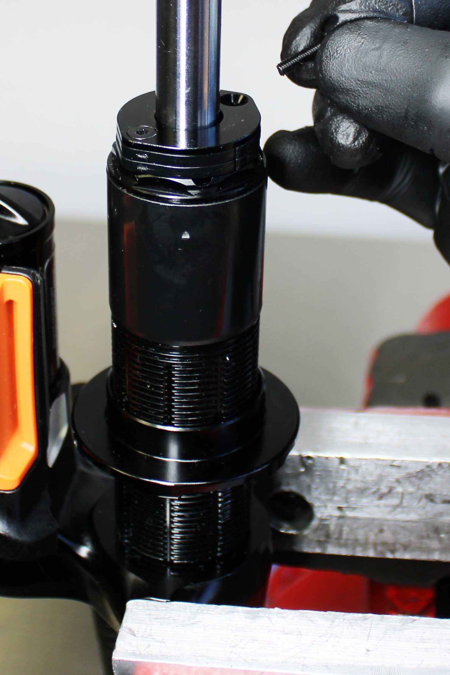 Remove the wire retaining ring by pushing the center of the ring down which will cause the ends of the ring to pop up. Be careful not to scratch the IFP bore while removing or installing this ring. Coat the inside of the reservoir with a thin film of FOX 4wt. oil. Replace the o-ring of the reservoir end cap with a new greased one from the kit. Reisntall the reservoir end cap into the reservoir pushing down to allow for installation of the retaining ring.