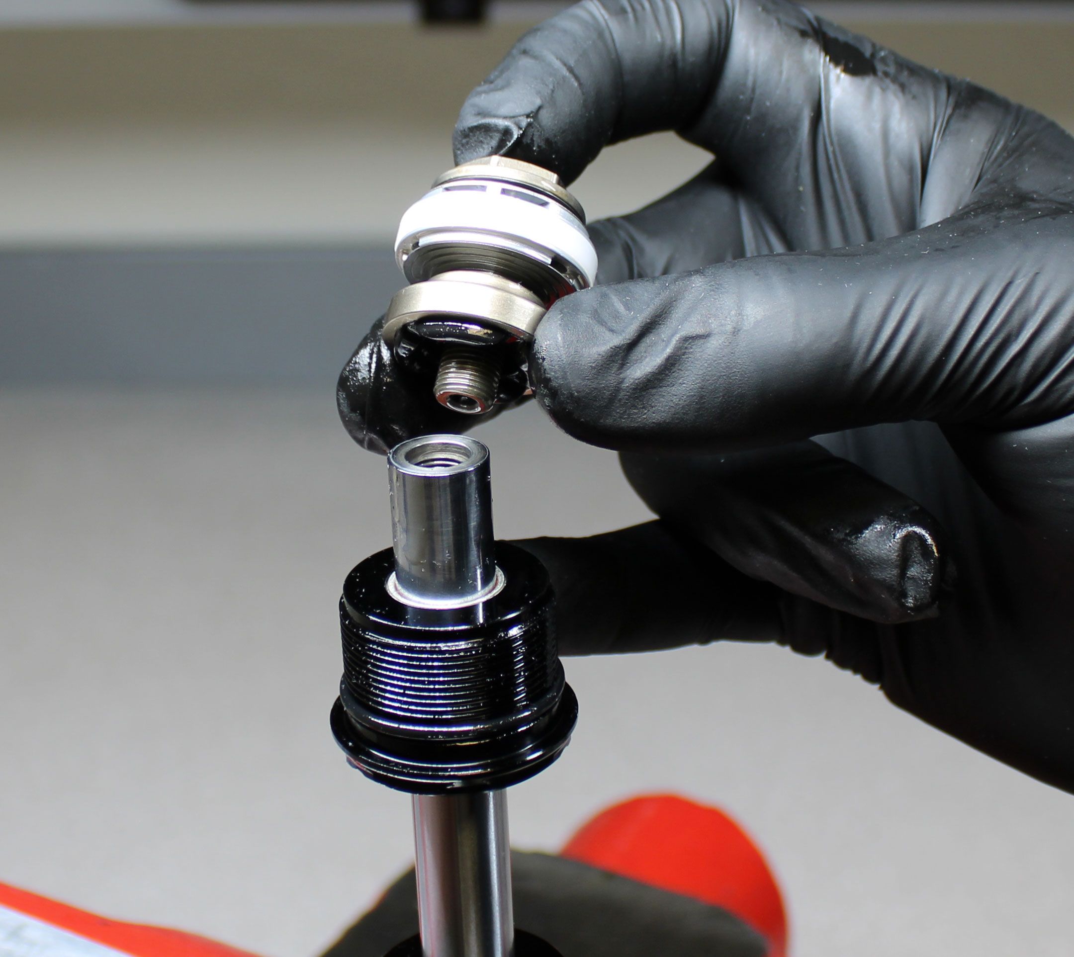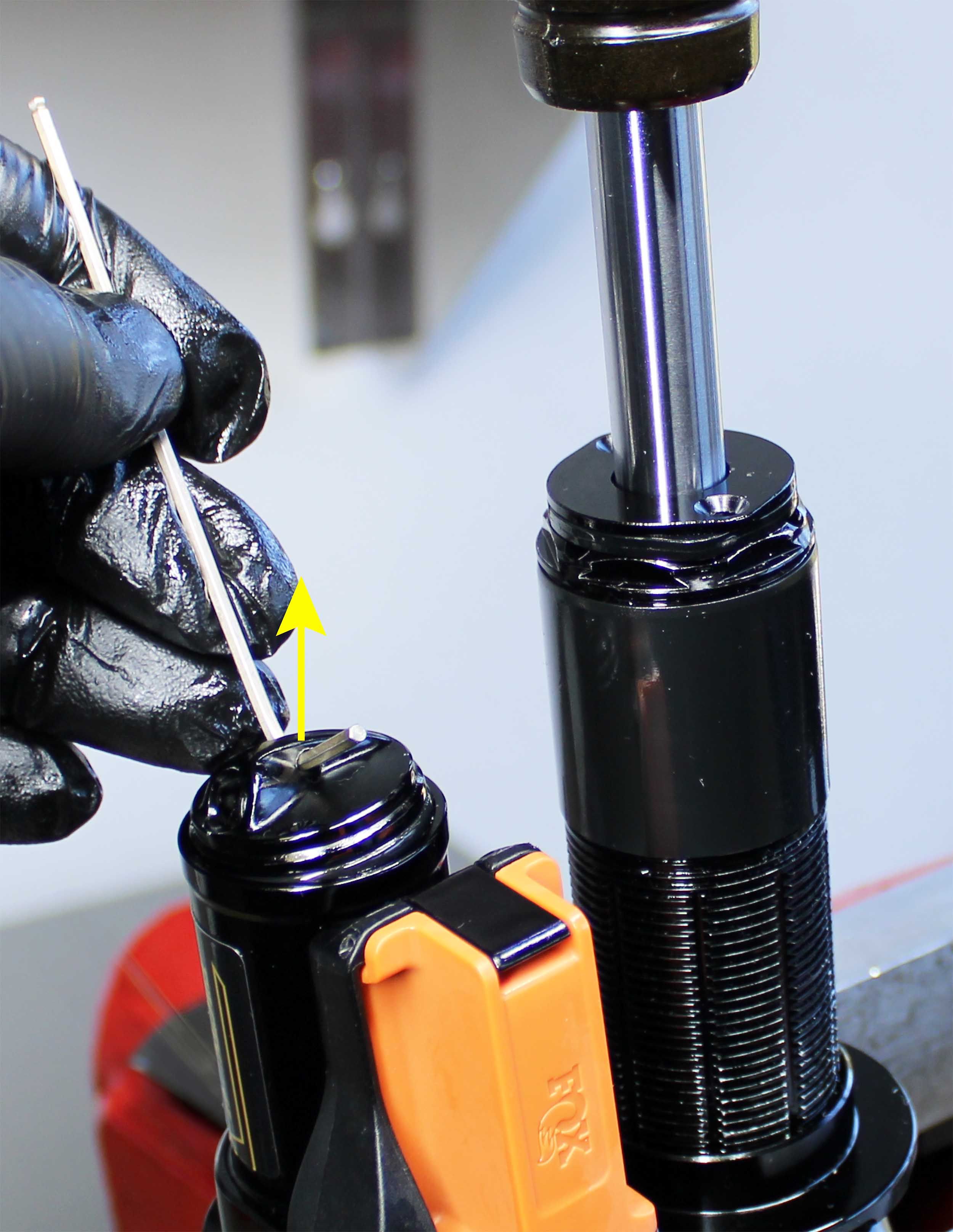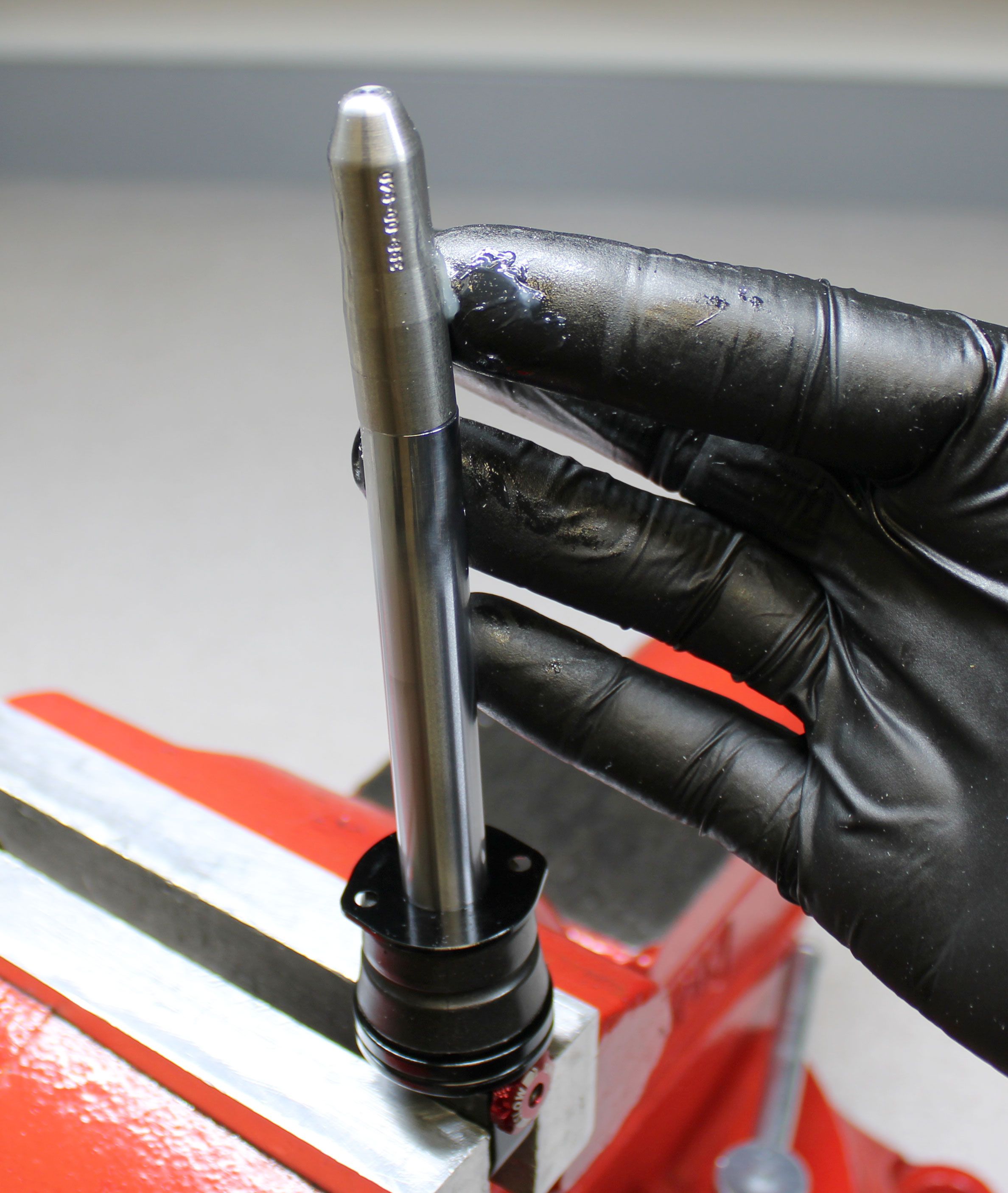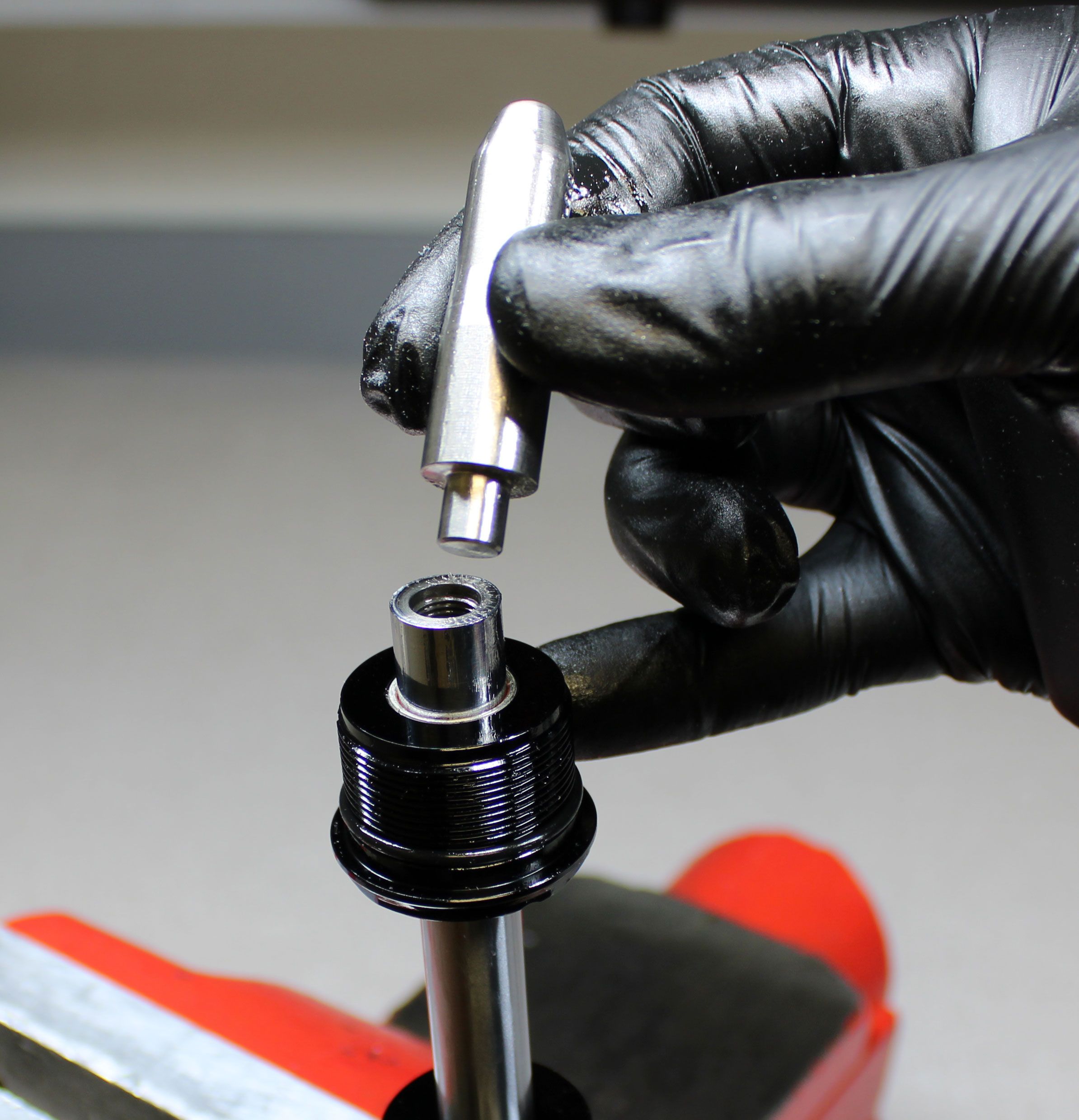Make sure the ball bearing is in place on the end of the rebound rod, then coat the ball with a thick film of Ultraplex LT2 or Stay Lube SL3125 waterproof grease. Reinstall the rebound rod, ball end first, into the shaft. Use a non-marring tool to push the rebound rod into the shaft while you turn the red rebound knob counter-clockwise until it comes to a gentle stop.