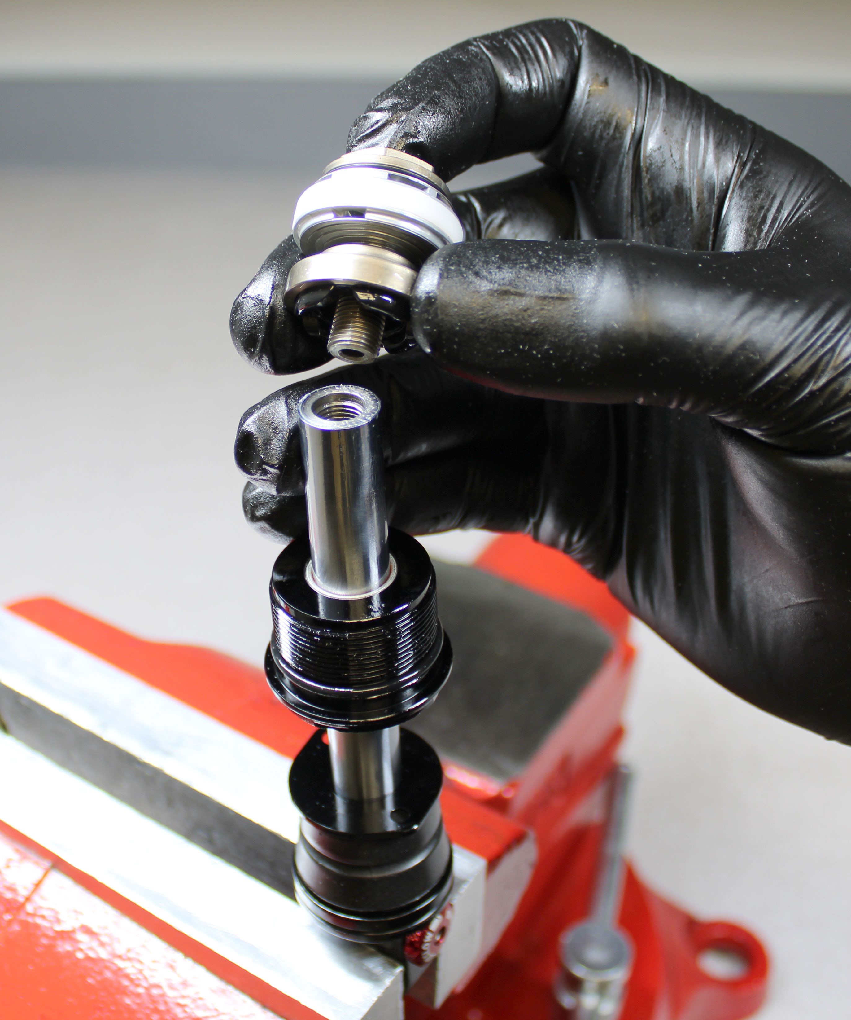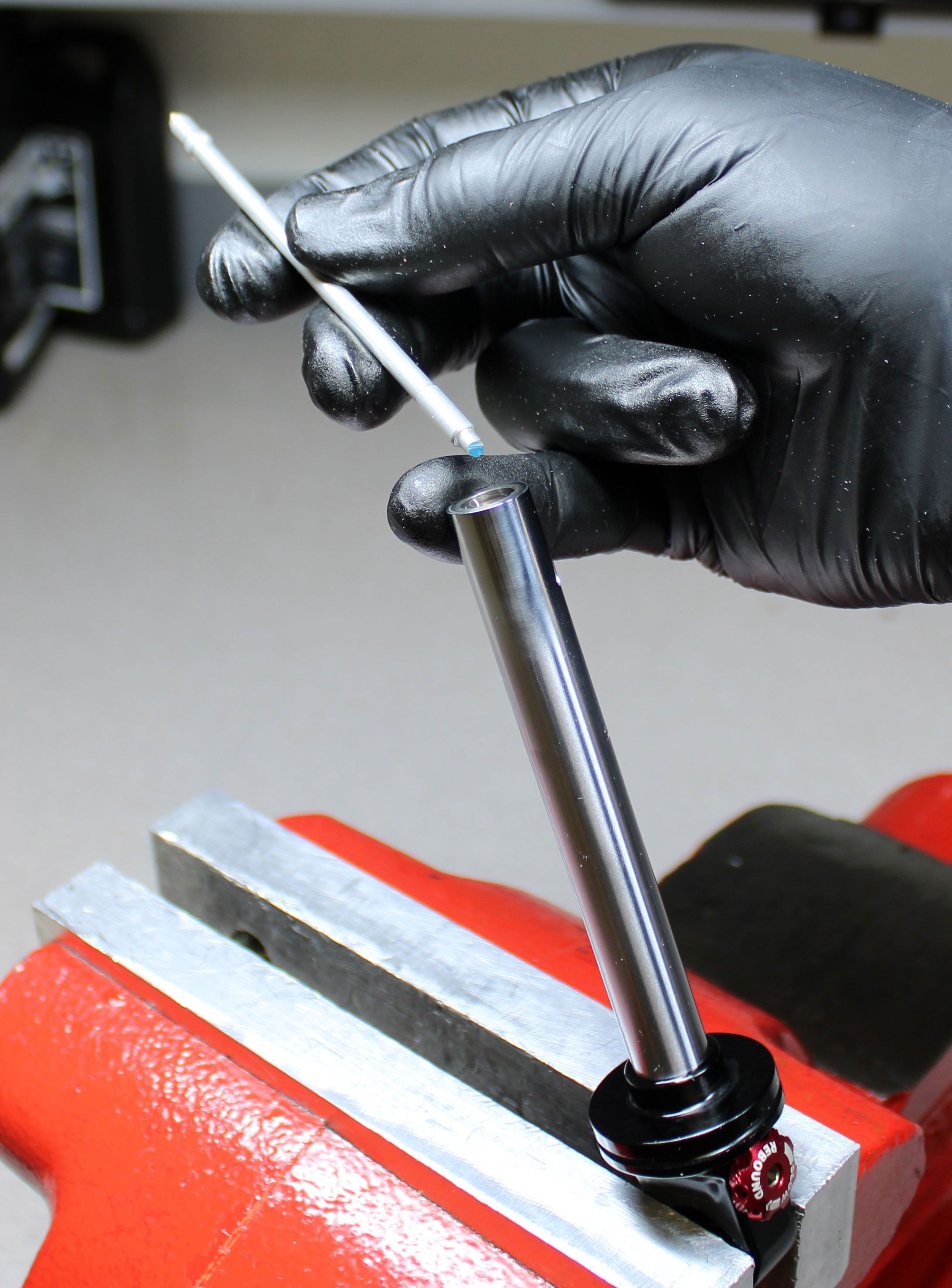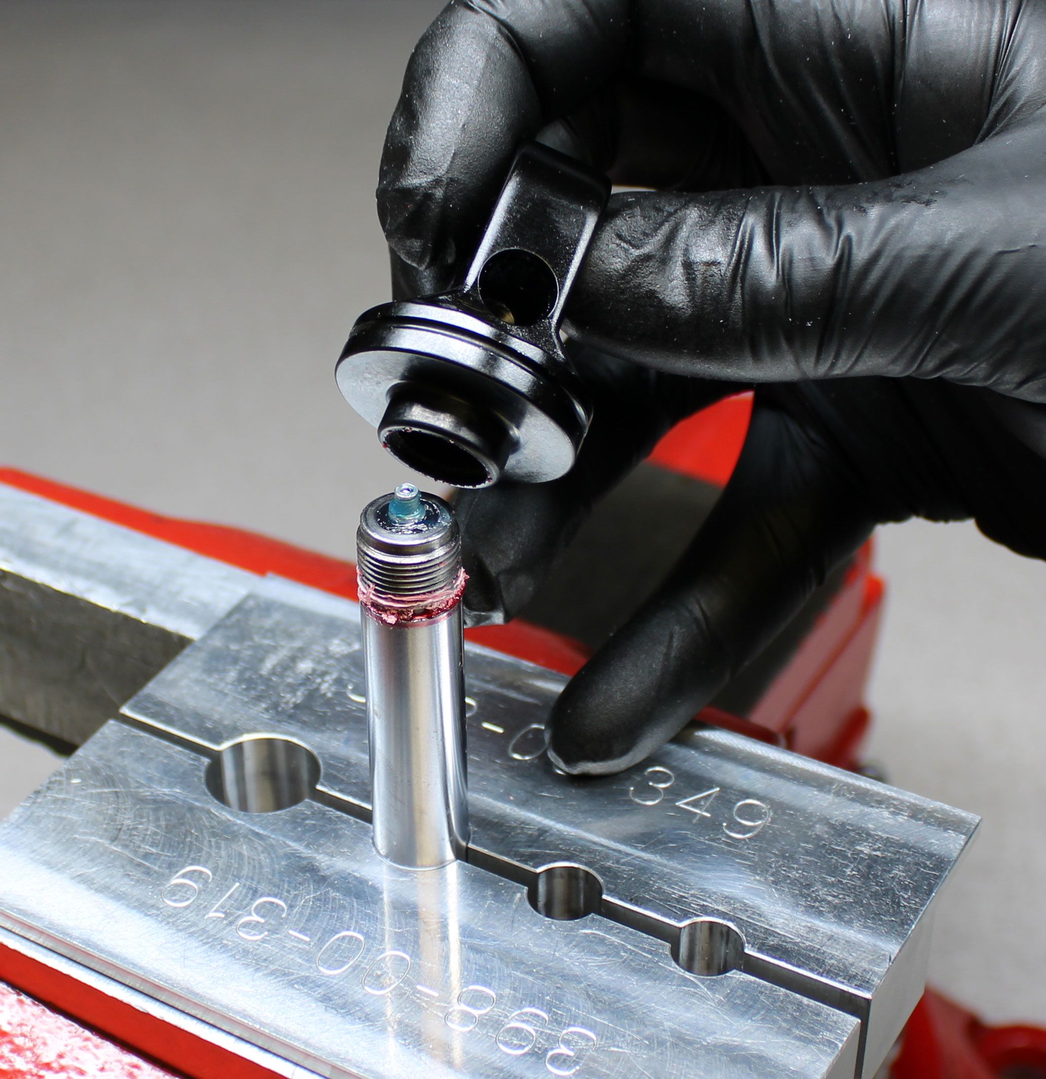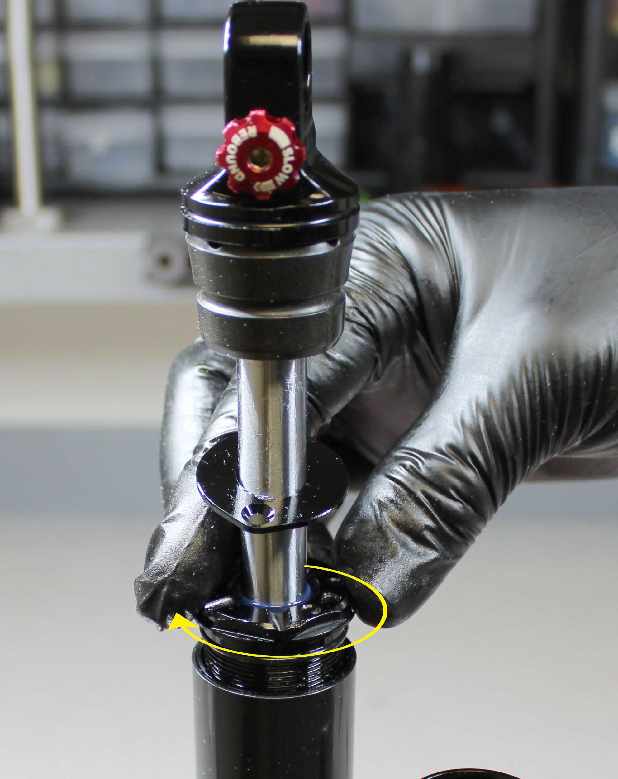 Make sure the ball bearing is in place on the end of the rebound rod, then coat the ball with a thick film of Ultraplex LT2 or Stay Lube SL3125 waterproof grease. Reinstall the rebound rod, ball end first, into the shaft. Use a non-marring tool to push the rebound rod into the shaft while you turn the red rebound knob counter-clockwise until it comes to a gentle stop.