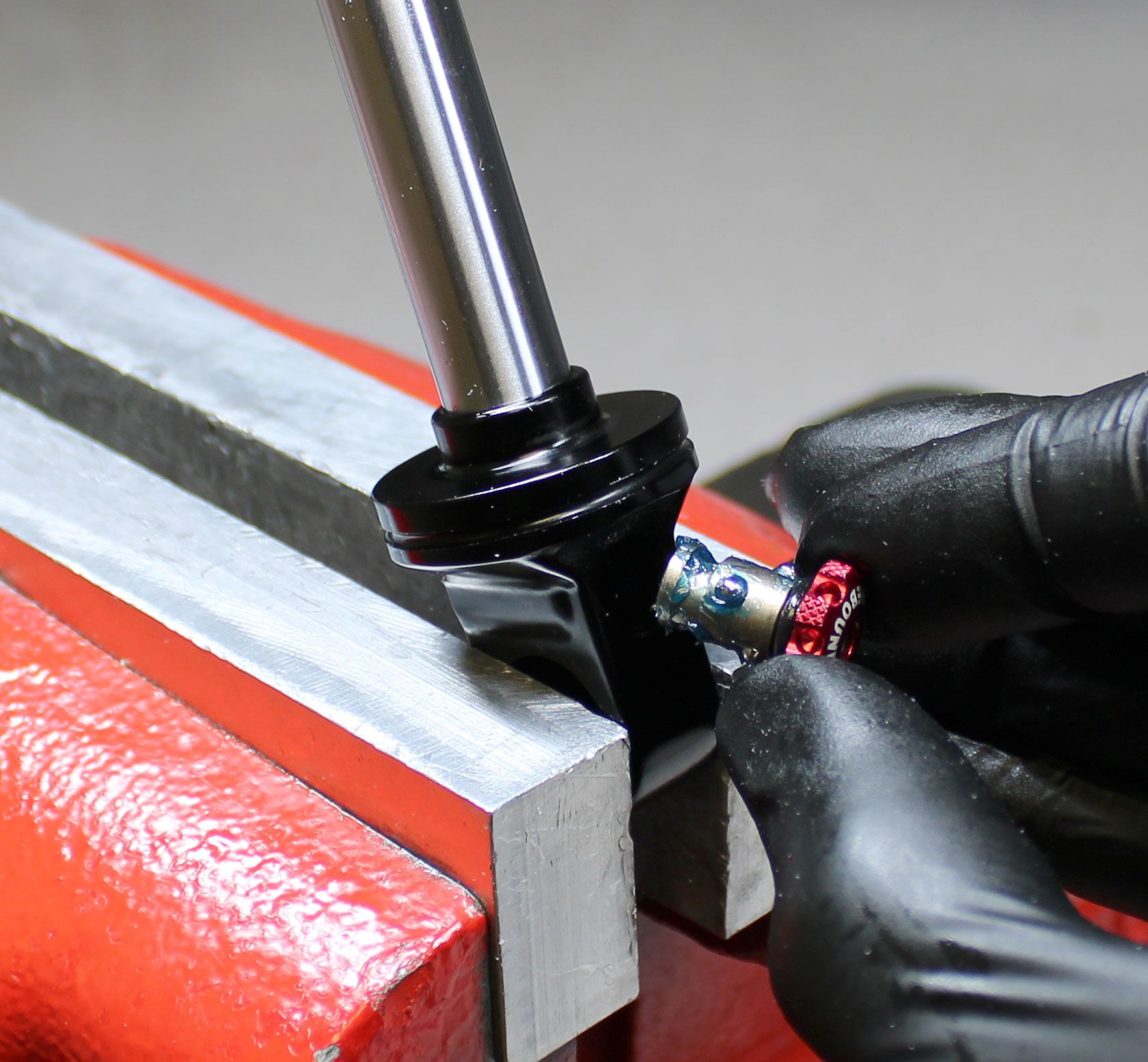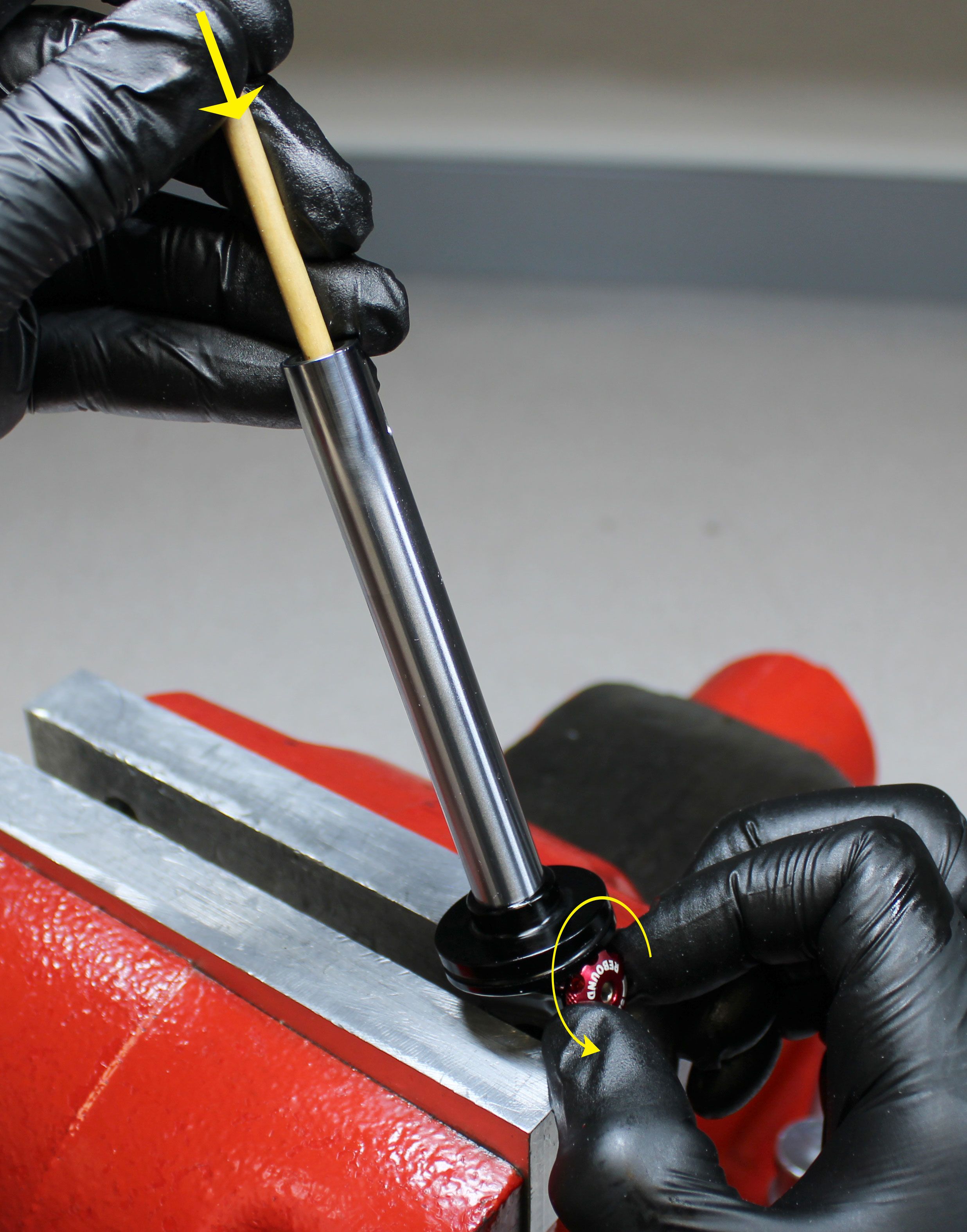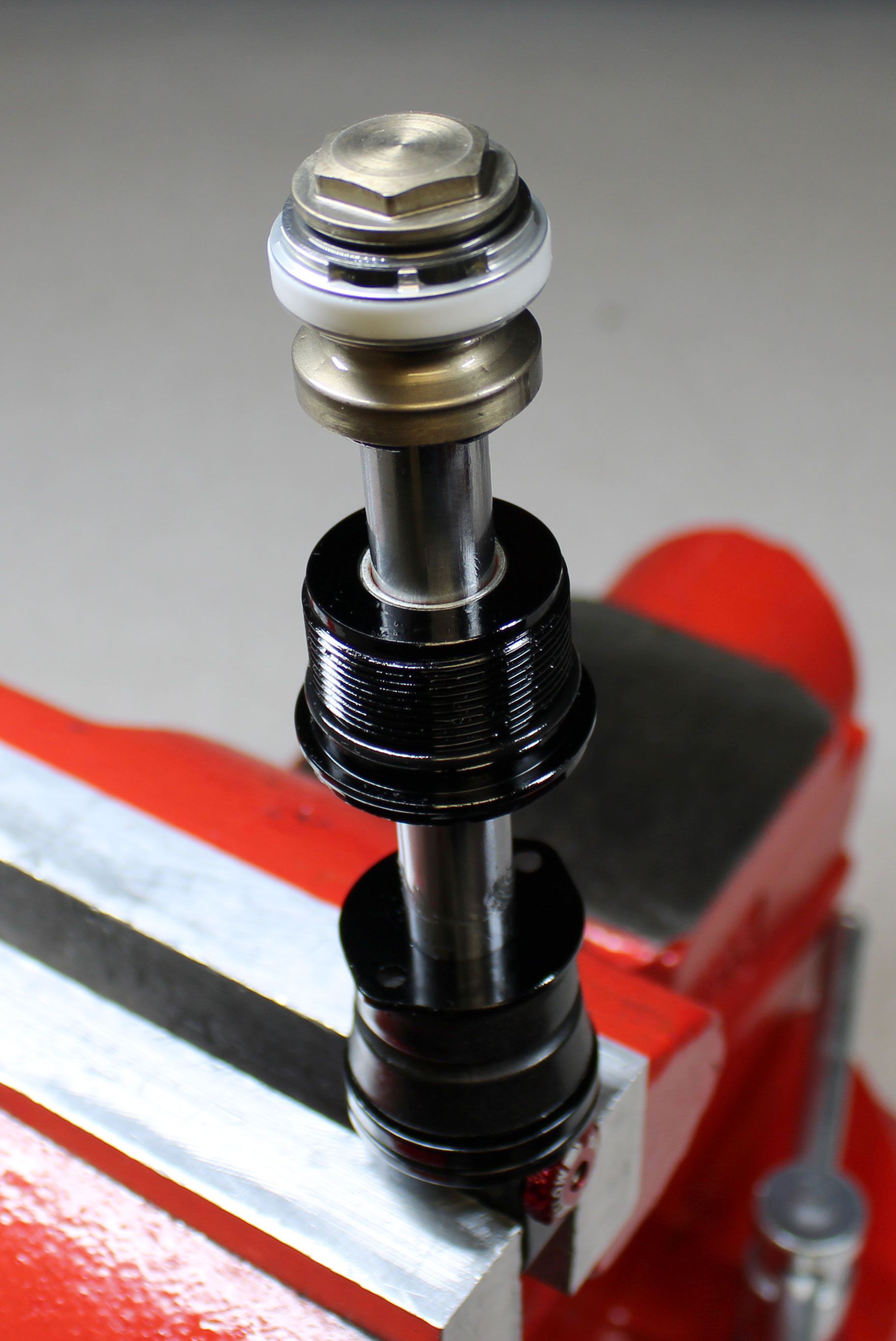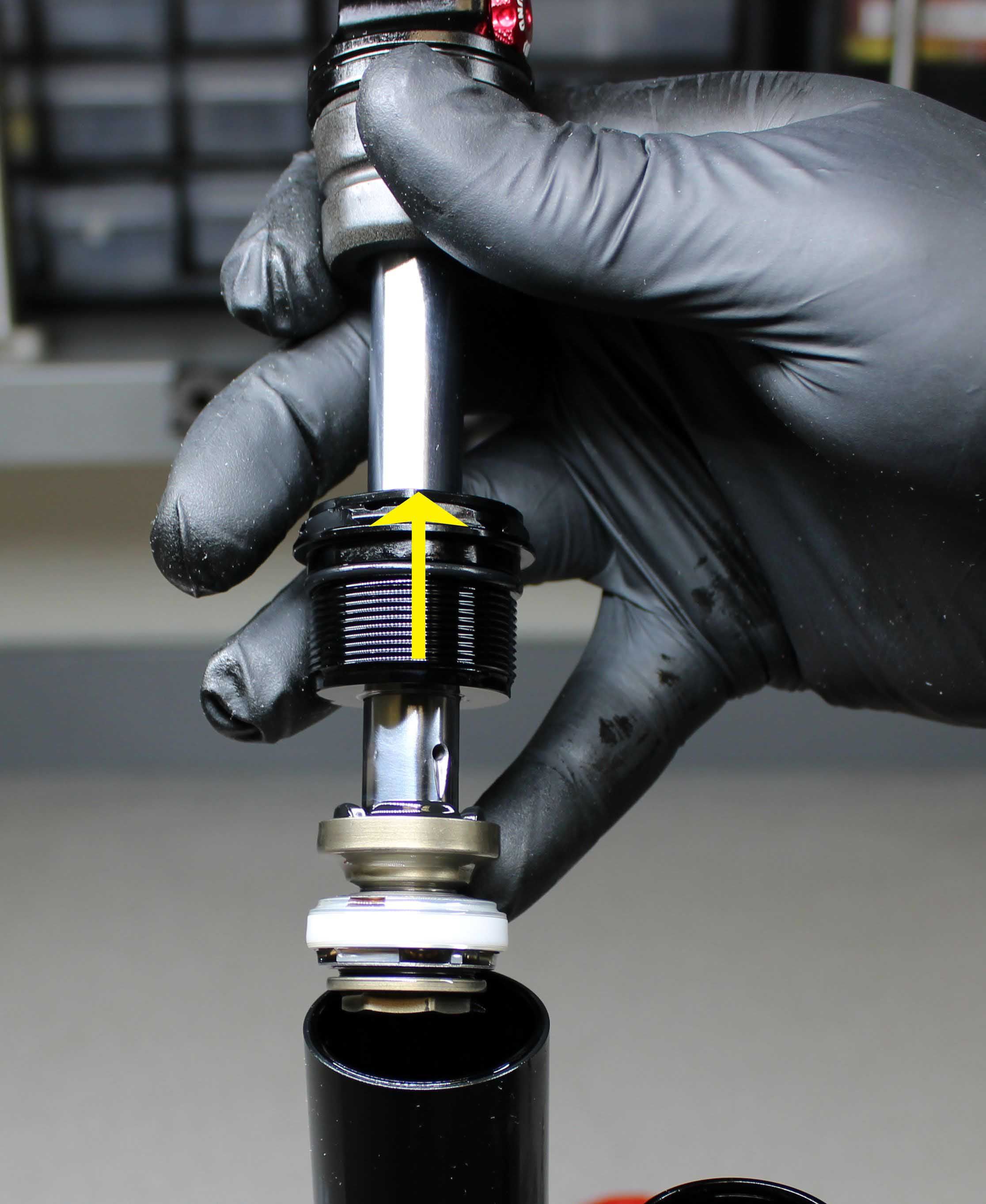 Make sure the ball bearing is in place on the end of the rebound rod, then coat the ball with a thick film of Ultraplex LT2 or Stay Lube SL3125 waterproof grease. Reinstall the rebound rod, ball end first, into the shaft. Use a non-marring tool to push the rebound rod into the shaft while you turn the red rebound knob counter-clockwise until it comes to a gentle stop.