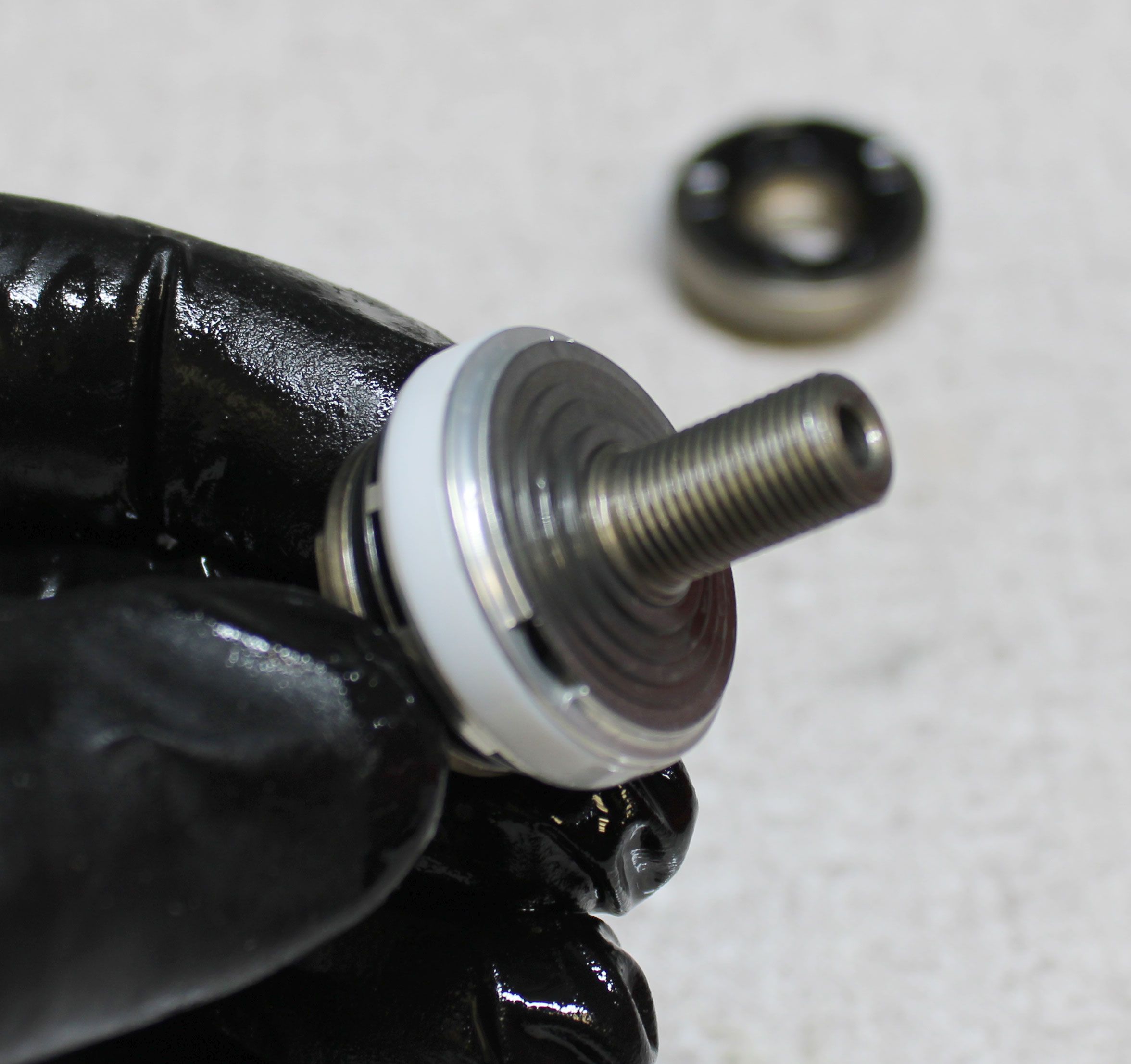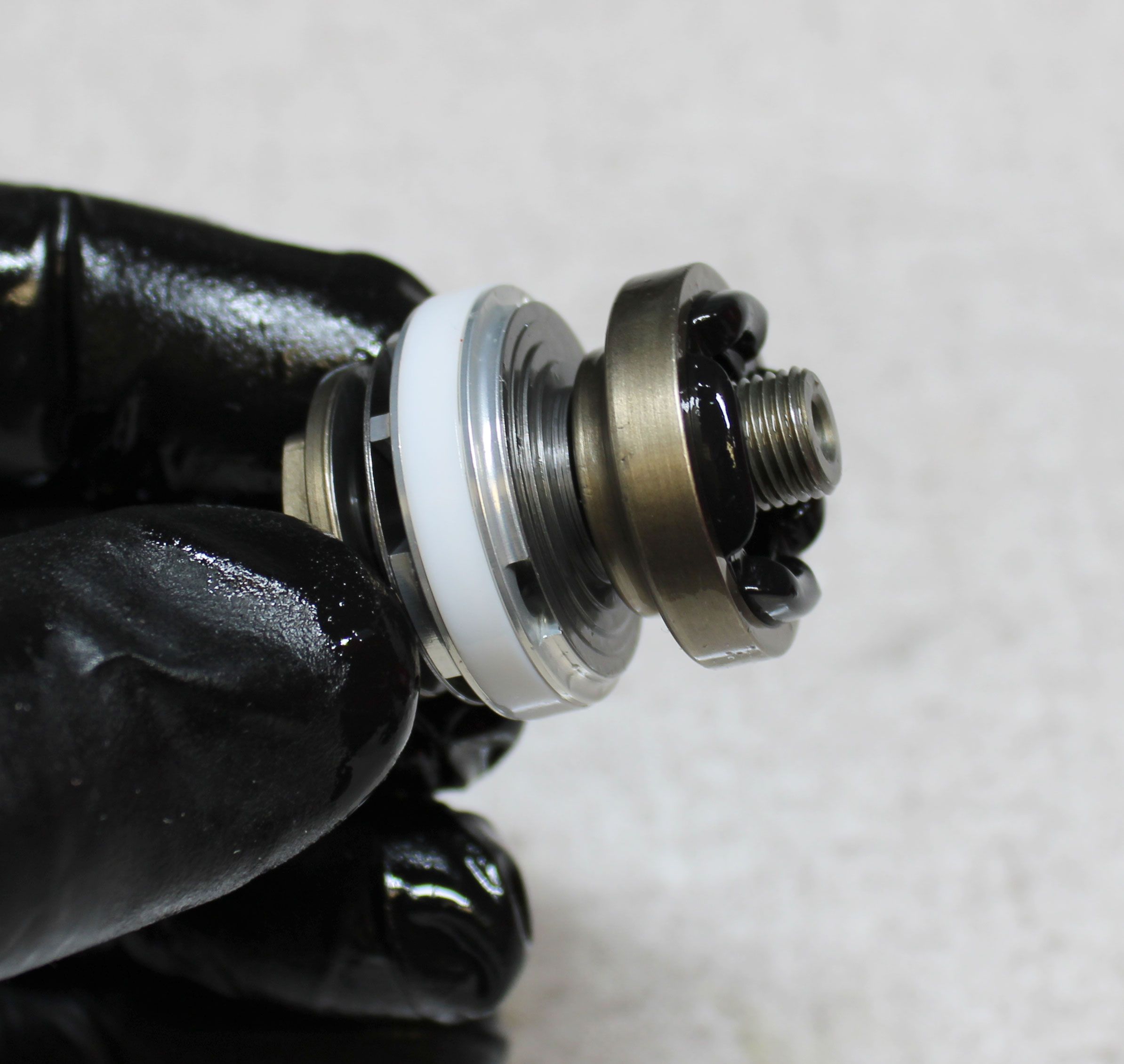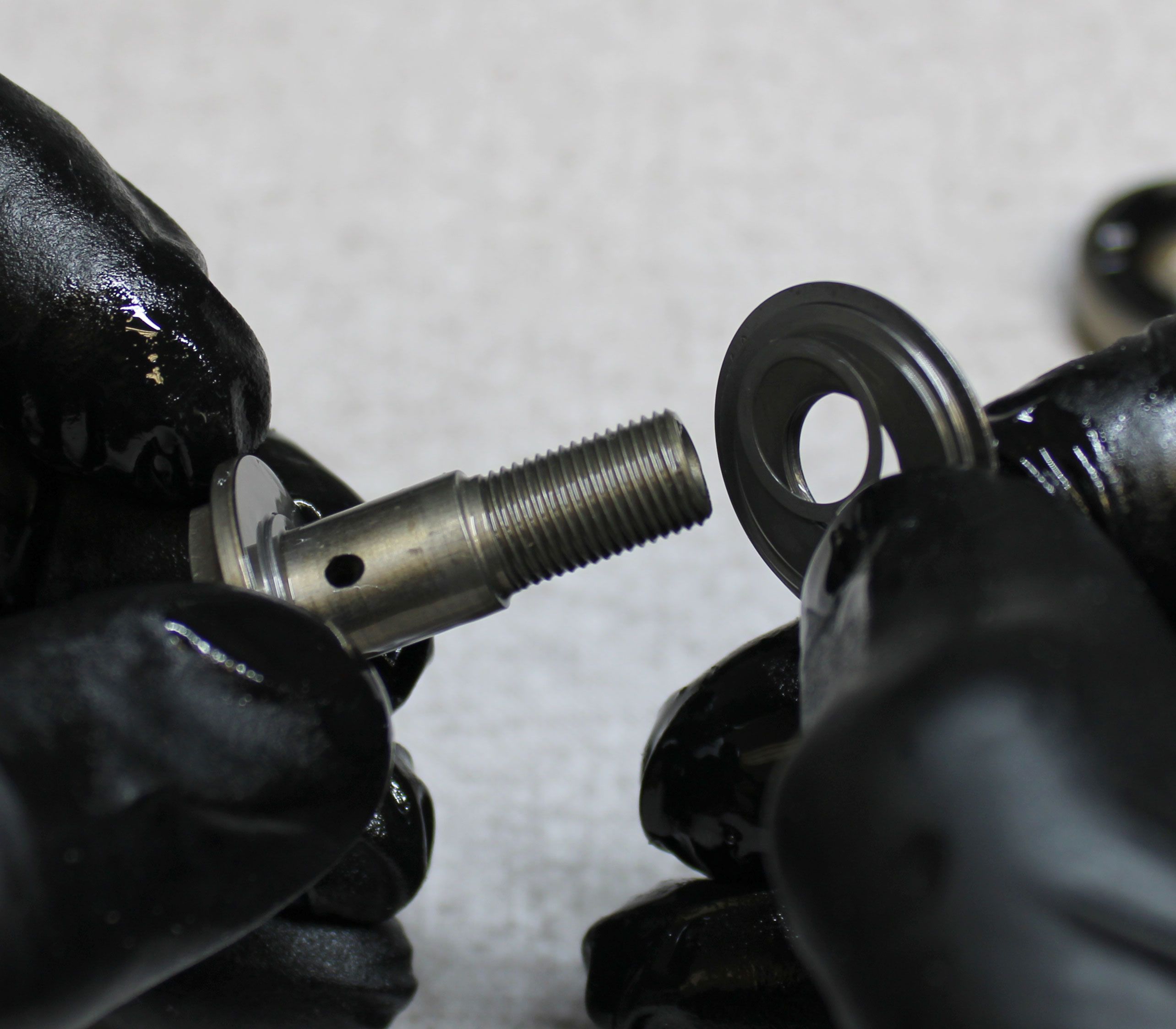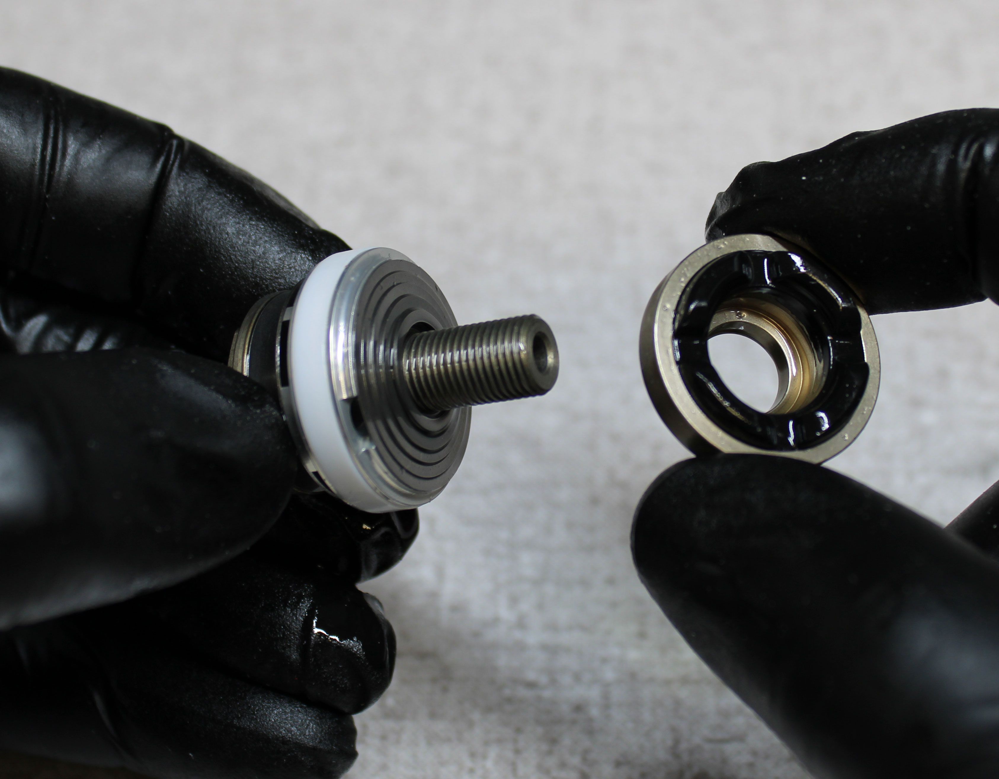 Make sure the ball bearing is in place on the end of the rebound rod, then coat the ball with a thick film of Ultraplex LT2 or Stay Lube SL3125 waterproof grease. Reinstall the rebound rod, ball end first, into the shaft. Use a non-marring tool to push the rebound rod into the shaft while you turn the red rebound knob counter-clockwise until it comes to a gentle stop.