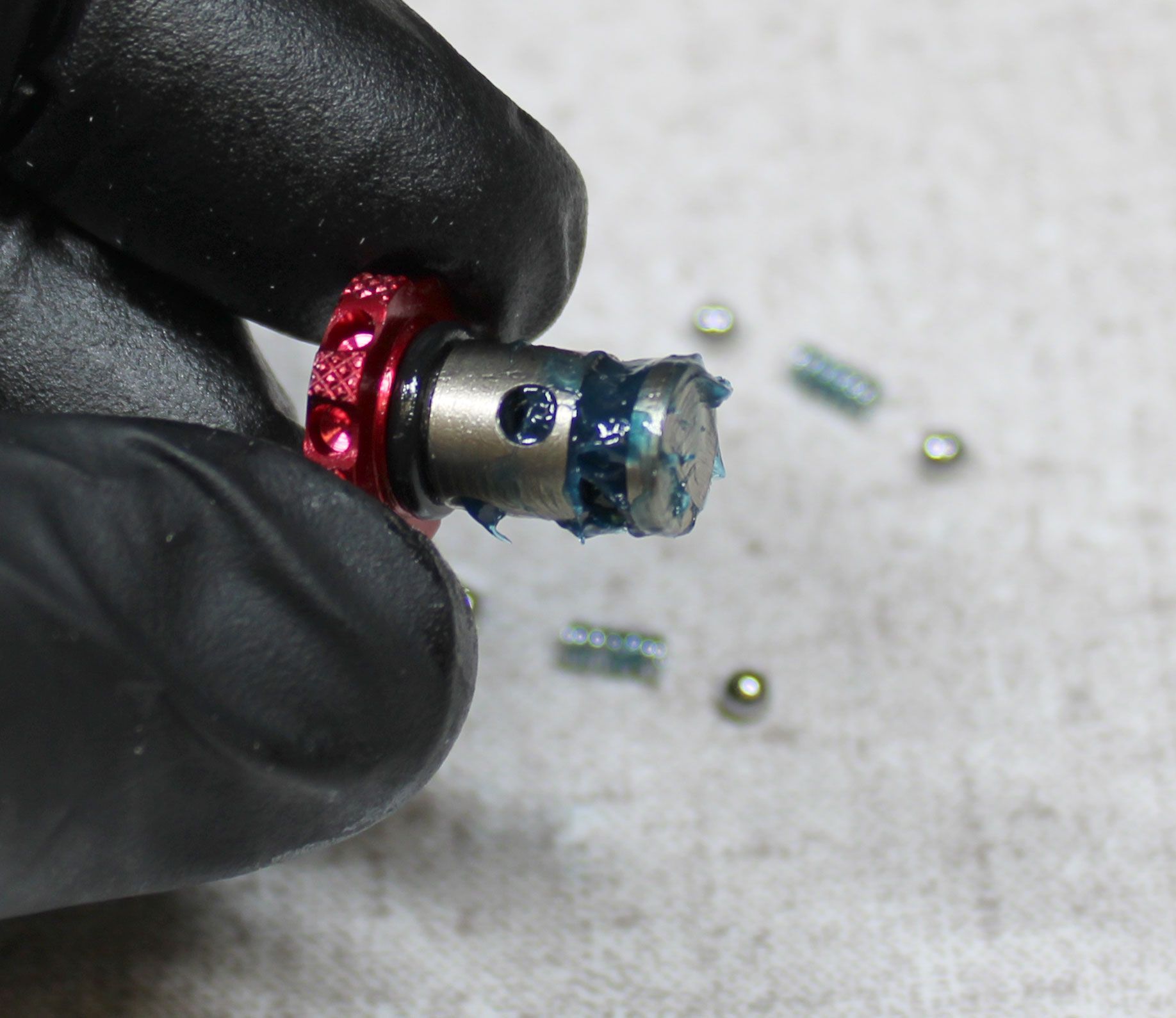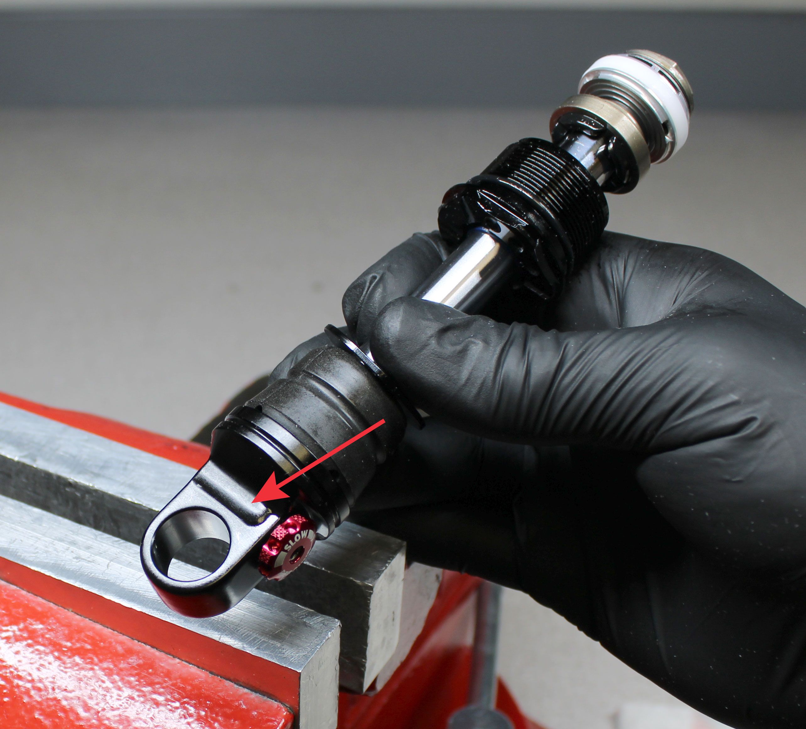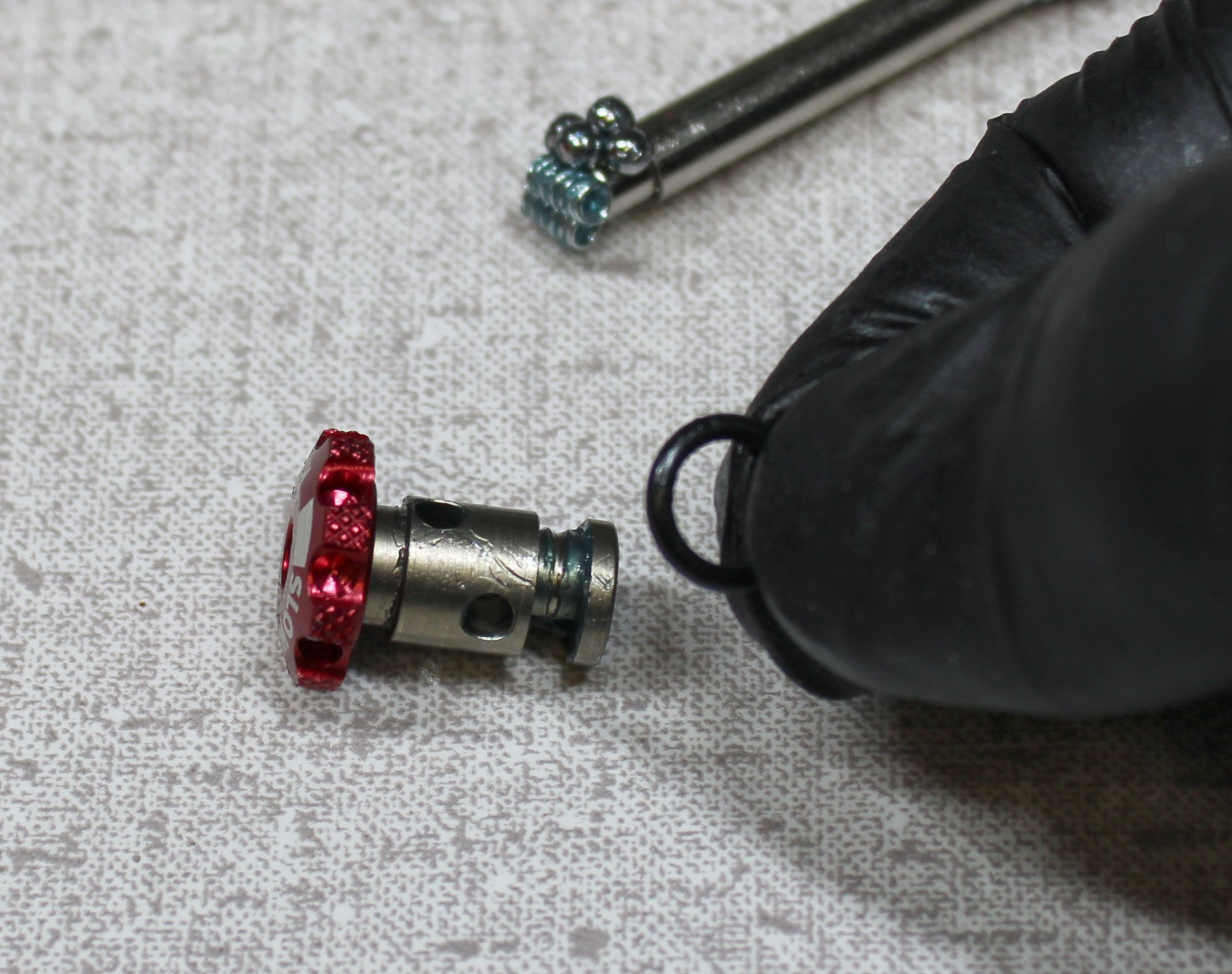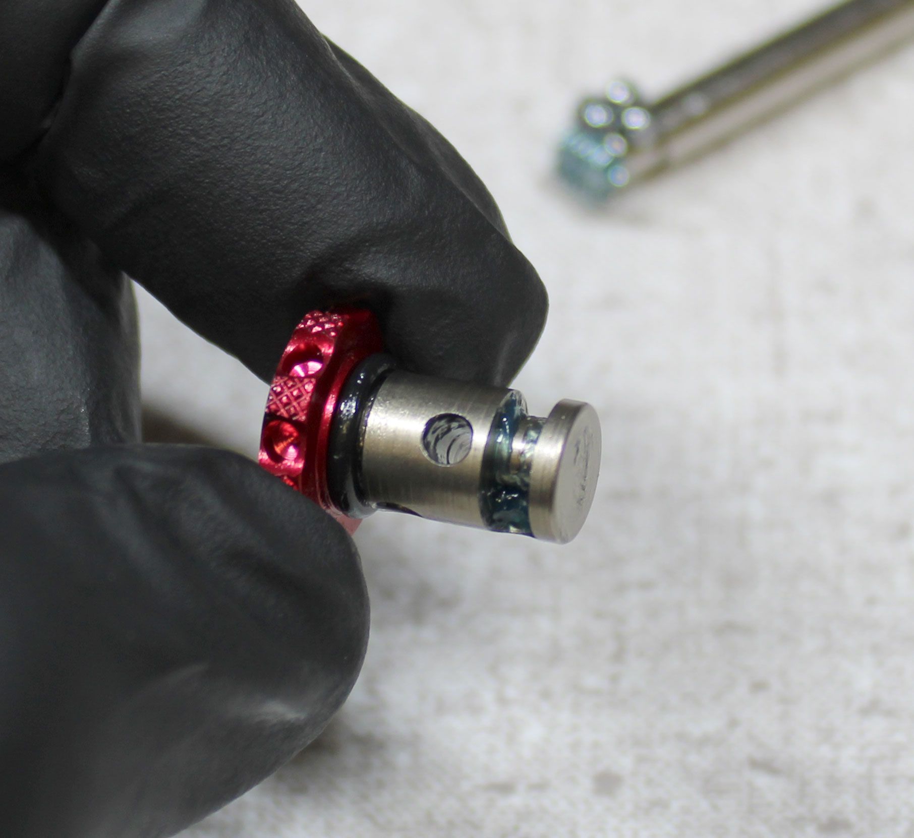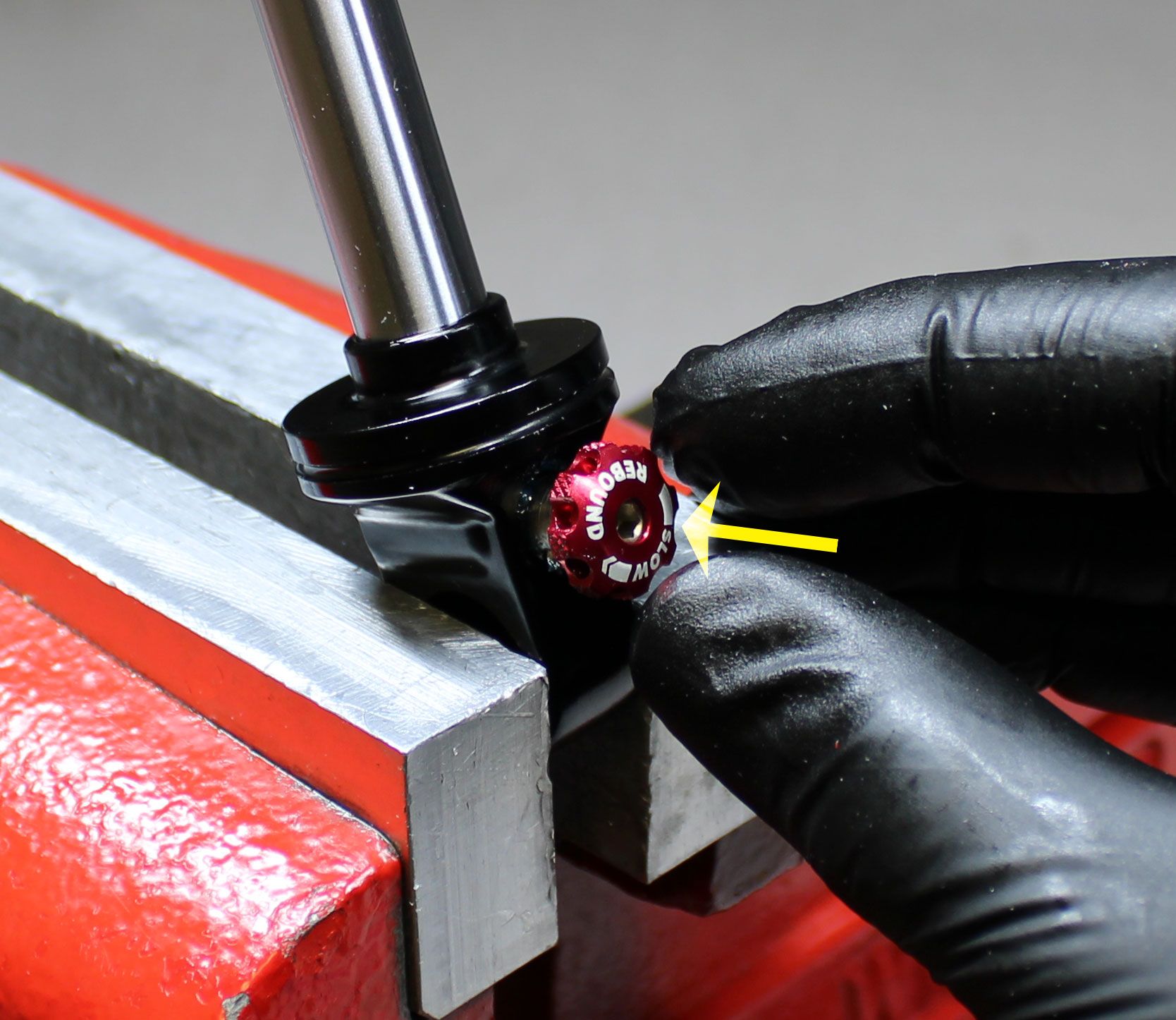 Turn the red rebound knob clockwise a full 360 degrees. Remove the rebound knob by slowly pulling it out from the eyelet taking care not to lose any of the 4 0.1094" diameter balls. Remove the detent balls and springs from the rebound knob, then clean the knob. Replace the o-ring with a new greased one from the kit.