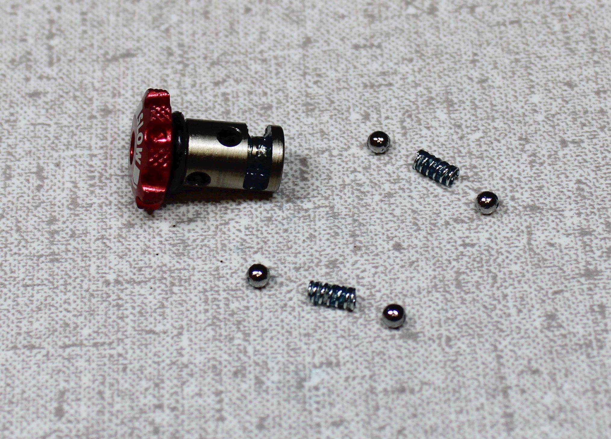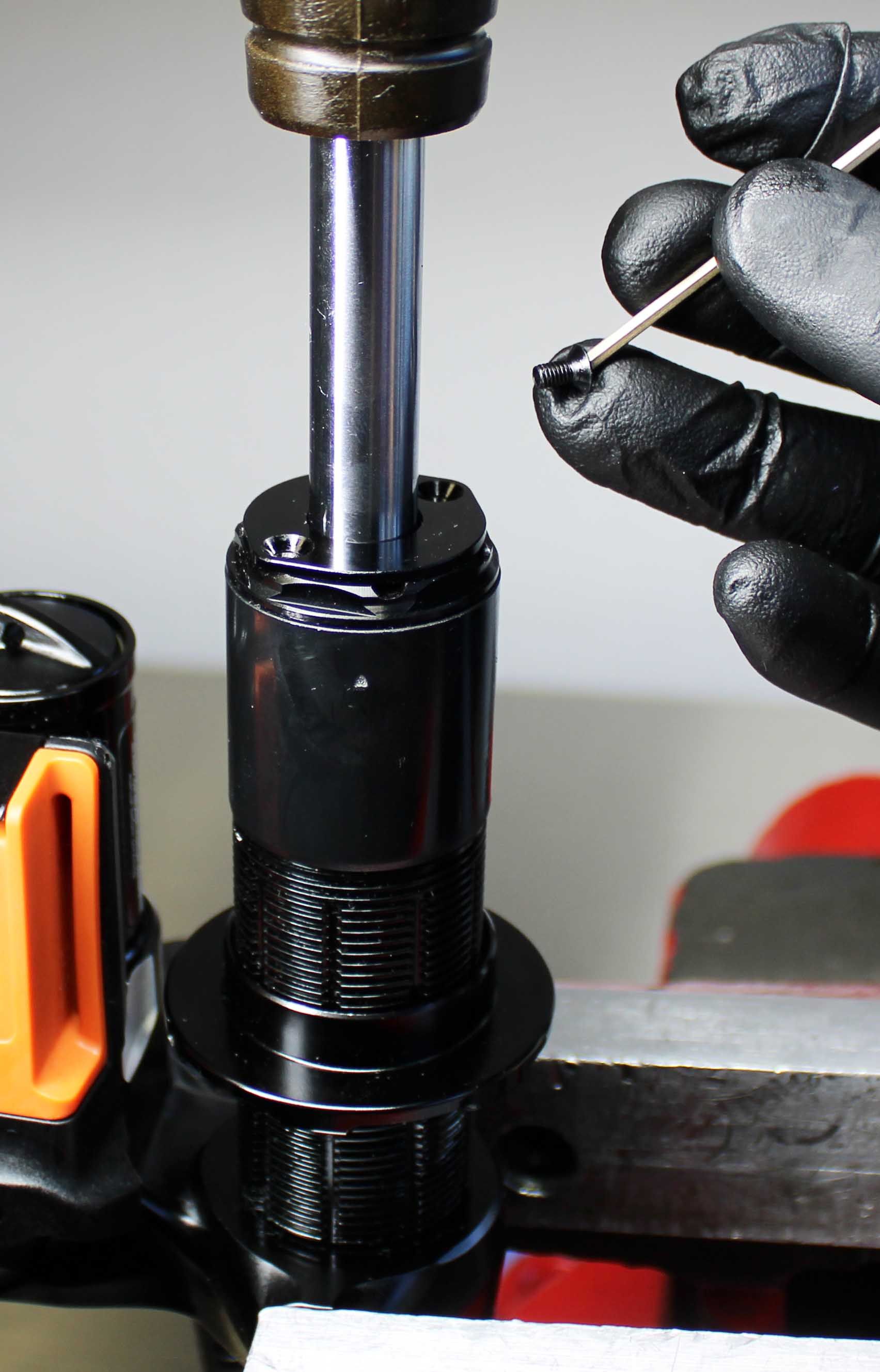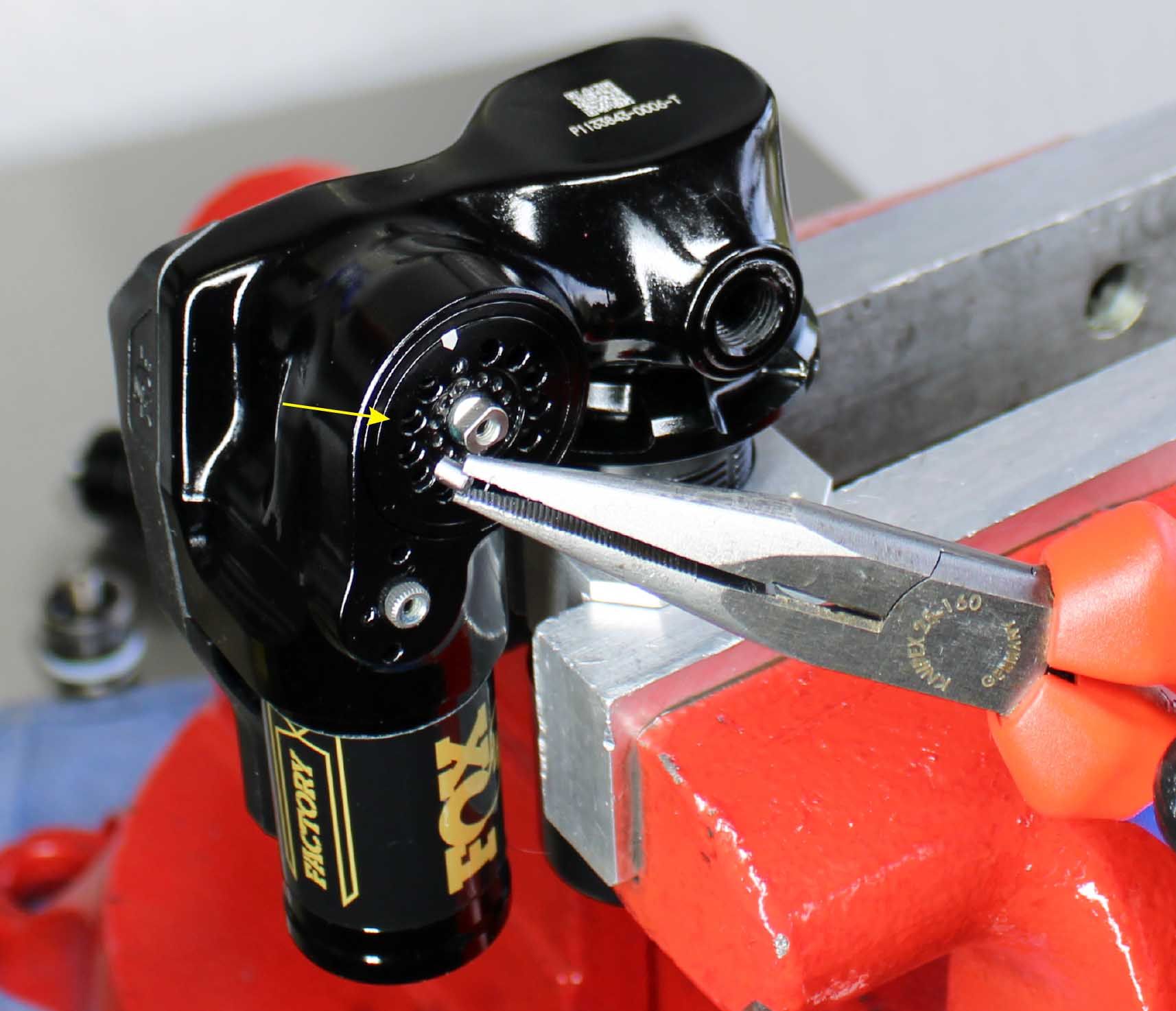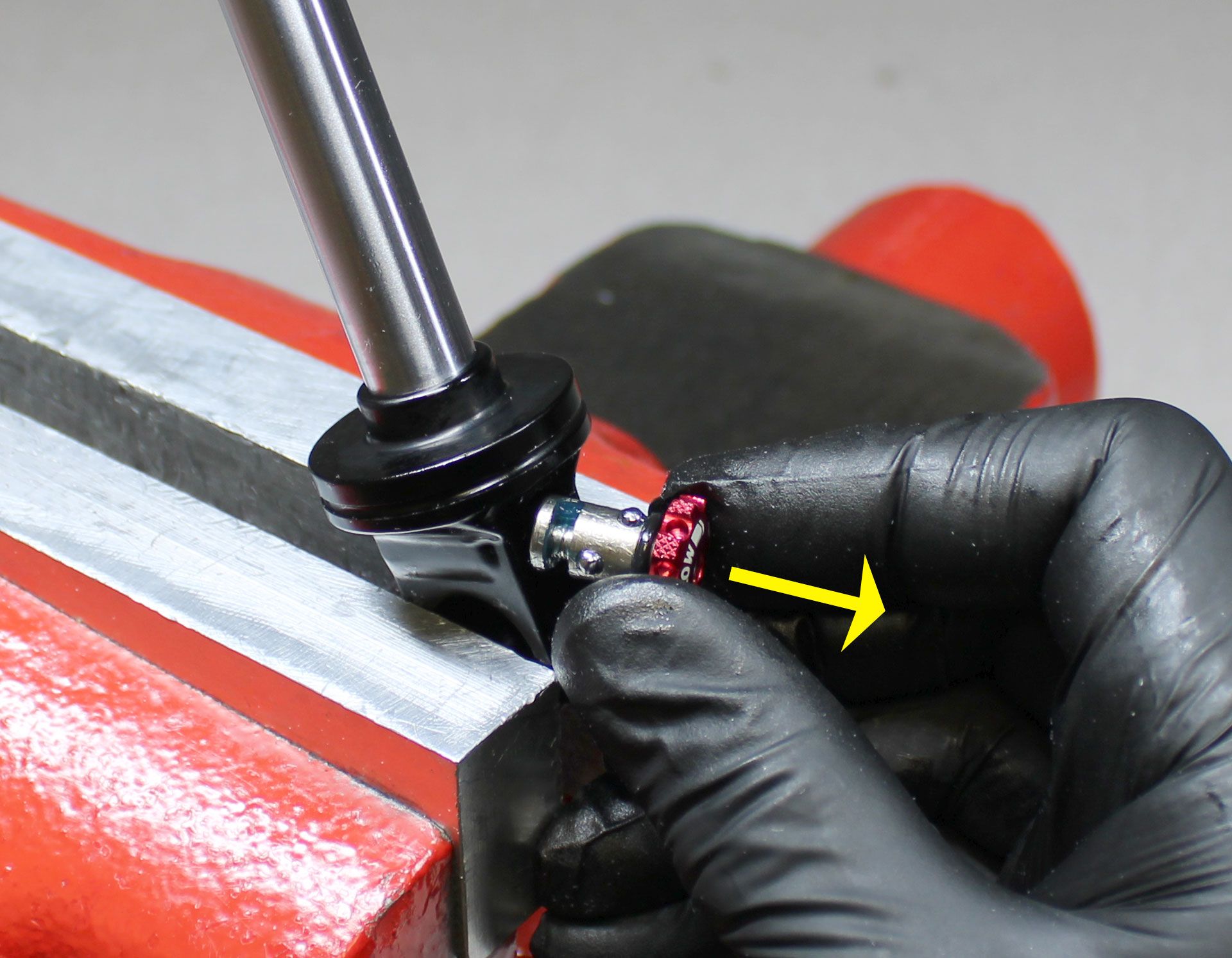 Turn the red rebound knob clockwise a full 360 degrees. Remove the rebound knob by slowly pulling it out from the eyelet taking care not to lose any of the 4 0.1094" diameter balls. Remove the detent balls and springs from the rebound knob, then clean the knob. Replace the o-ring with a new greased one from the kit.