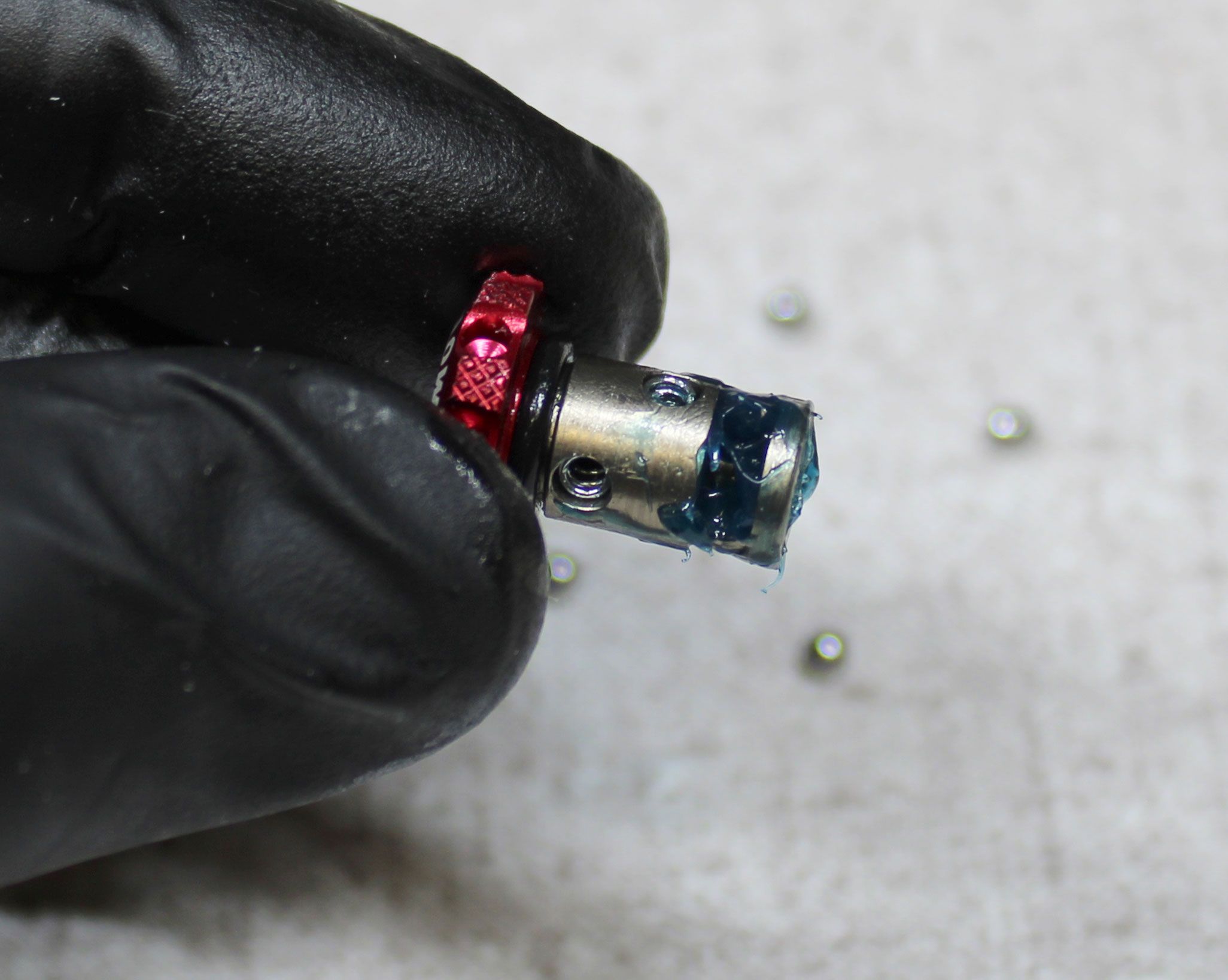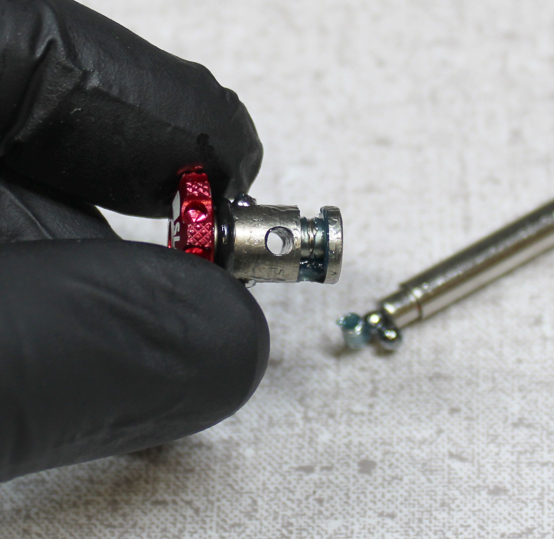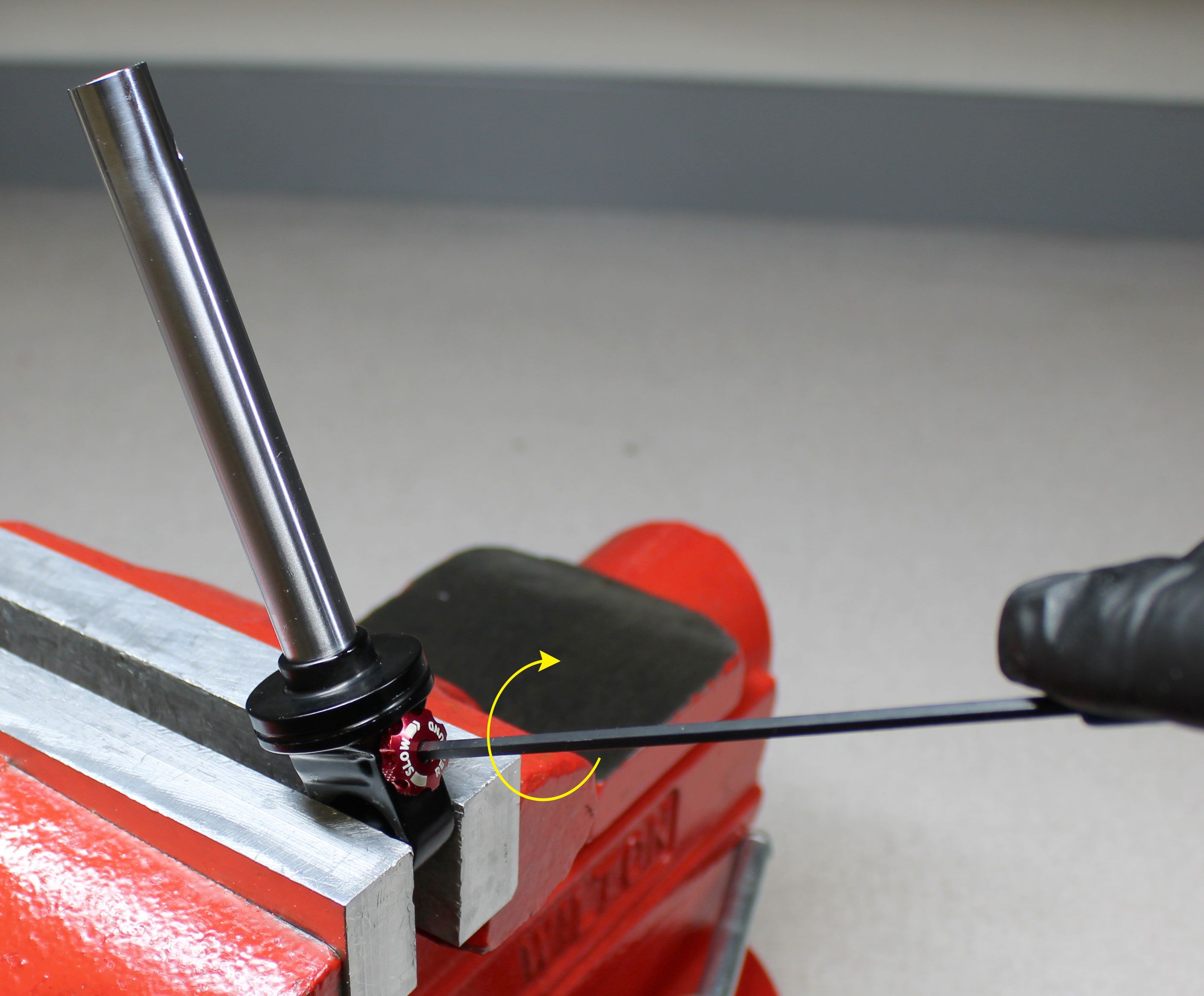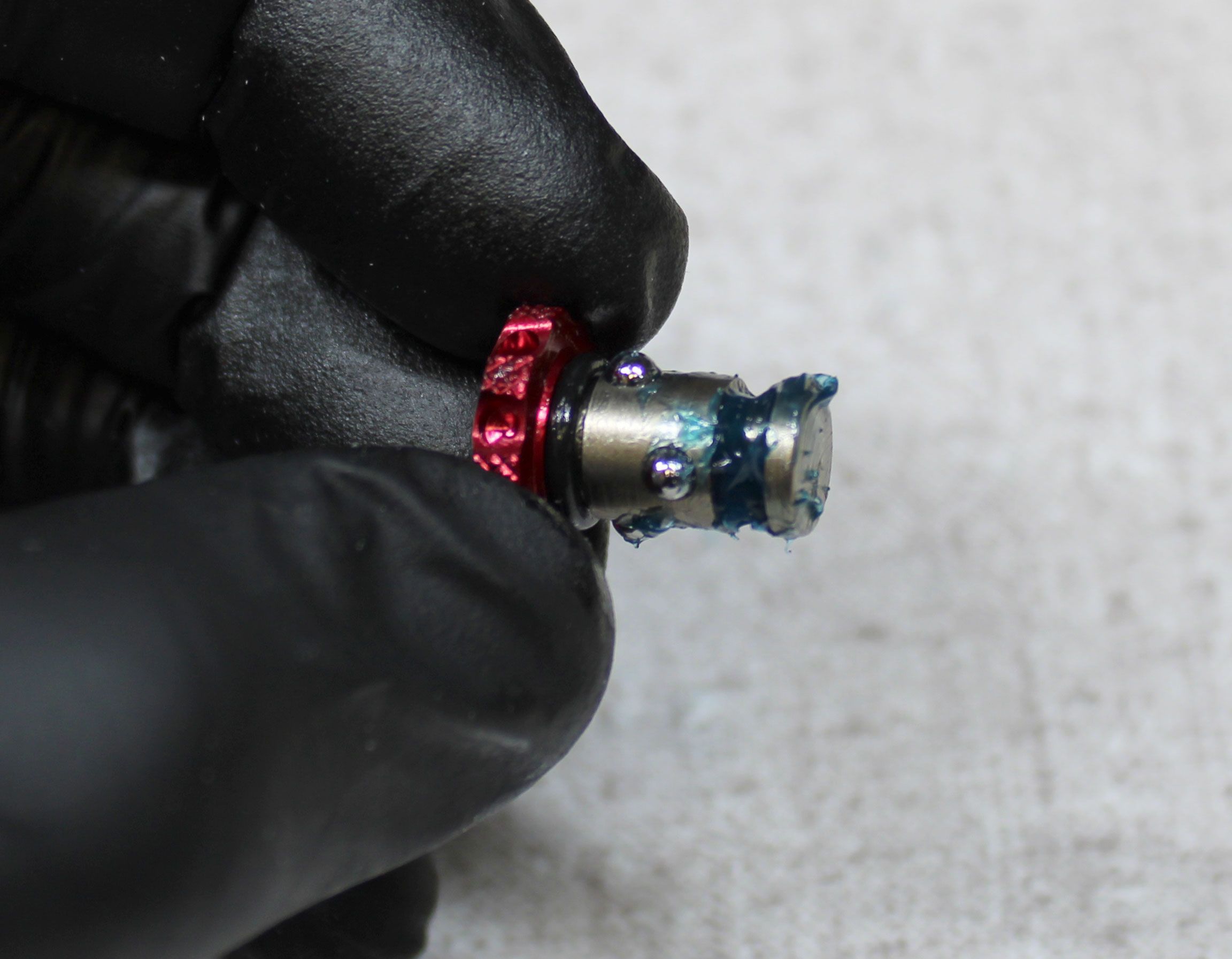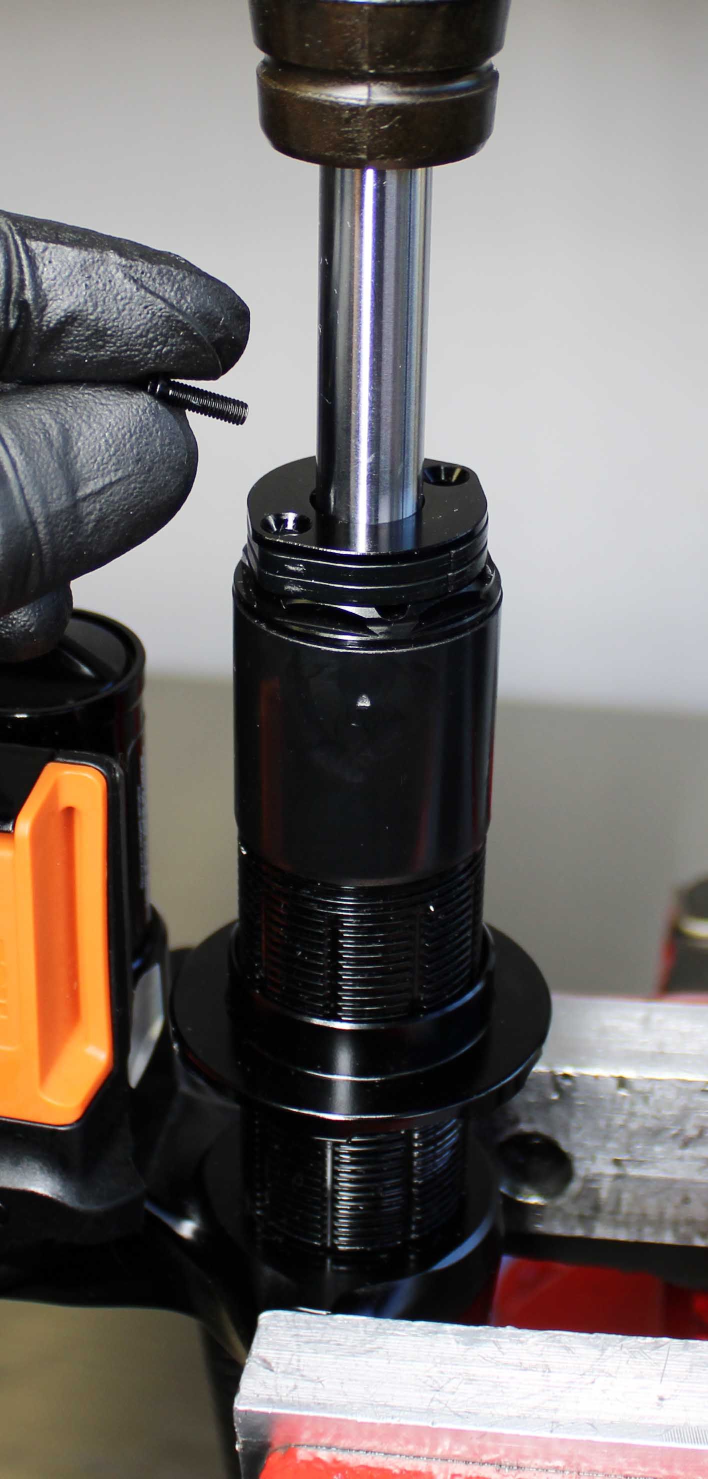 Turn the red rebound knob clockwise a full 360 degrees. Remove the rebound knob by slowly pulling it out from the eyelet taking care not to lose any of the 4 0.1094" diameter balls. Remove the detent balls and springs from the rebound knob, then clean the knob. Replace the o-ring with a new greased one from the kit.