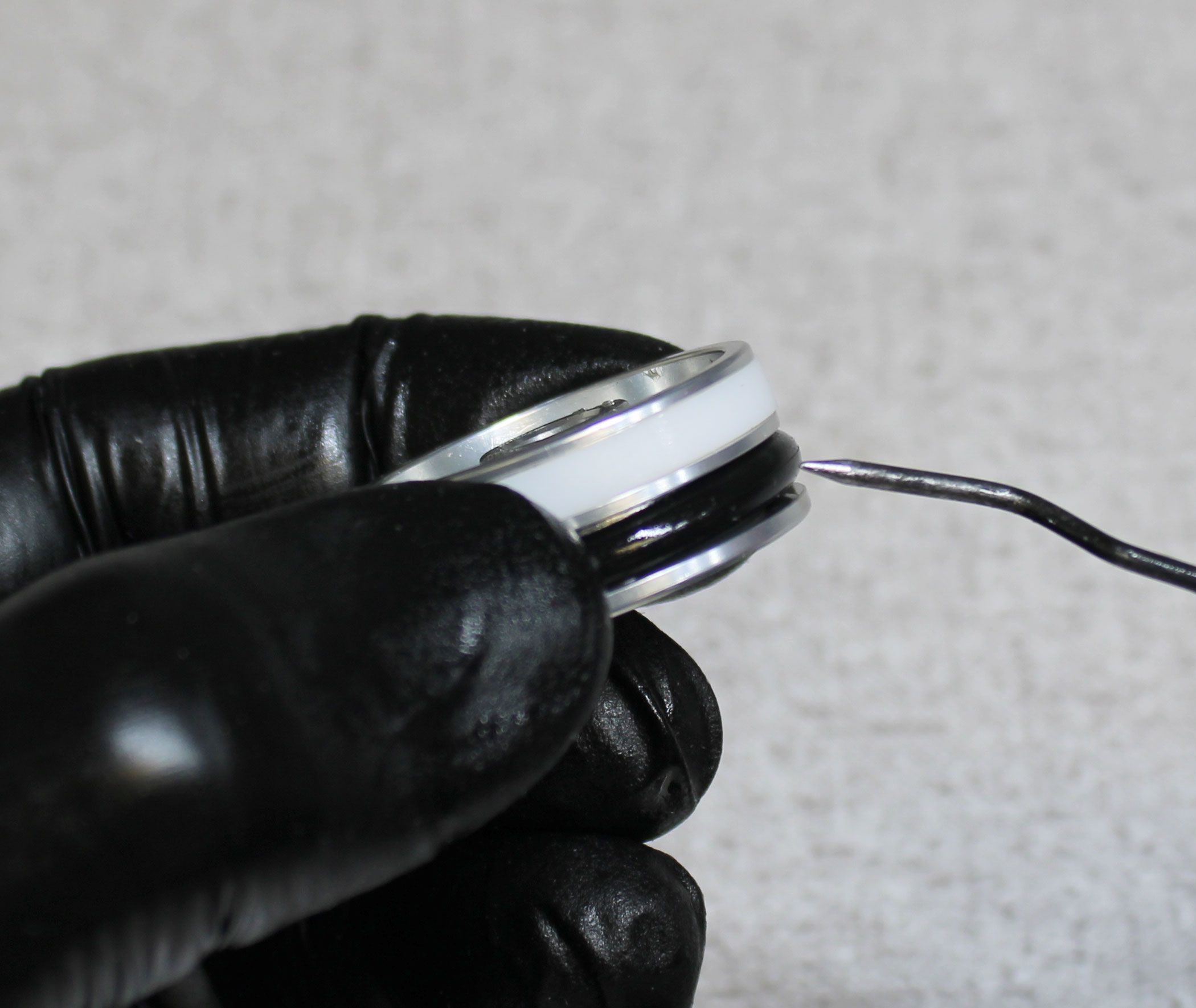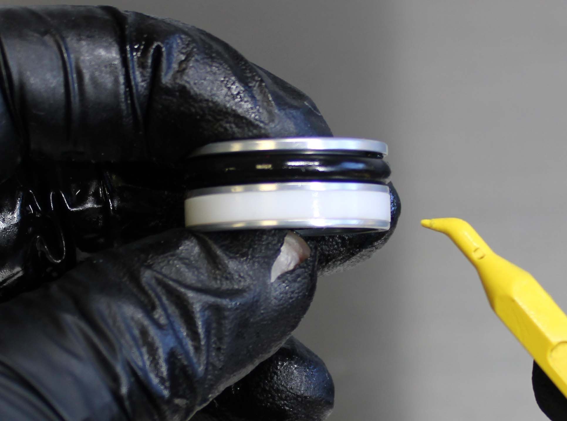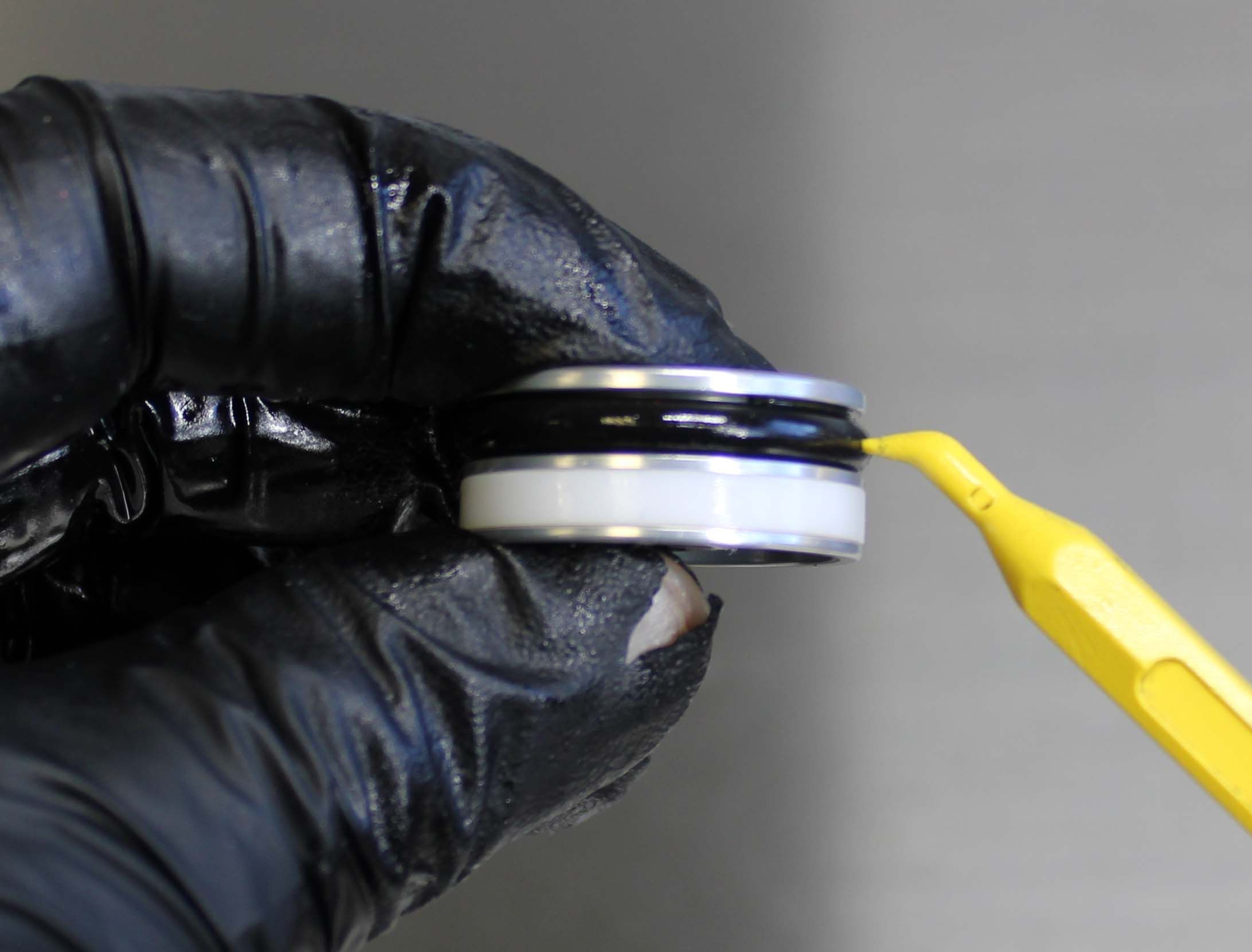 Push the Reservoir End Cap into the Reservoir to gain access to the wire retaining ring. Remove the wire retaining ring by pushing the center of the ring down which will cause the ends of the ring to pop up. Be careful not to scratch the IFP bore while removing or installing this ring. Use a small hex wrench to lift the Reservoir End Cap out from the Reservoir.