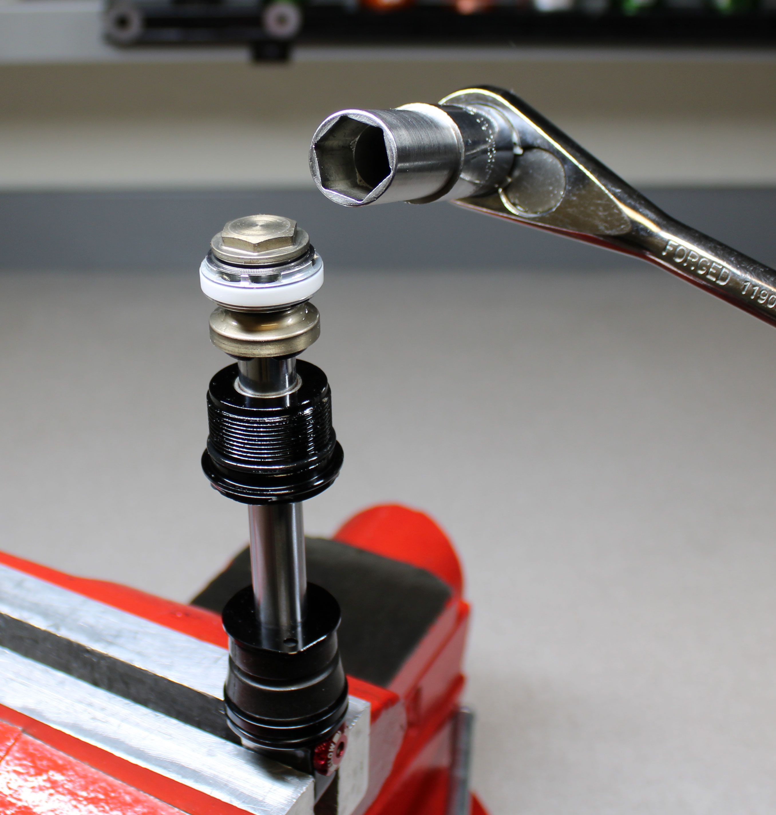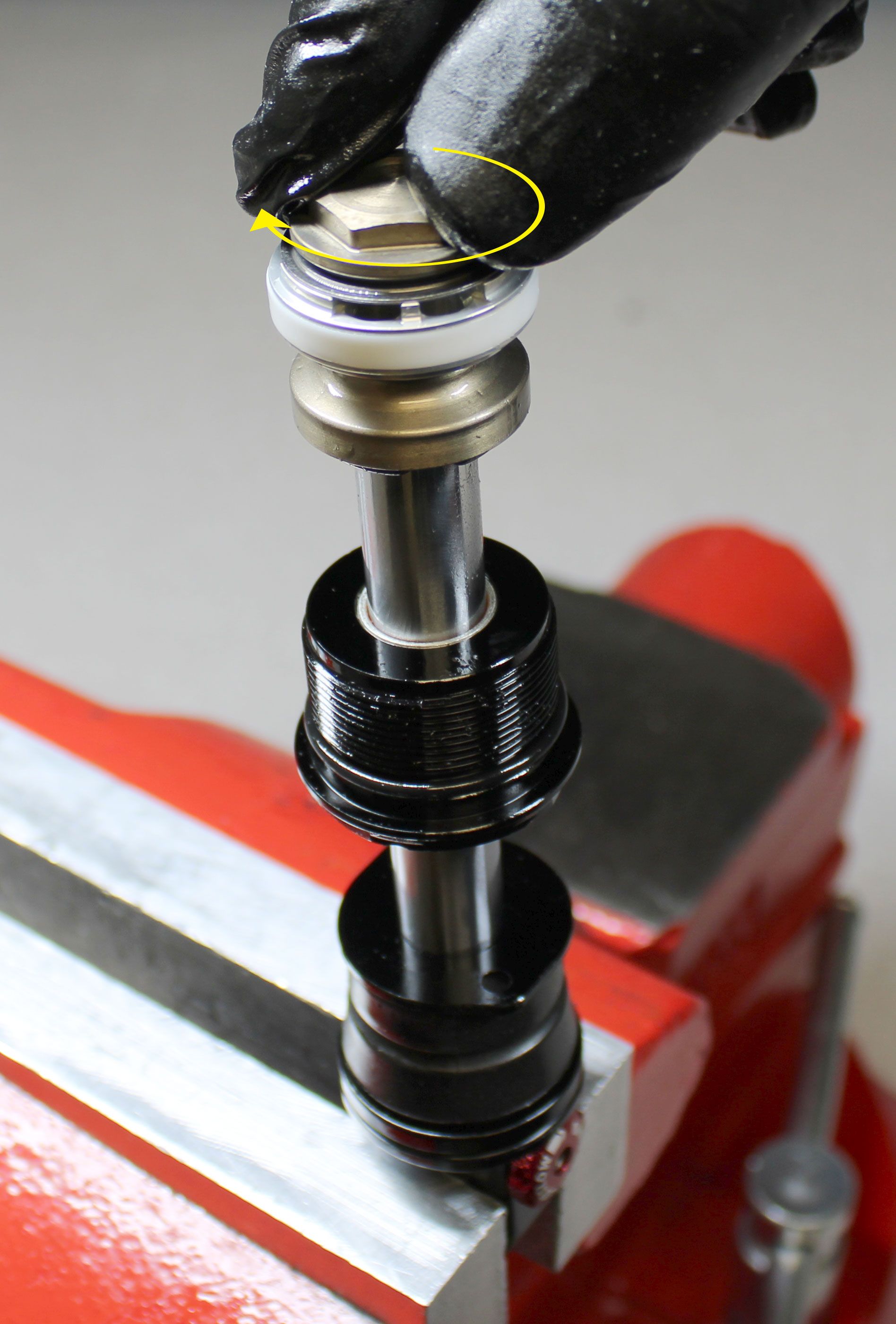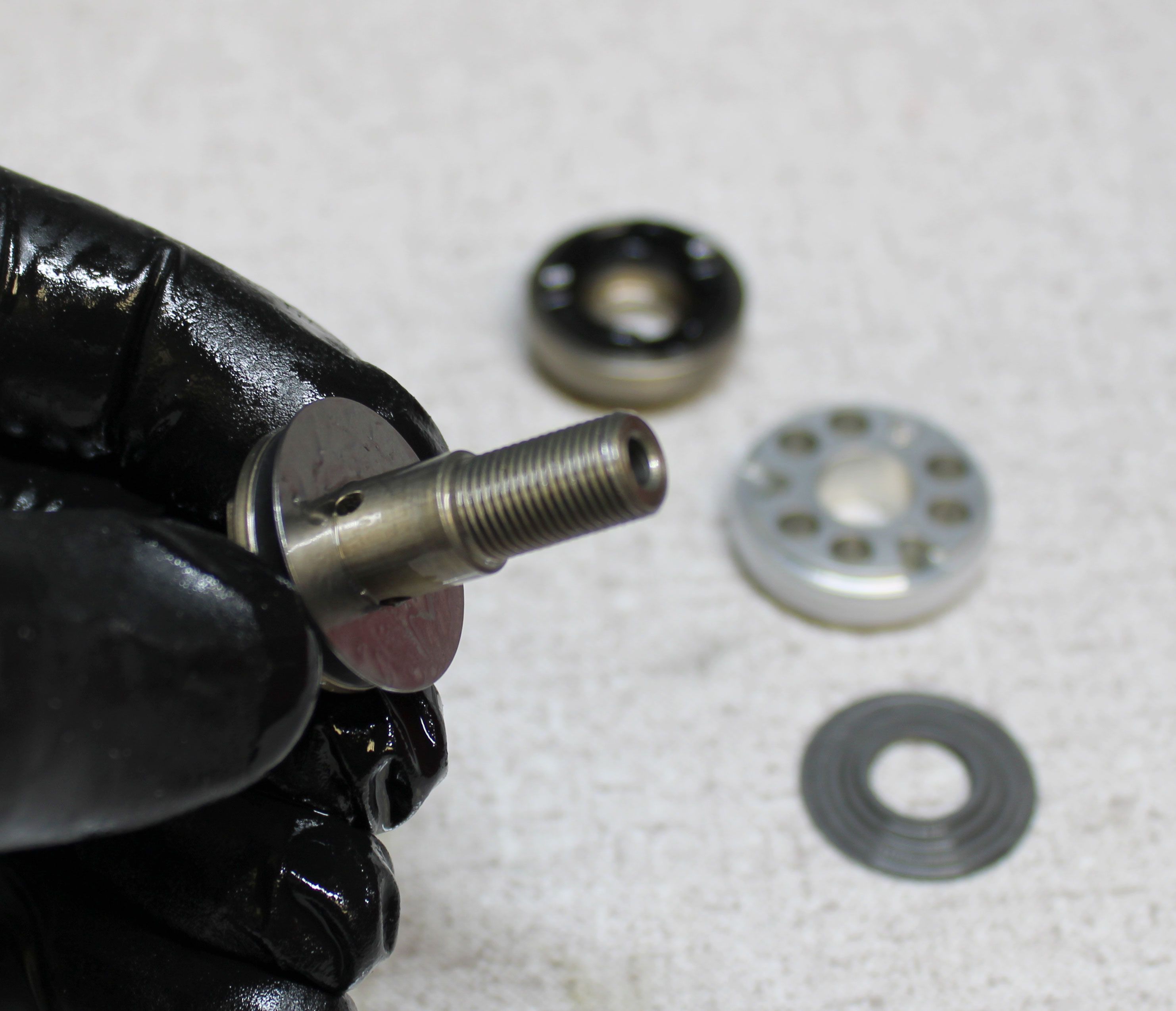 Reinstall the rebound valving assembly onto the piston bolt followed by the main piston. Note the orientation of the main piston as shown. Reinstall the compression valving assembly. Replace the topout bumper with a new greased one from the kit. Reinstall the topout plate. Make sure that no shims are off center or pinched.