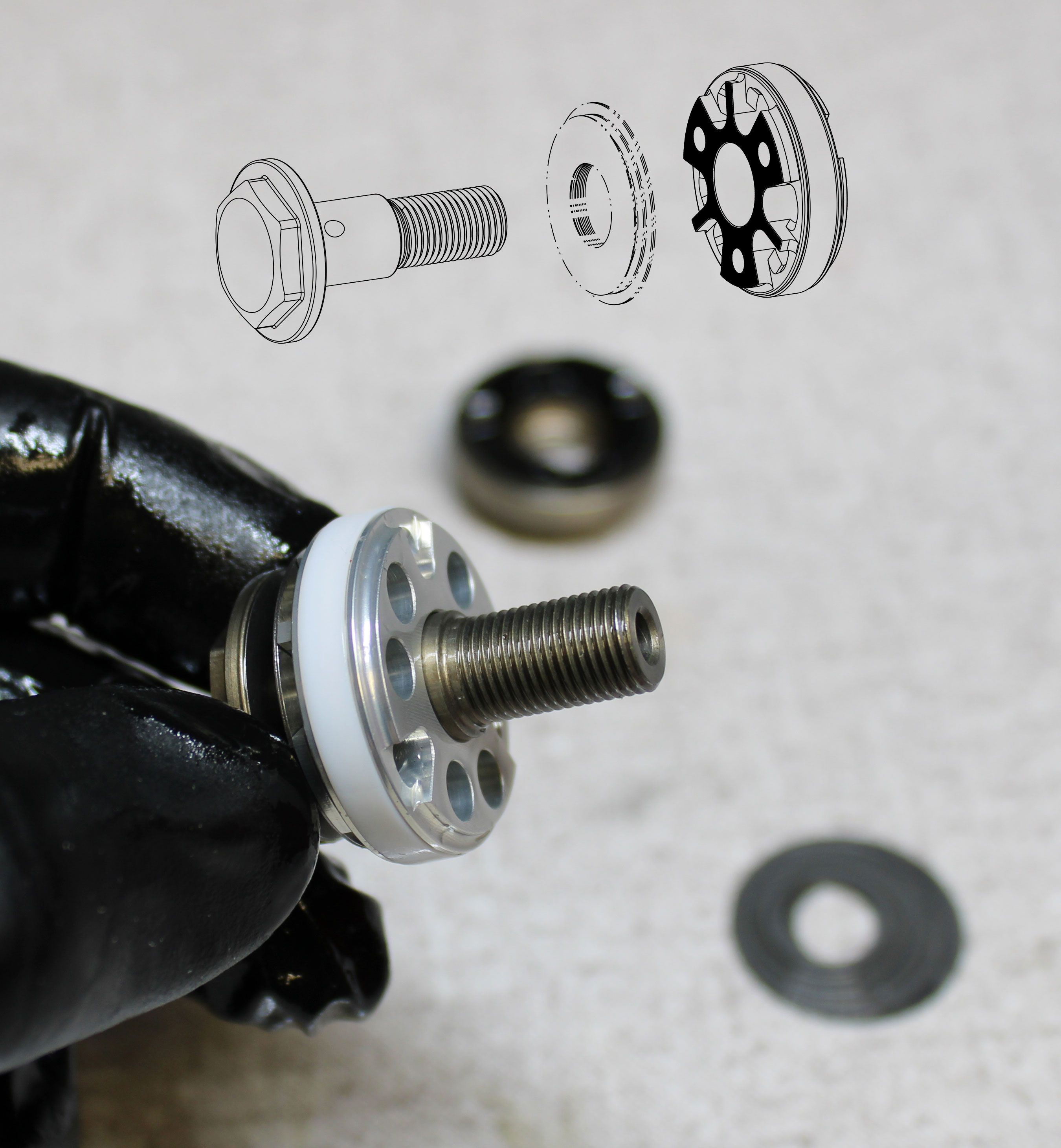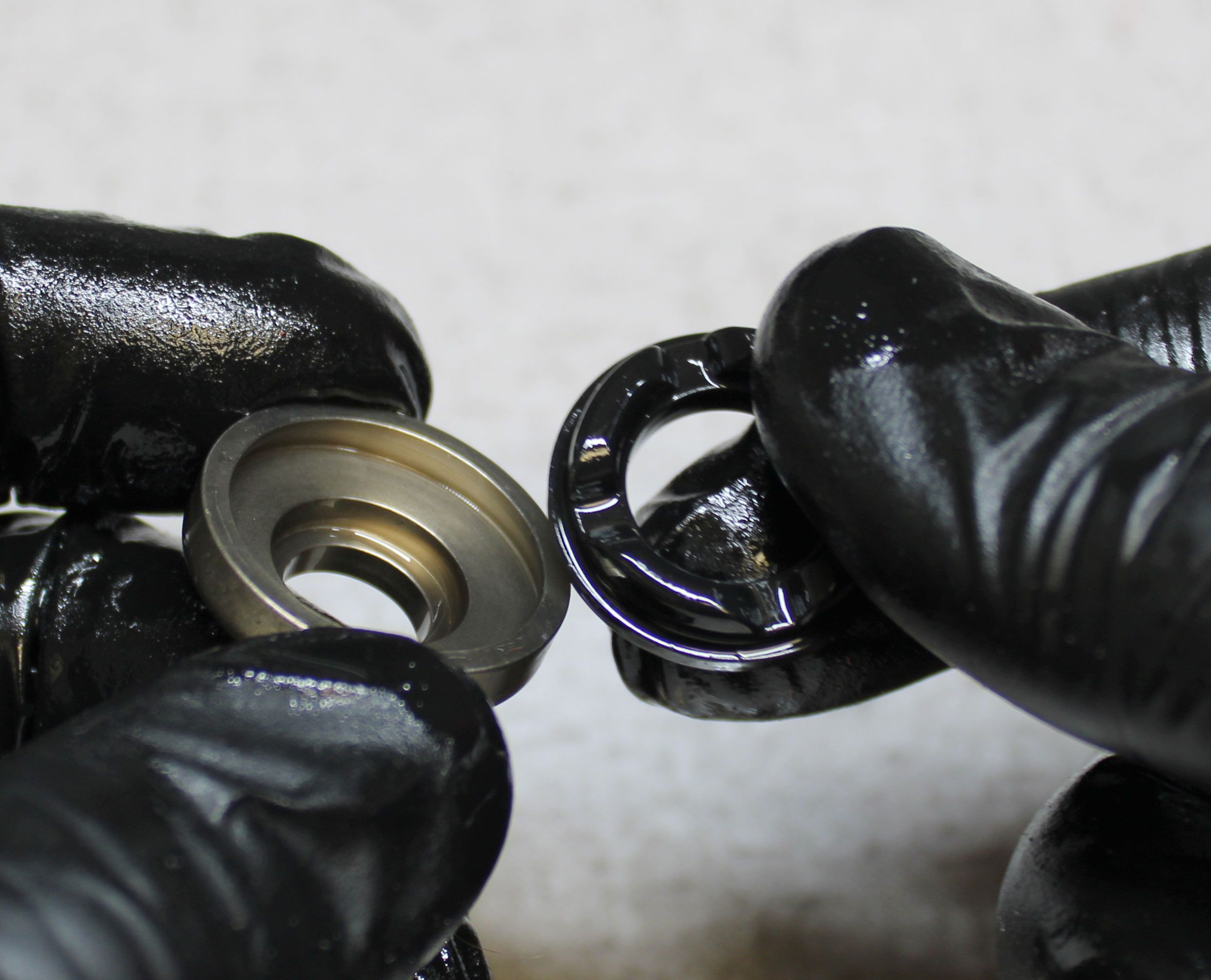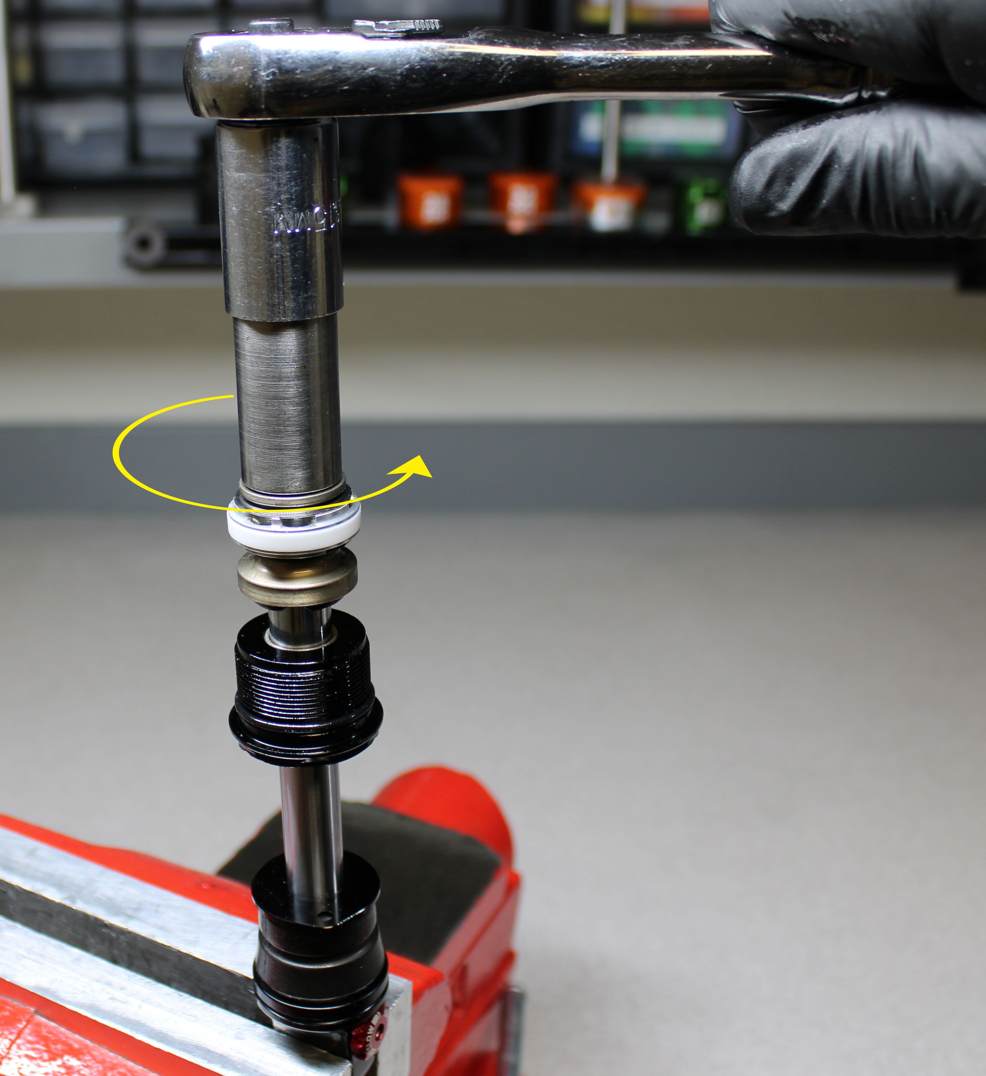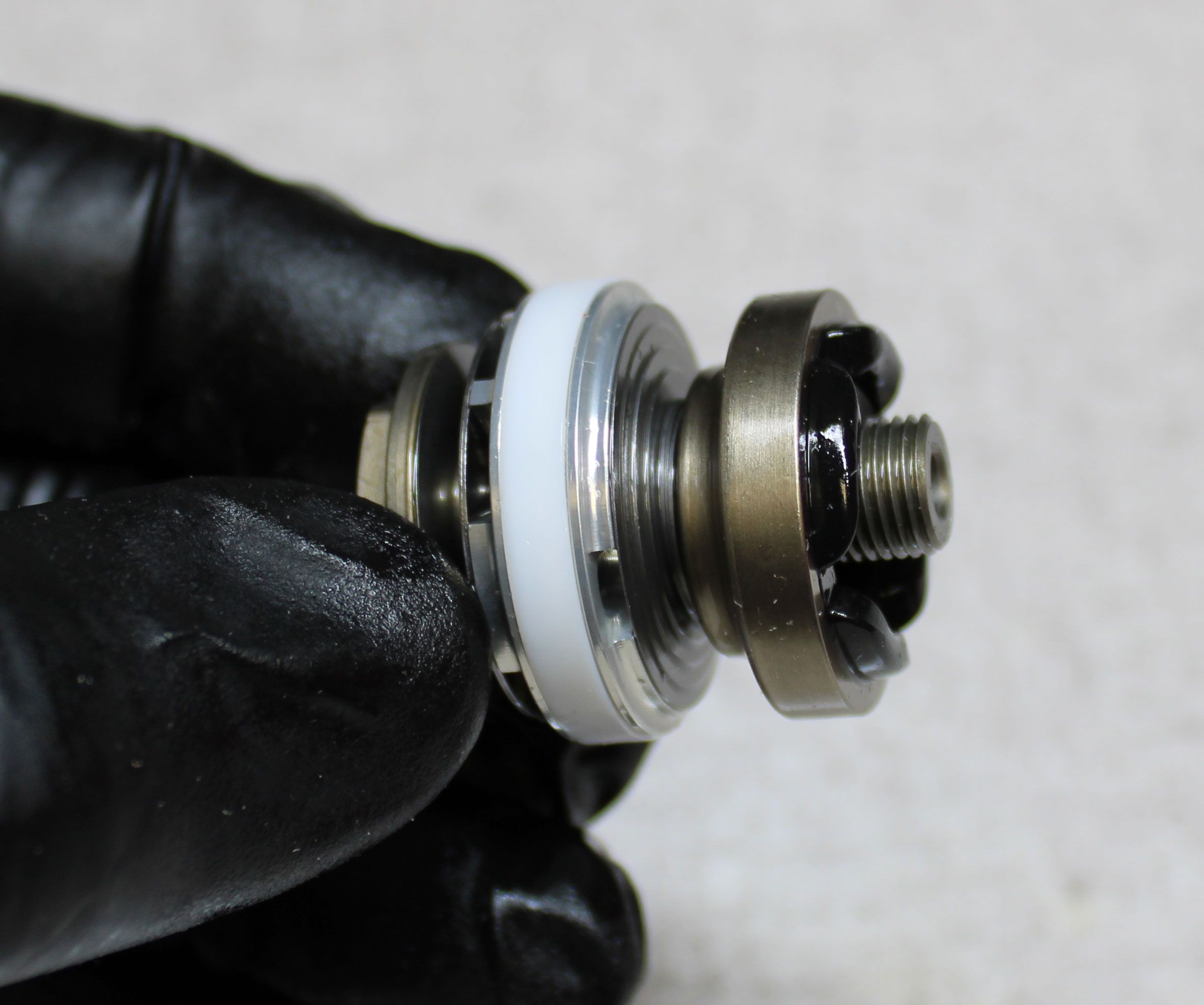 Reinstall the rebound valving assembly onto the piston bolt followed by the main piston. Note the orientation of the main piston as shown. Reinstall the compression valving assembly. Replace the topout bumper with a new greased one from the kit. Reinstall the topout plate. Make sure that no shims are off center or pinched.