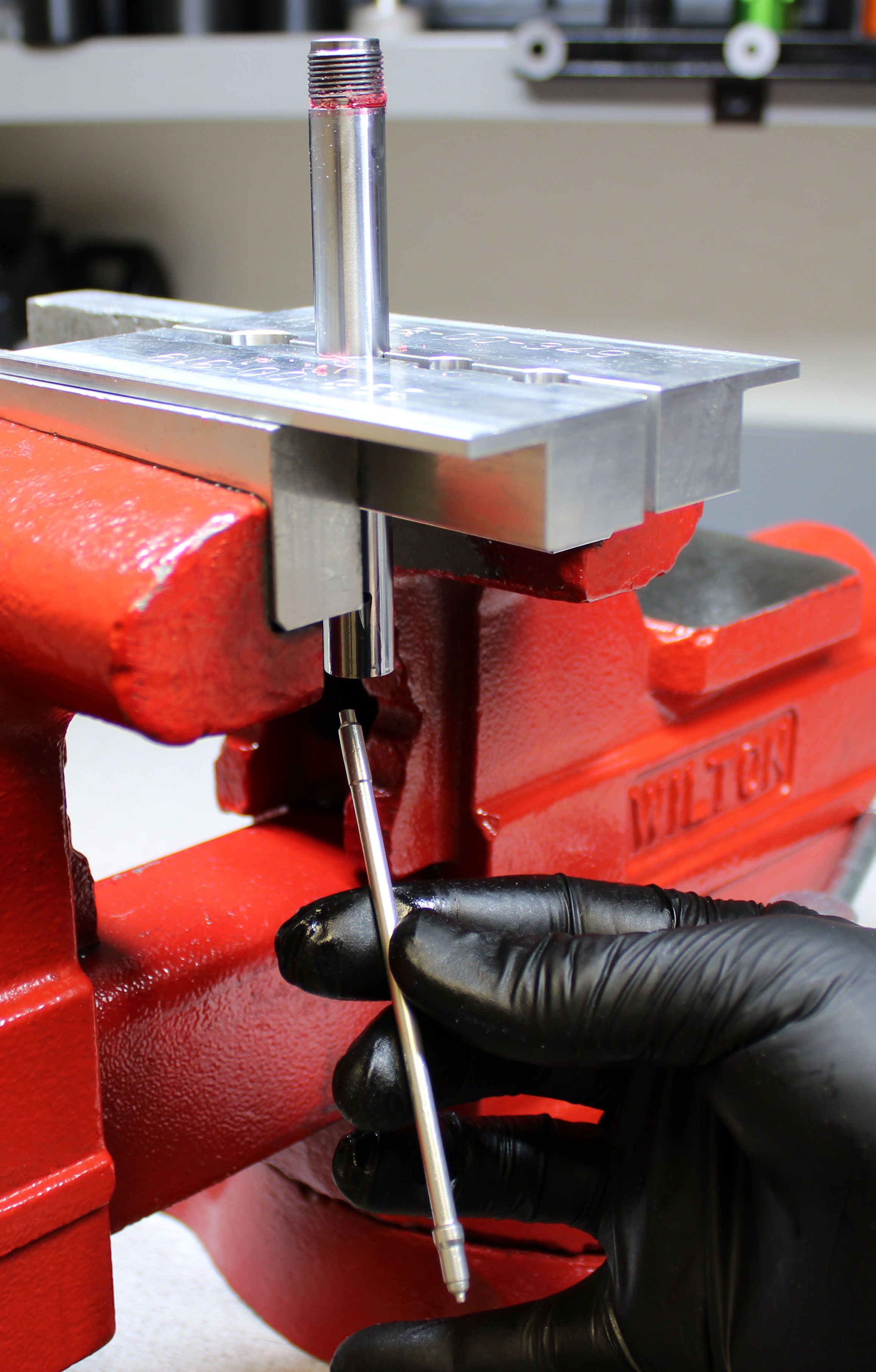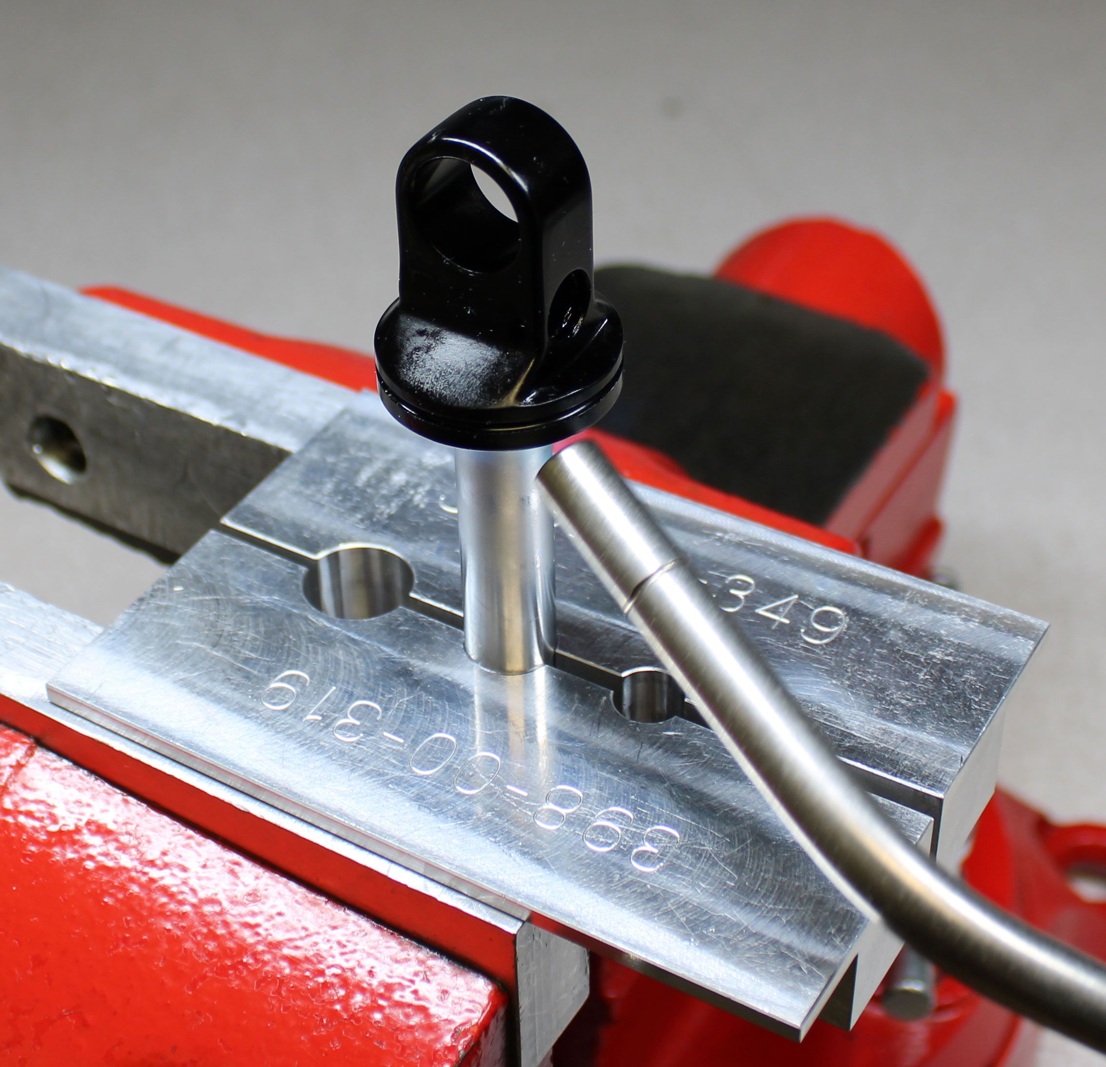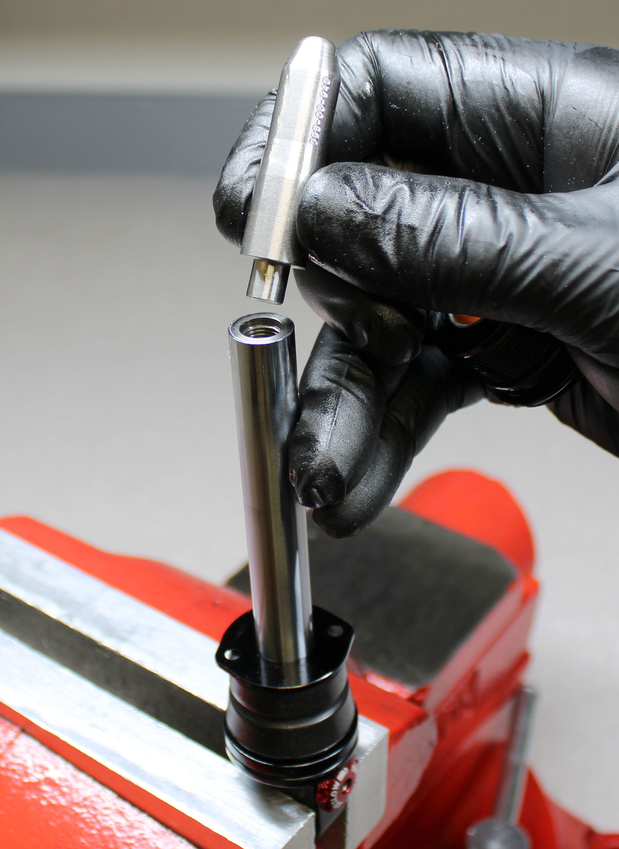 Clean the shaft with isopropyl alcohol and a lint-free paper towel, then clamp the shaft in your shaft clamps with the eyelet up. Carefully apply heat to the Shaft Eyelet with a propane torch then unthread the Shaft Eyelet counter-clockwise to remove. Be careful as the Eyelet and Shaft may be hot!