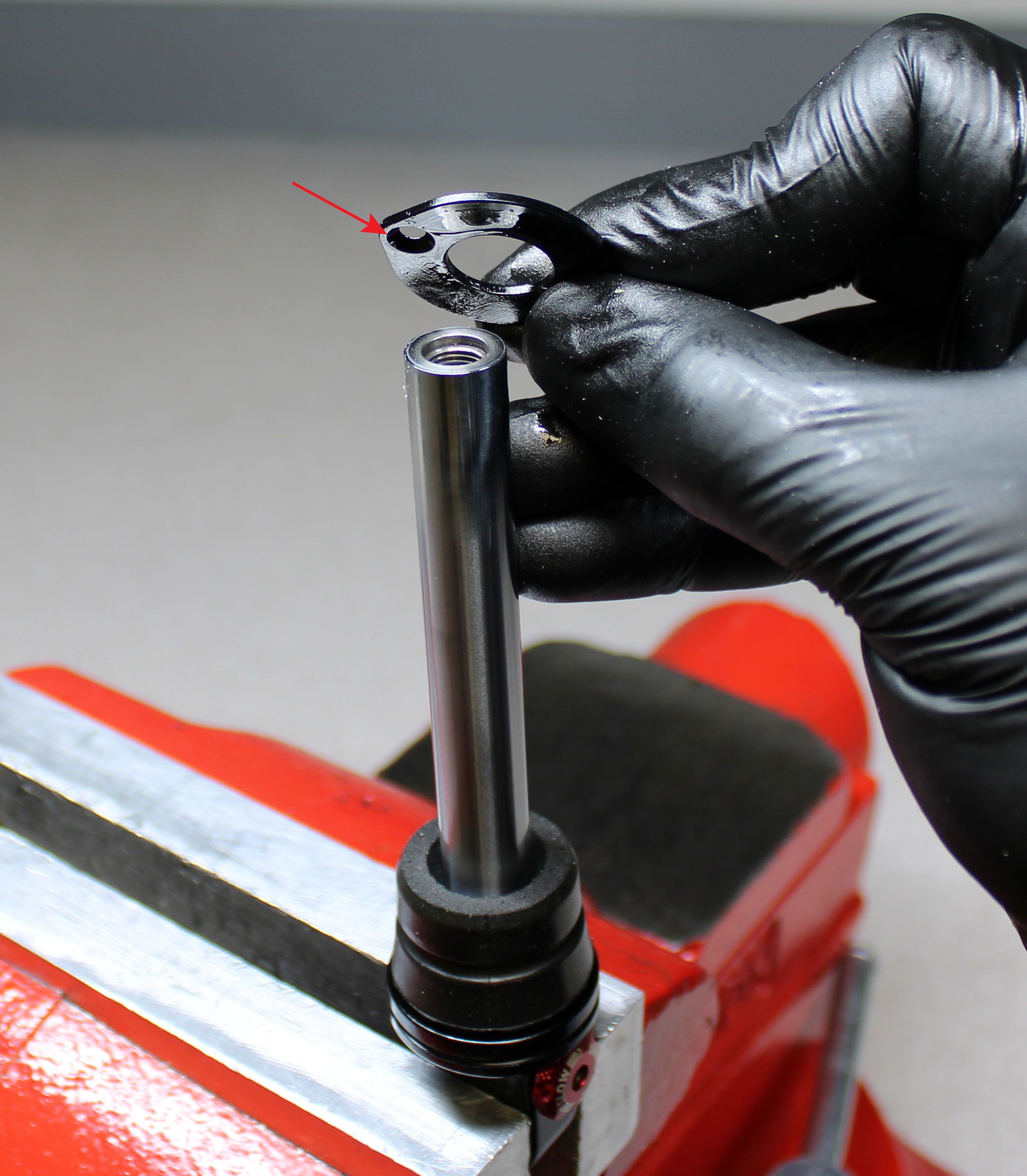Install LSC Clocking Plate, aligning plate so laser etch arrow is at the top. Place Dowel Pin in pair of holes most closely aligned. Reinstall spring and ball bearing along with Firm Mode lever, torque screw to 2in-lb.Place Hardstop Ball into hole aligned with arrow Note: Actual pair of holes will vary by assembly and may not match indicated location shown.