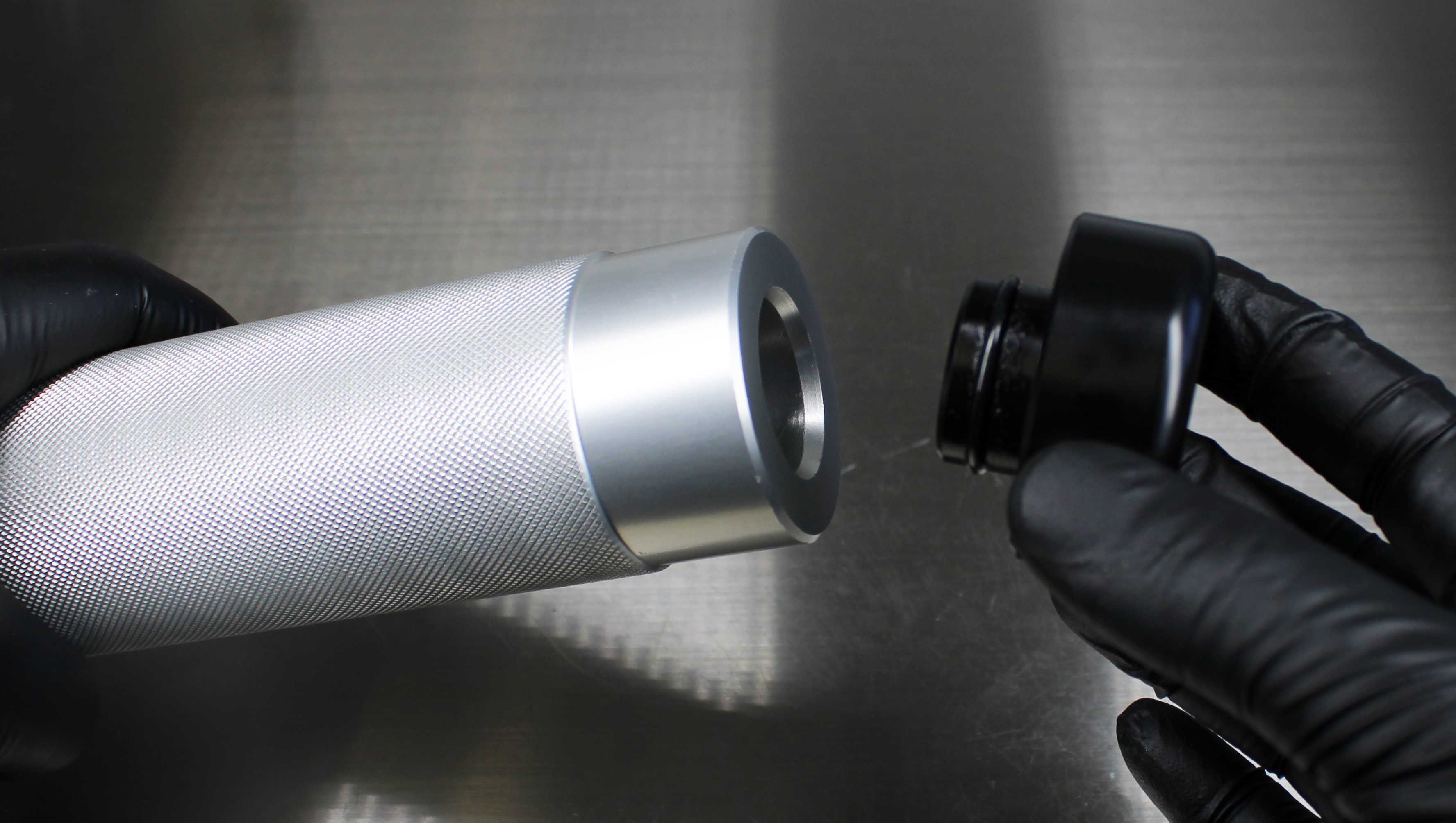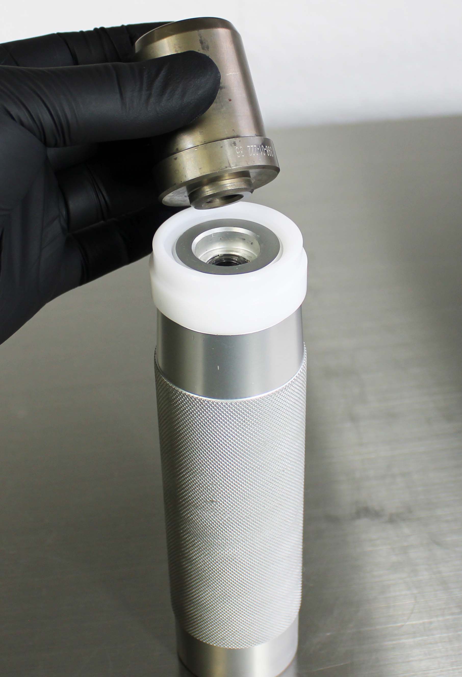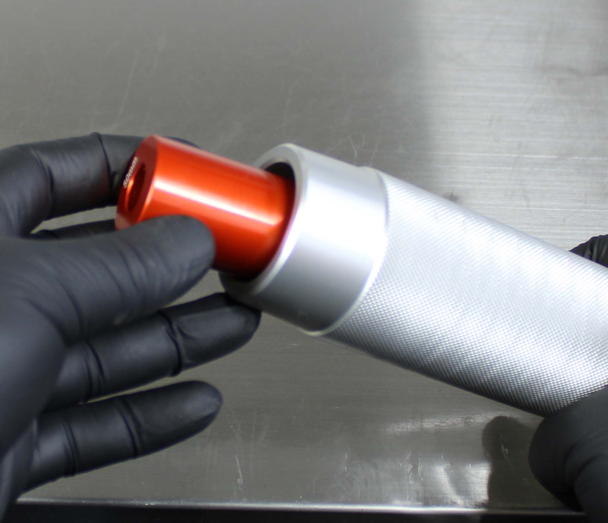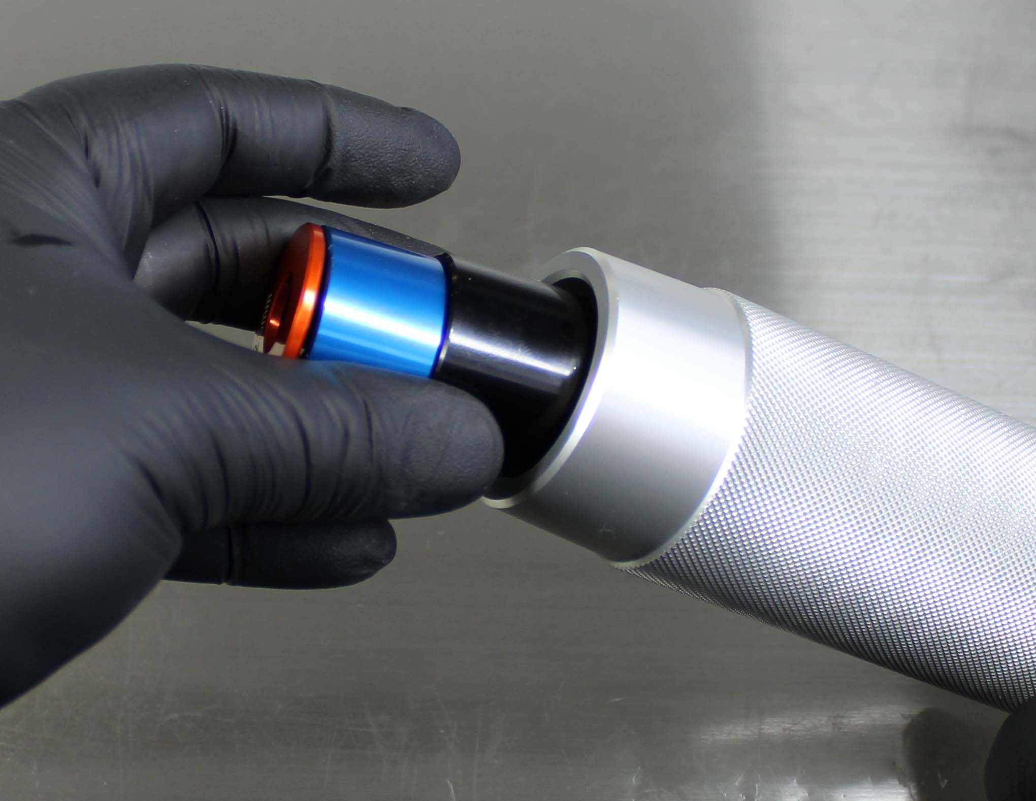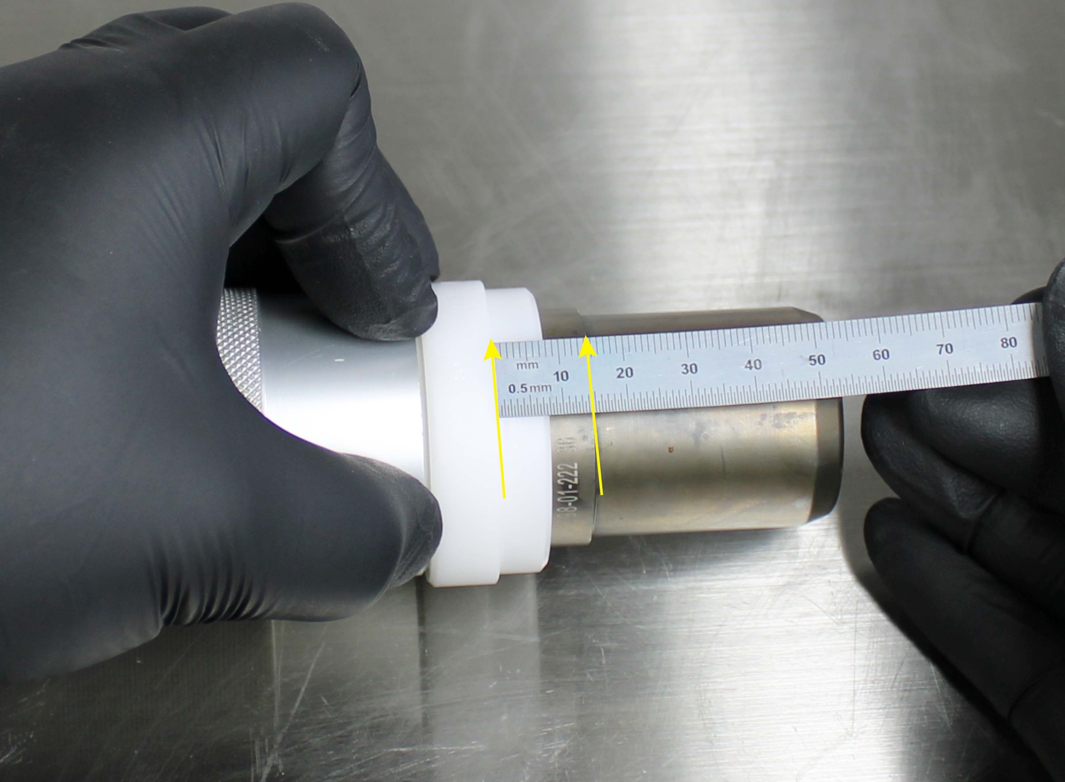 Once the Installation Tip and Guide Ring is installed, the depth can be verified by measuring from the tip of the Installation Tip to the lip of the Guide Ring. Note: All lower bushings require a depth of 15.25mm. NO SPACERS REQUIRED. Insert the Hammer Cap into the Handle. The tool is now assembled.