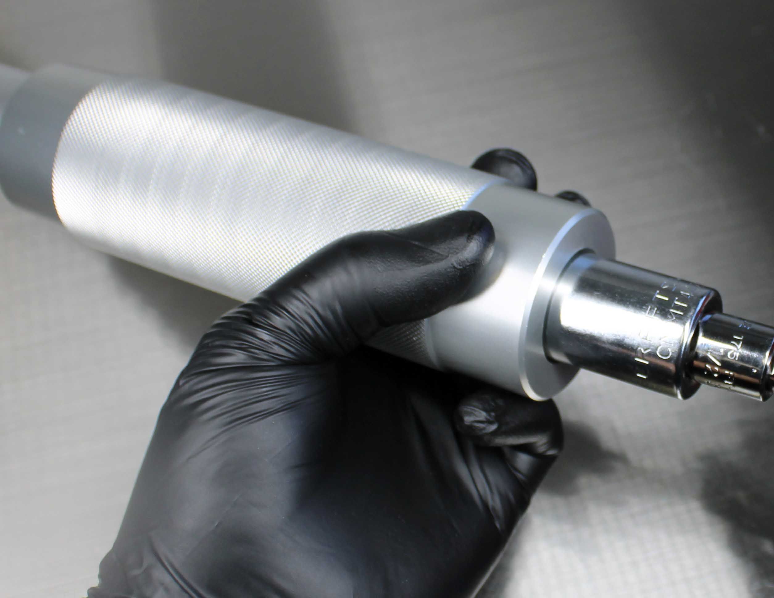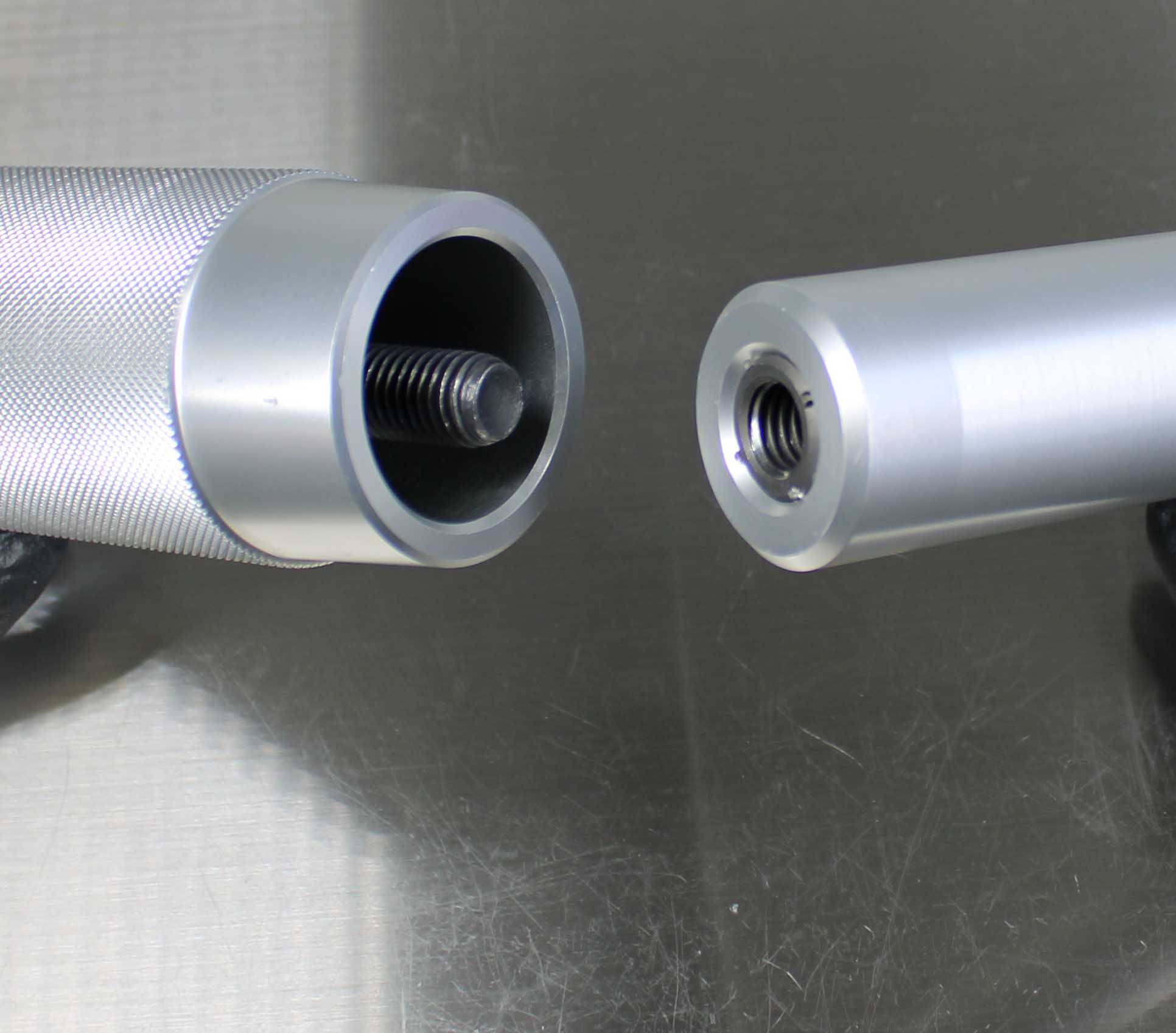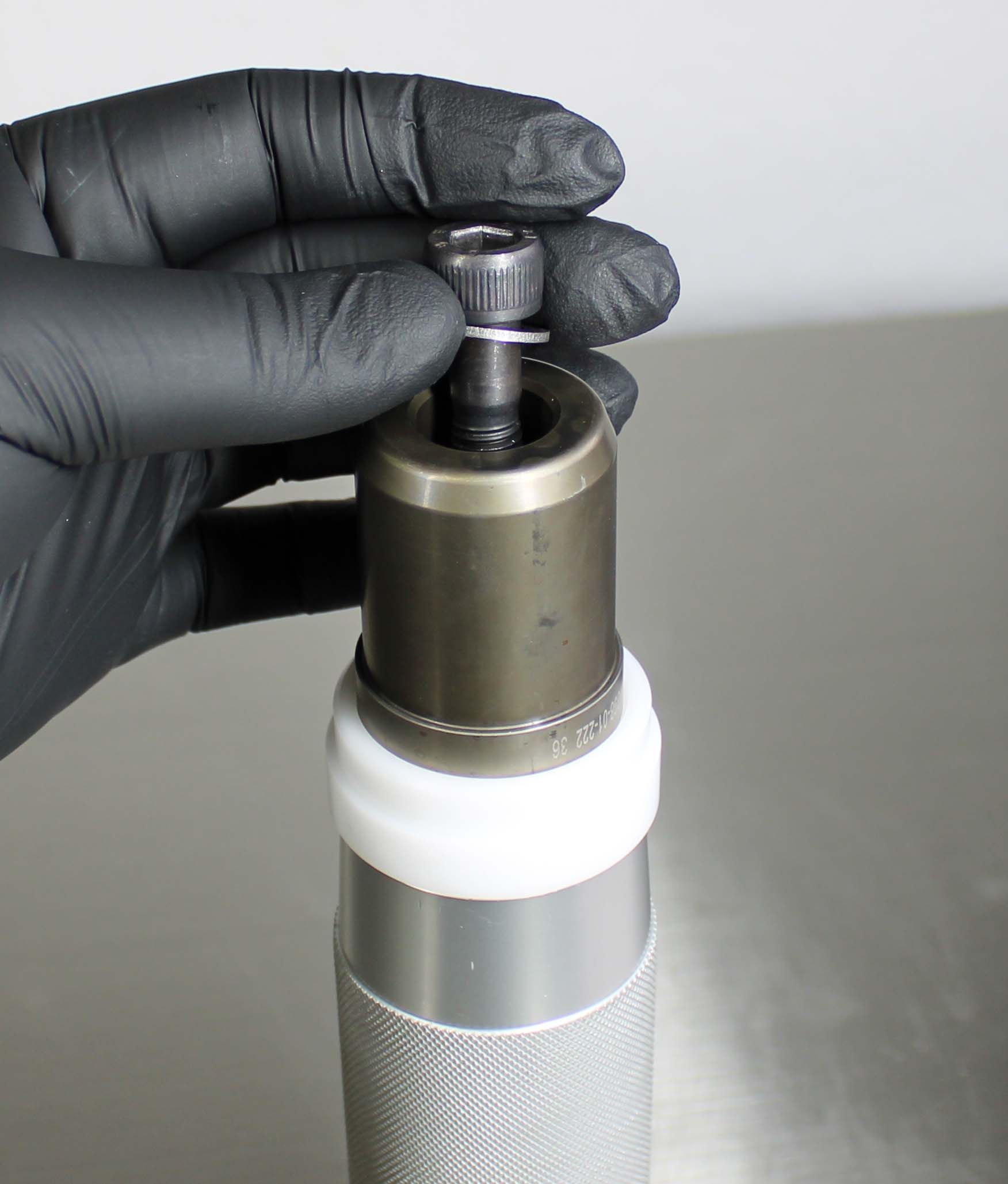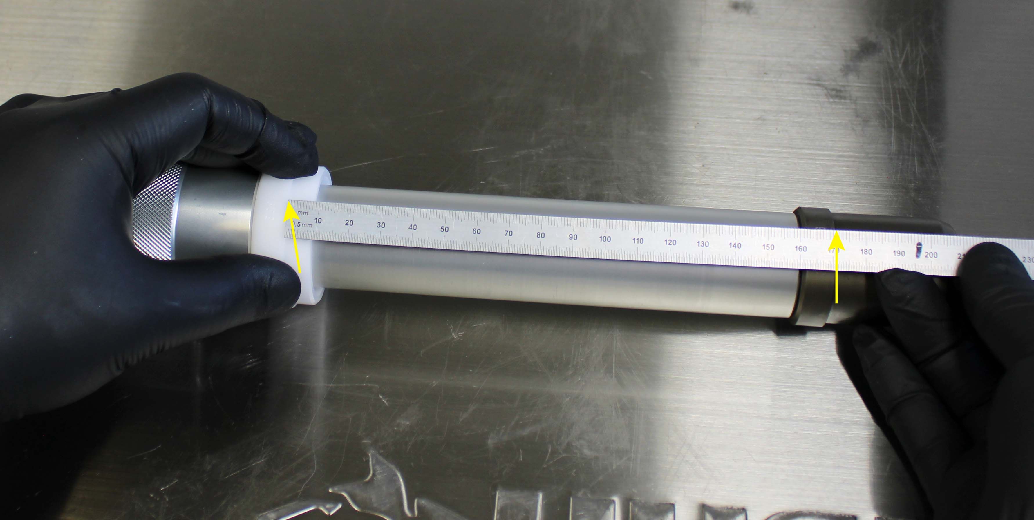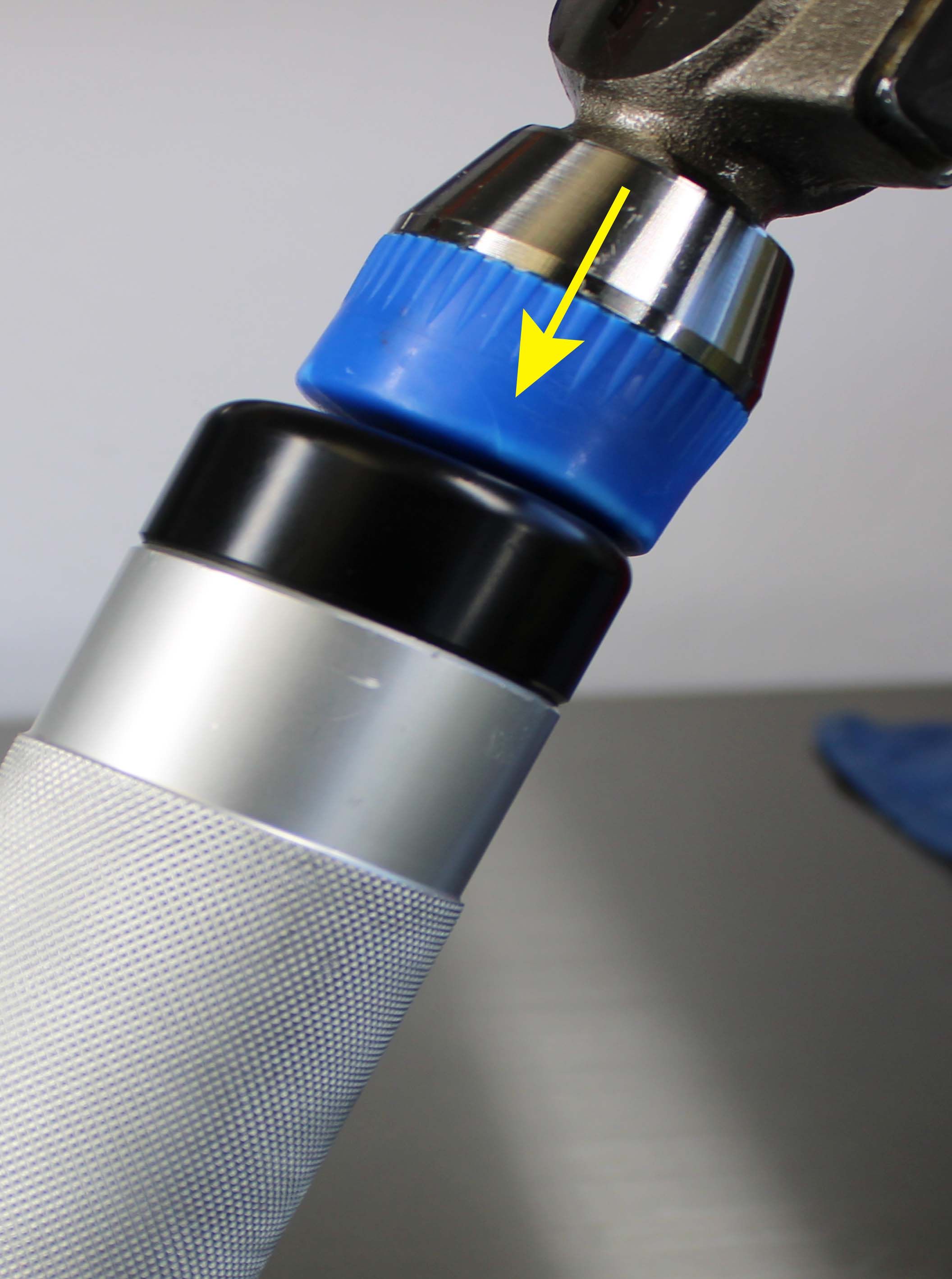 Once the Installation Tip and Guide Ring is installed, the depth can be verified by measuring from the tip of the Installation Tip to the lip of the Guide Ring. Note: All lower bushings require a depth of 15.25mm. NO SPACERS REQUIRED. Insert the Hammer Cap into the Handle. The tool is now assembled.