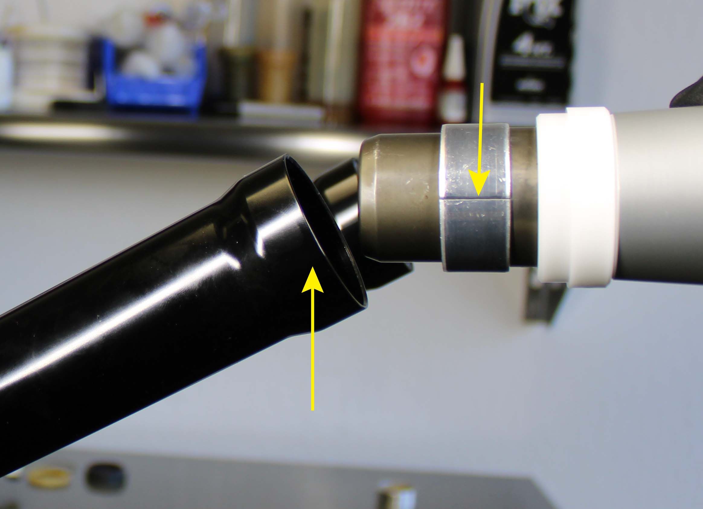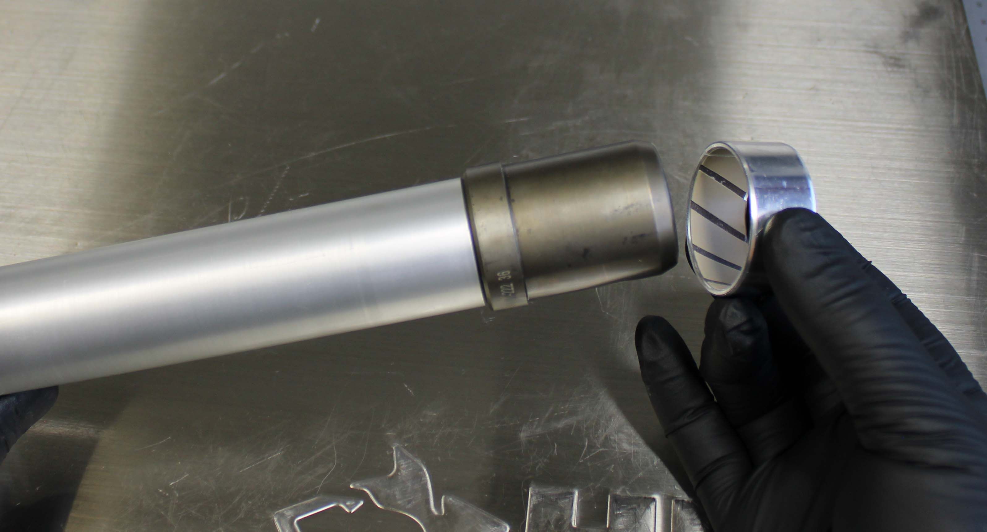 Slide the Guide Ring into the wiper bore at the top of the fork lower until the Guide RIng bottoms out on the top of the fork lower. Using a mallet, drive the bushing into the fork lower. The bushing will be at its depth once the handle of the tool makes contact with the top of the Guide Ring.