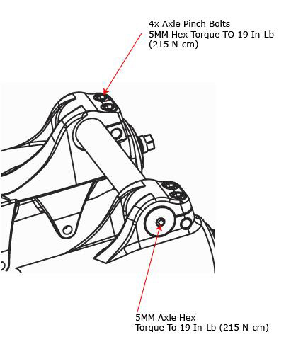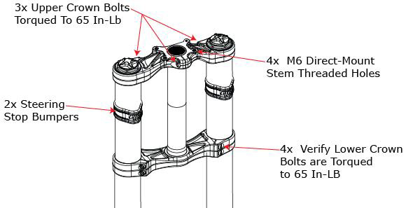 WARNING: Do not over-tighten the pinch bolts. Too much torque can damage the bolts, fracture the crown, or damage the threads. Any of these could cause fork failure leading to loss of control, resulting with SERIOUS INJURY OR DEATH.