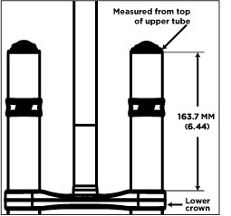 The 40 with a direct mount upper crown is assembled with the lower crown set to 163.7 mm below the top of the upper tubes (see Figure 2: 40 Crown Height). The lower crown position is set to allow 6 mm clearance between the bottom of the crown and the top of a 2.80" tire when bottomed out. Do not change the position of the lower crown.