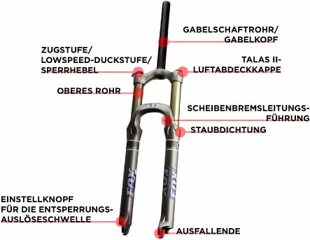 Montage der Gabel | Vor jeder Fahrt | Einstellen der Nachgiebigkeit | Einstellen der Zugstufe | Sperren der Gabel | Einstellen der Blow-Off-Auslöseschwelle | Einstellen der Lowspeed-Druckstufe | Ändern des Federwegs | Wartungsintervalle | Wichtige Sicherheitsinformationen
