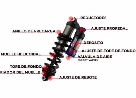 válvula de refuerzo sensible a la posición Boost Valve, ProPedal ajustable, resistencia a hacer tope ajustable, margen de ajuste ajustable a través de válvula Schrader, precarga de muelle helicoidal, ajuste de rebote |