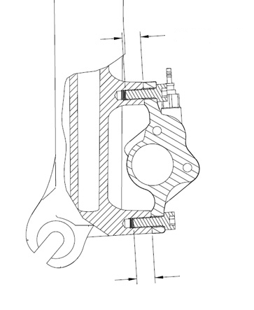 注意! 重要:ディスクブレーキ・キャリパー取り付け用ボルトは、フォークに対するネジのかみ合いが、10 ~ 12 mm になるようにしてください。また、取り付け用ボルトは、メーカーの指定するトルク値で締めてください。どのような場合であっても、ディスクブレーキ・キャリパー取り付け用ボルトを、10.2 Nm を上回るトルク値で締めることがないように注意してください。