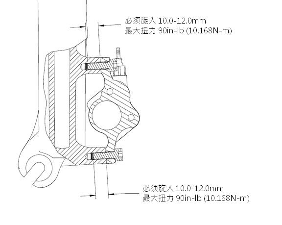 注意! 重要事项: 碟刹夹器安装螺栓必须能旋入前叉10-12mm。请确认是根据制造商的扭力规格锁紧螺栓。在任何情况下,碟刹夹器的安装螺栓的锁紧力度都不能超过90 in-lb。
