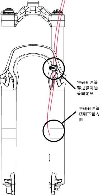 安装、引导及检查所有管线或油管是否已固定到前叉下管上,并在前叉压缩时不会自由移动。建议安装新的碟刹刹车皮以确保刹车皮的位置正确。请先在平地上测试刹车器运作正常。