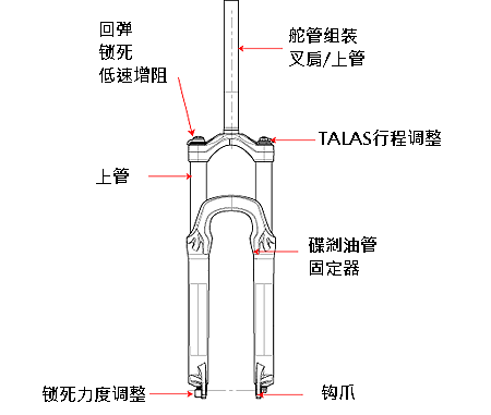 注释: 在启动锁死后,前叉可能需要一两个压缩伸长循环后才能锁死。当达到完全锁死,前叉仍能够有 3 – 5 mm的压缩。这是正常的,并不会影响性能。
